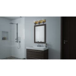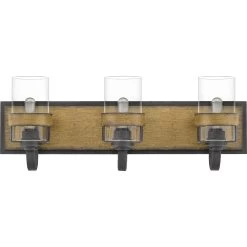 The rustic farmhouse style of the Finch collection will make a statement in any bathroom. The Aged Walnut finish is complemented by Grey Ash hardware to create a handsome aesthetic. Clear cylinder glass shades allow for maximum illumination during your morning routine.