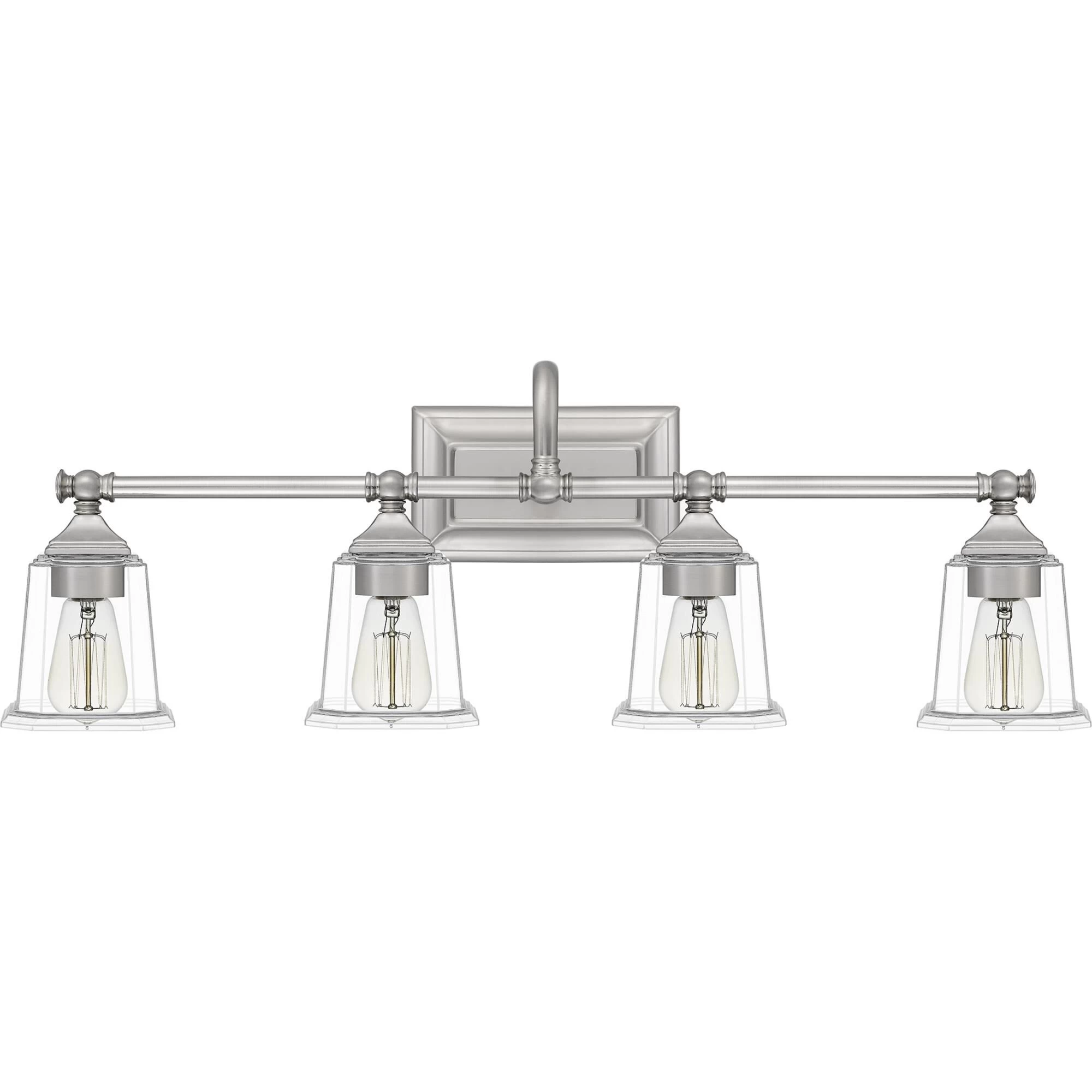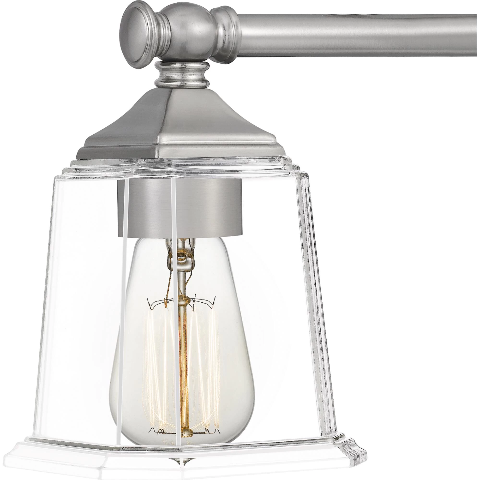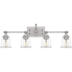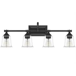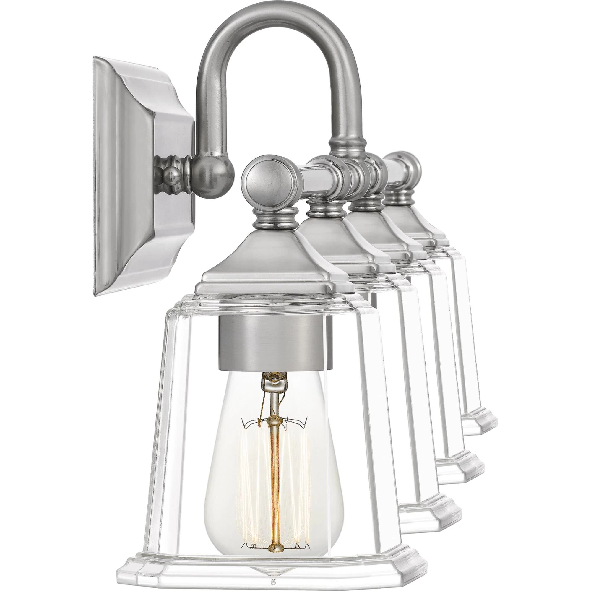 The Nicholas collection gives a solid nod to mid century style. The streamlined silhouette is finished in Brushed Nickel, Polished Chrome, or Earth Black to compliment a variety of home styles. The squared shape of the clear glass shades gives this design an edge and it is complemented beautifully by the rectangular backplate. All bath fixtures can be mounted as uplights or downlights and are offered in several sizes.