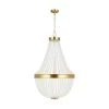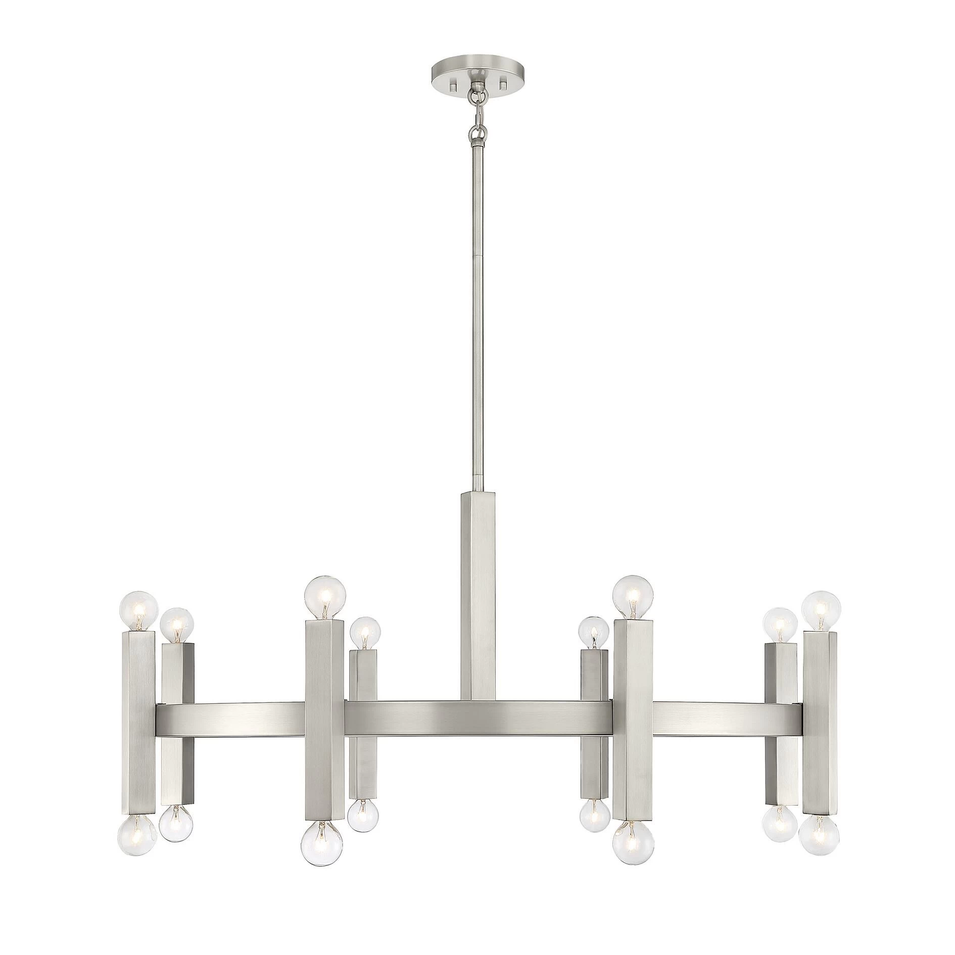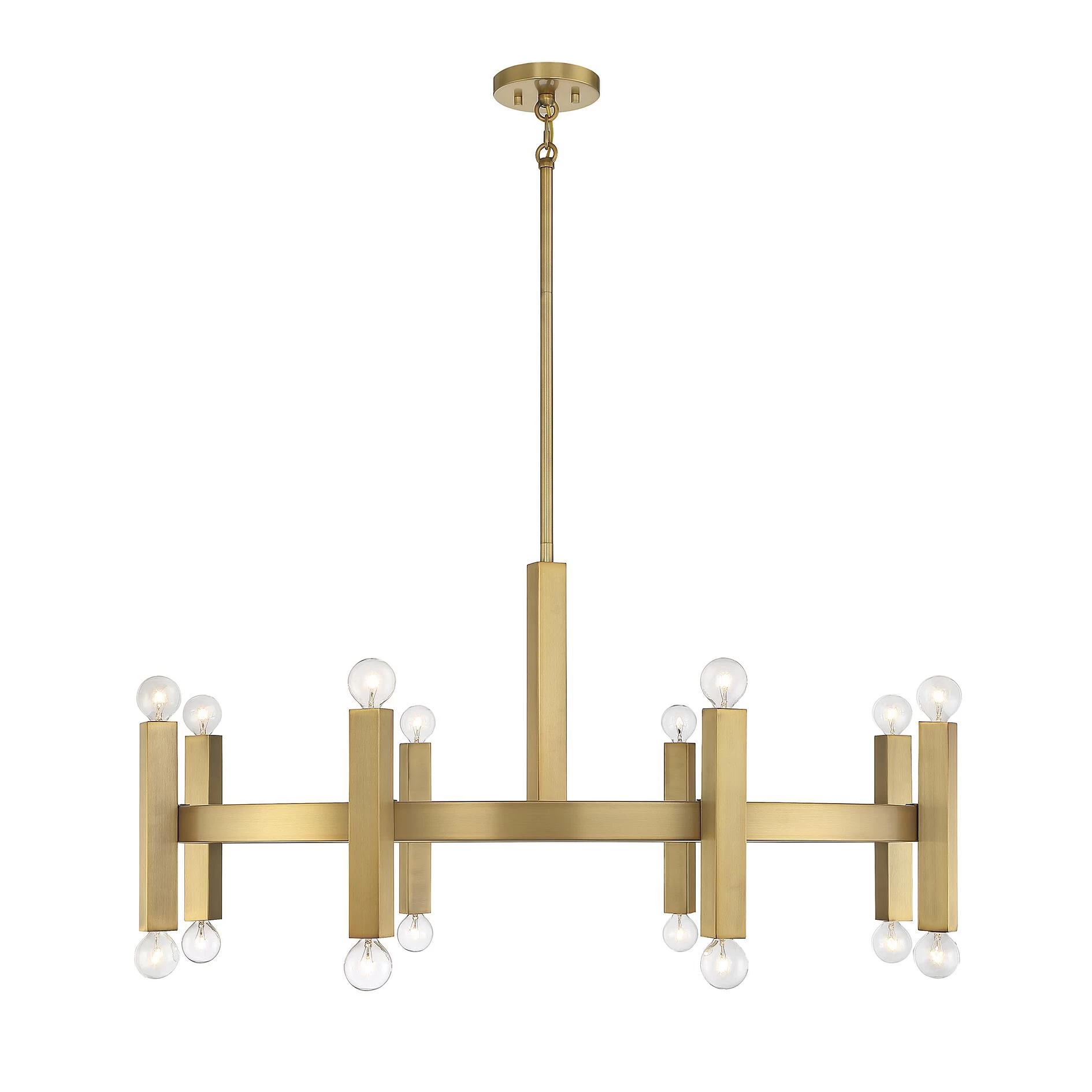 Large in both scale and style, this 16-light chandelier has a streamlined and contemporary look with vertical bars on a circular frame. Finished in natural brass. 20 Inch height and 40.50 Inch width. Max height 74 Inch. Max 60 watts per bulb, candelabra size C11 bulbs recommended. LED bulb compatible. Supplied with four 12 Inch rods and one 6 Inch rod.