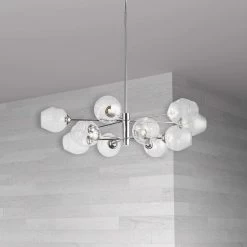 The eye-catching contrast of glass globes and sleek straight lines form the basis of the ABII family of lighting fixtures. It’s a versatile and adaptable design with options ranging from a single sconce to a large pendant light in a look that can work with virtually any room or design scheme. The metal base and arms create a pattern to showcase the reflective effects of the glass globes. Colorway options include complementary finishes from warm to stylishly dramatic. Halogen lights add a warm glow. From ultra-modern minimalism to mid-century and even more traditional dcors, the ABII family of lightings transitional design is both luxurious and timeless in its appeal.