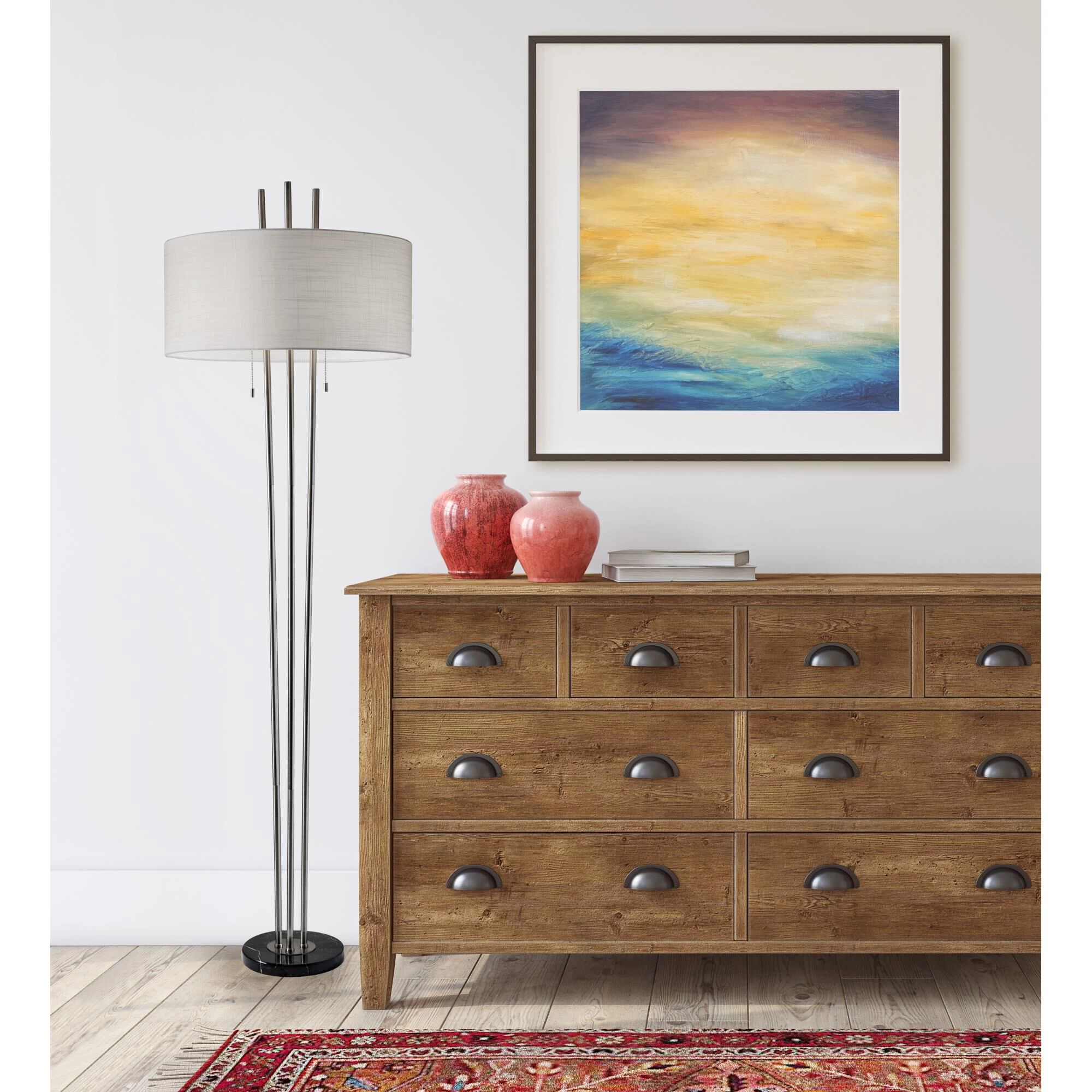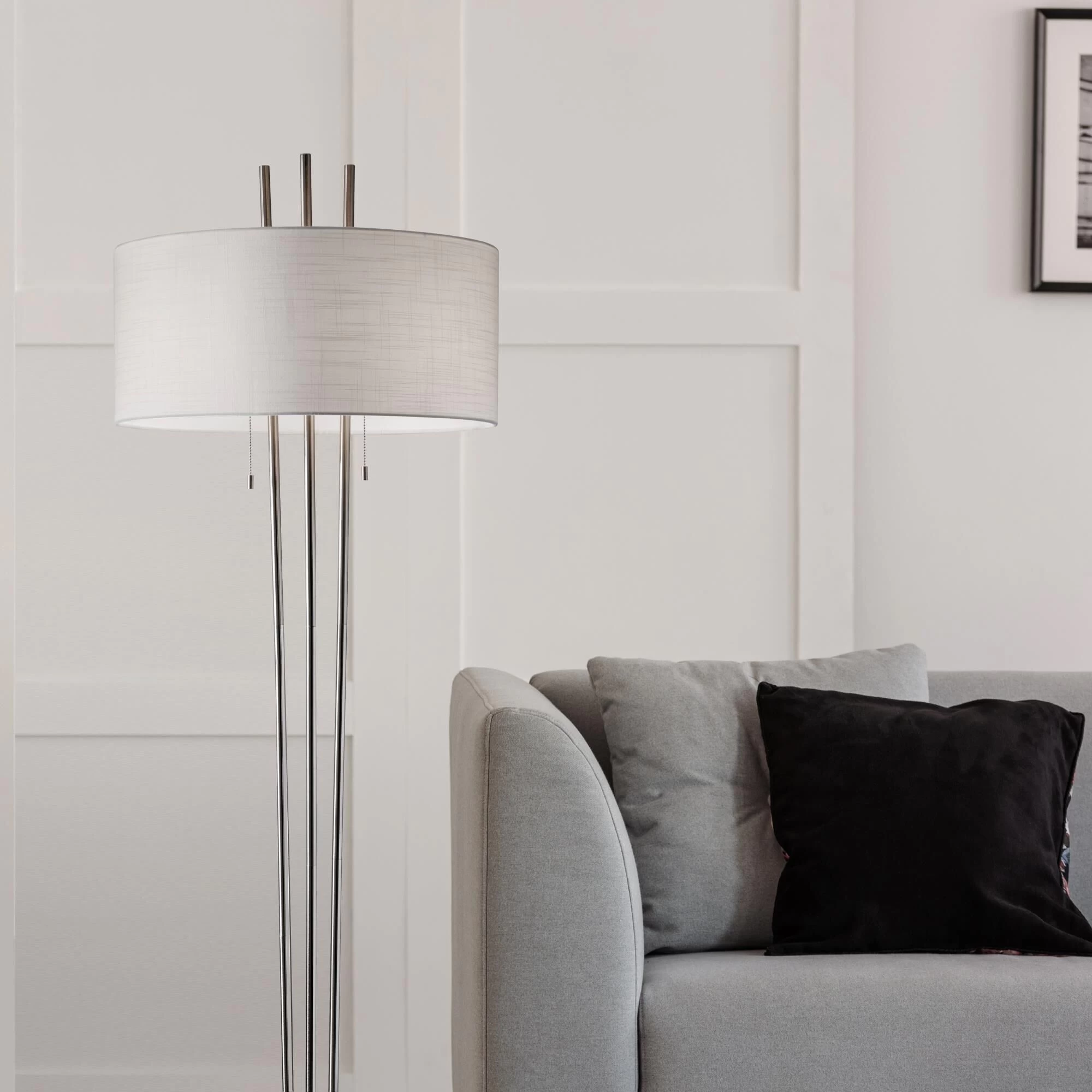 Three brushed steel poles extend through a beautifully textured white fabric shade creating the unique yet elegant silhouette of the Anderson Floor Lamp. A double socket holds two 100 Watt bulbs that can be turned on and off with double pull chain switches. A black marble base adds a decorative accent to the simple style.