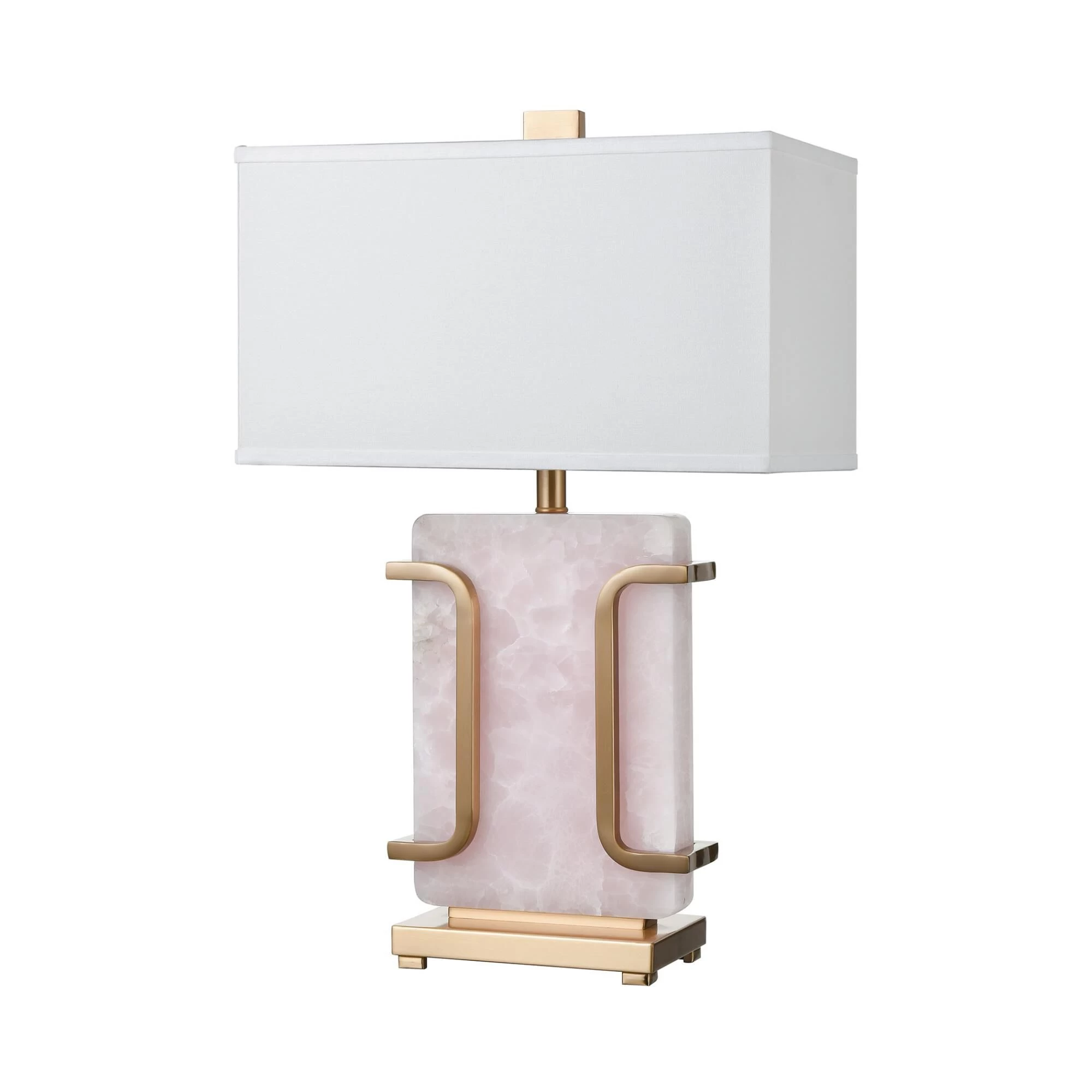 The Archean table lamp in rose quartz combines the natural pale pink of this beautiful stone with the warm lux of cafe bronze metalwork. This piece is topped with a wide rectangular shade in white hardback fabric. A grey marble design is also available in the Archean lighting collection.