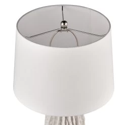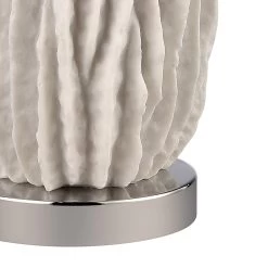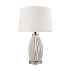 The Beacher Table Lamp has a rounded sculptural body made from raw resin with an acrylic base. Vertical ridges resemble rippled white sea coral, for a look that is organic and coastal-inspired. A round white linen shade completes the look.