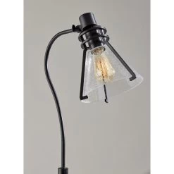 Defined by elegant lines and a blend of modern and vintage styling, the 60.25 tall Beckett floor lamp adds a polished look to any space. It features a 10 diameter round metal base in black finish supporting a matching tube-shaped arcing stem. The metal shade frame in black finish consists of three arms that secure an inverted cone-shaped shade of clear, seeded glass. For a distinctive vintage look, the 5.5 high and 7.25 diameter clear shade leaves the included 60W Edison bulb visible. For adjustable lighting, the lamp has an articulation point at the base of the shade, allowing you to direct the light wherever it’s needed. Operated by a rotary switch located on the stem to easily turn it on or off, the floor lamp also features a 78 black cord. Complete your space’s look with the coordinating Beckett desk lamp, wall lamp, and pendant lighting.
