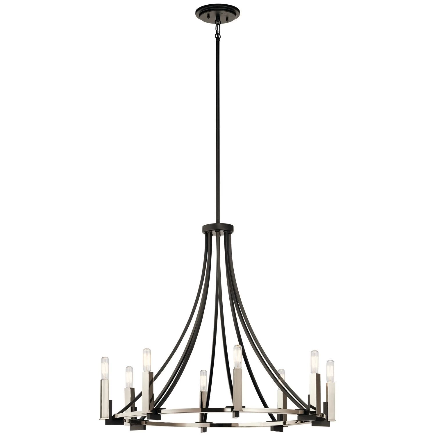 This 8 light chandelier from the Bensimone collection features uniquely squared socket design blends beautifully with a variety of modern decorating trends, from elongated tables to geometric seating. The Black and Polished Nickel two-tone finish adds to the versatility, working well in rooms with a variety of hardware finishes.