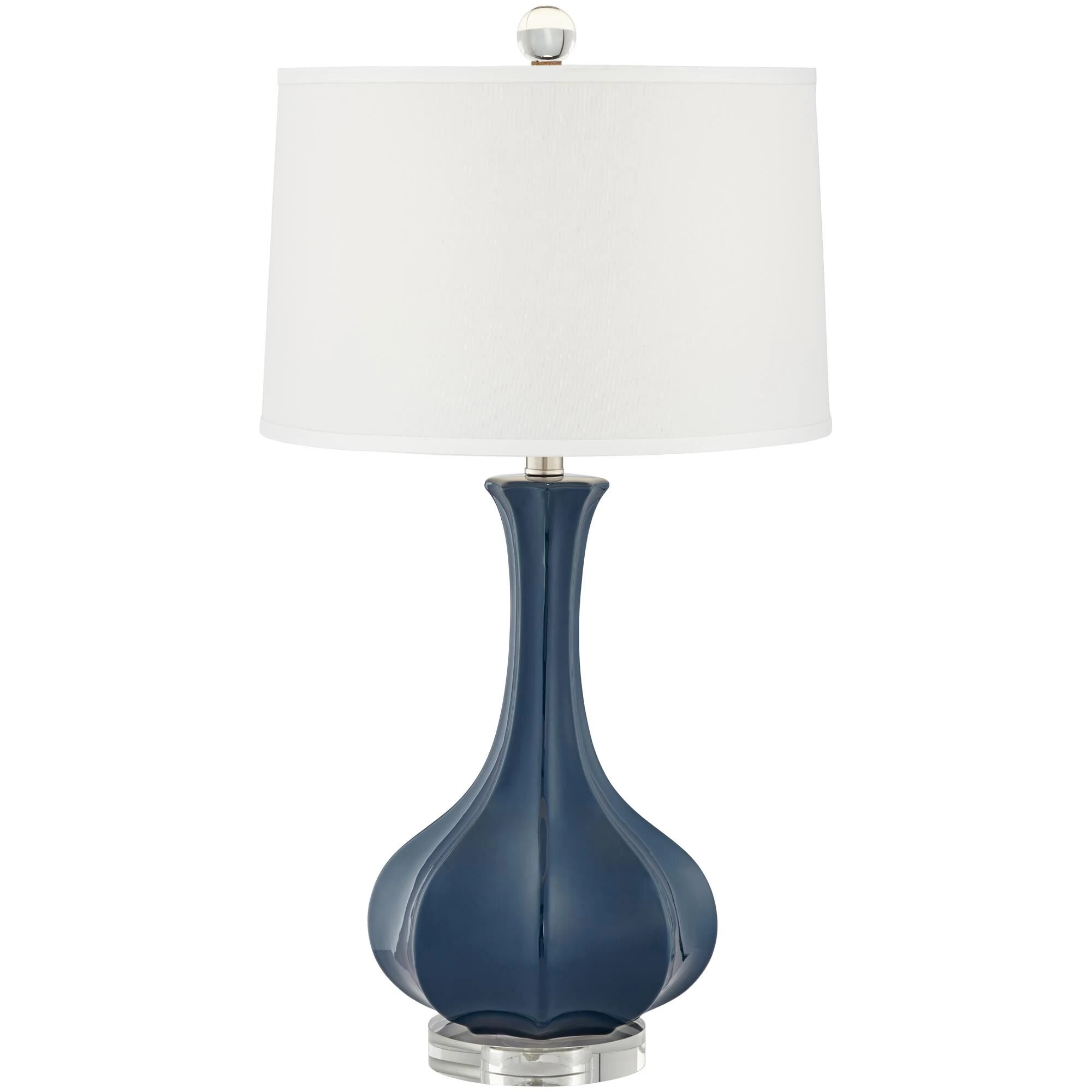Adding a pop of color can be challenging with other home furnishings but is easy to do with this contemporary blue table lamp. The ceramic base has concaved details and sits on top of a crystal foot. This lamp is then finished with a white linen drum shade.