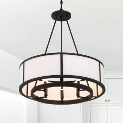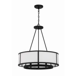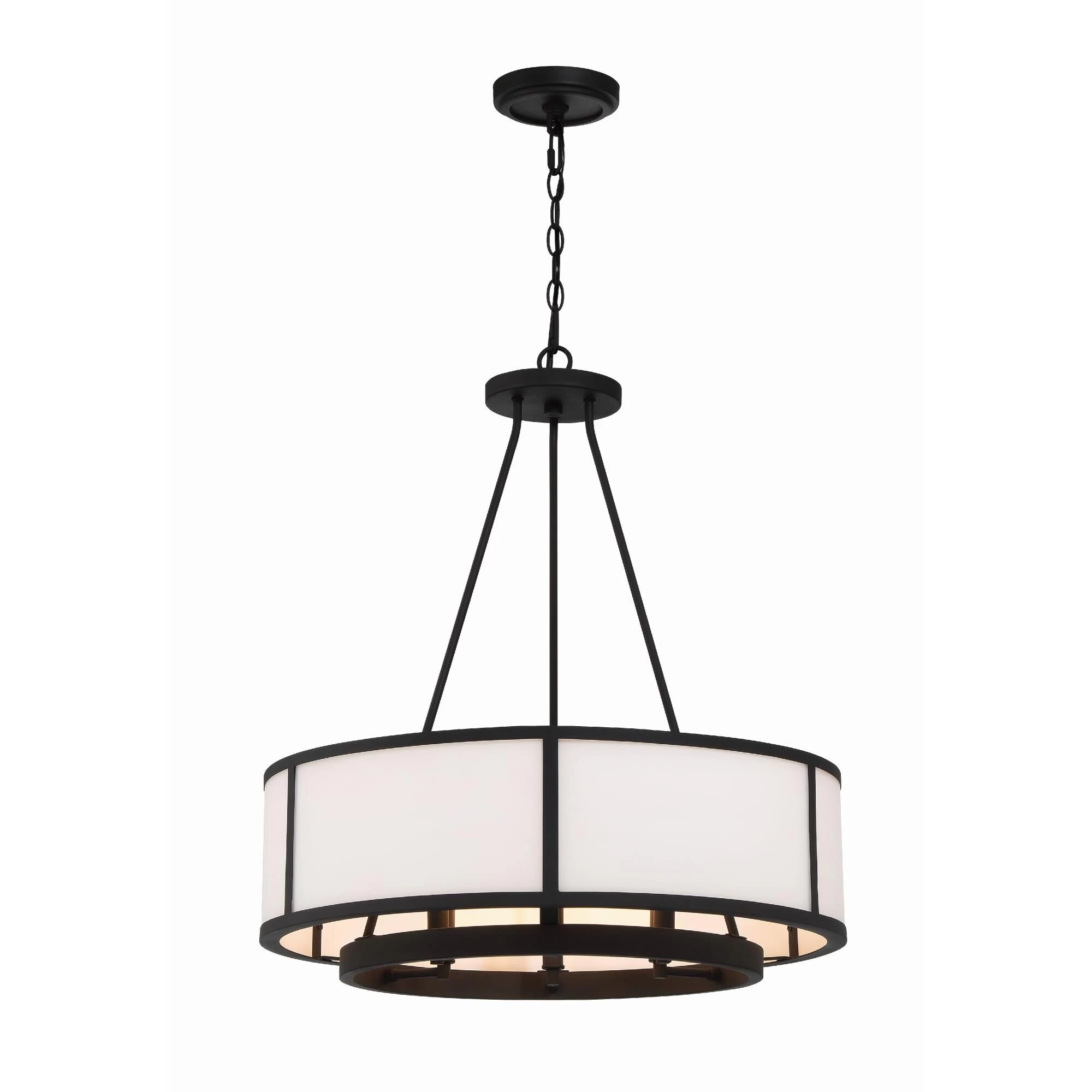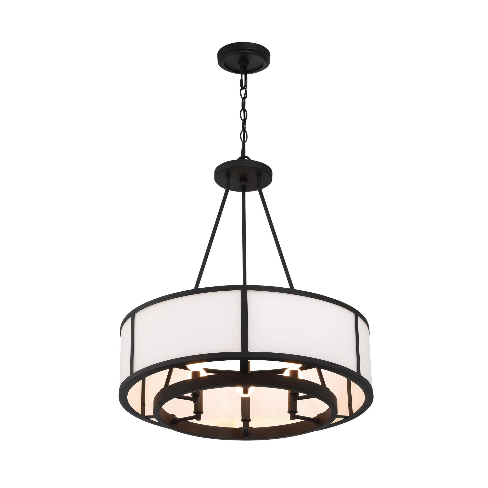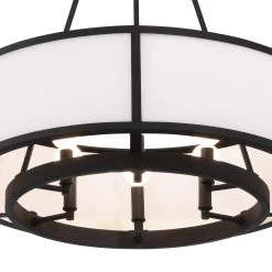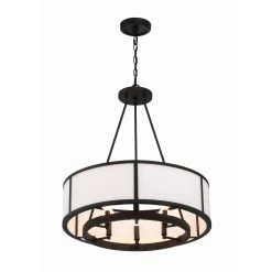 Showcasing a classic drum pendant, the Bryant is crafted with a white silk shade and black steel frame. The outer drum surrounds an inner suspension of candelabra sockets. The contrasting materials and bold graphic lines provide a design-driven style and a striking visual accent to many interior settings