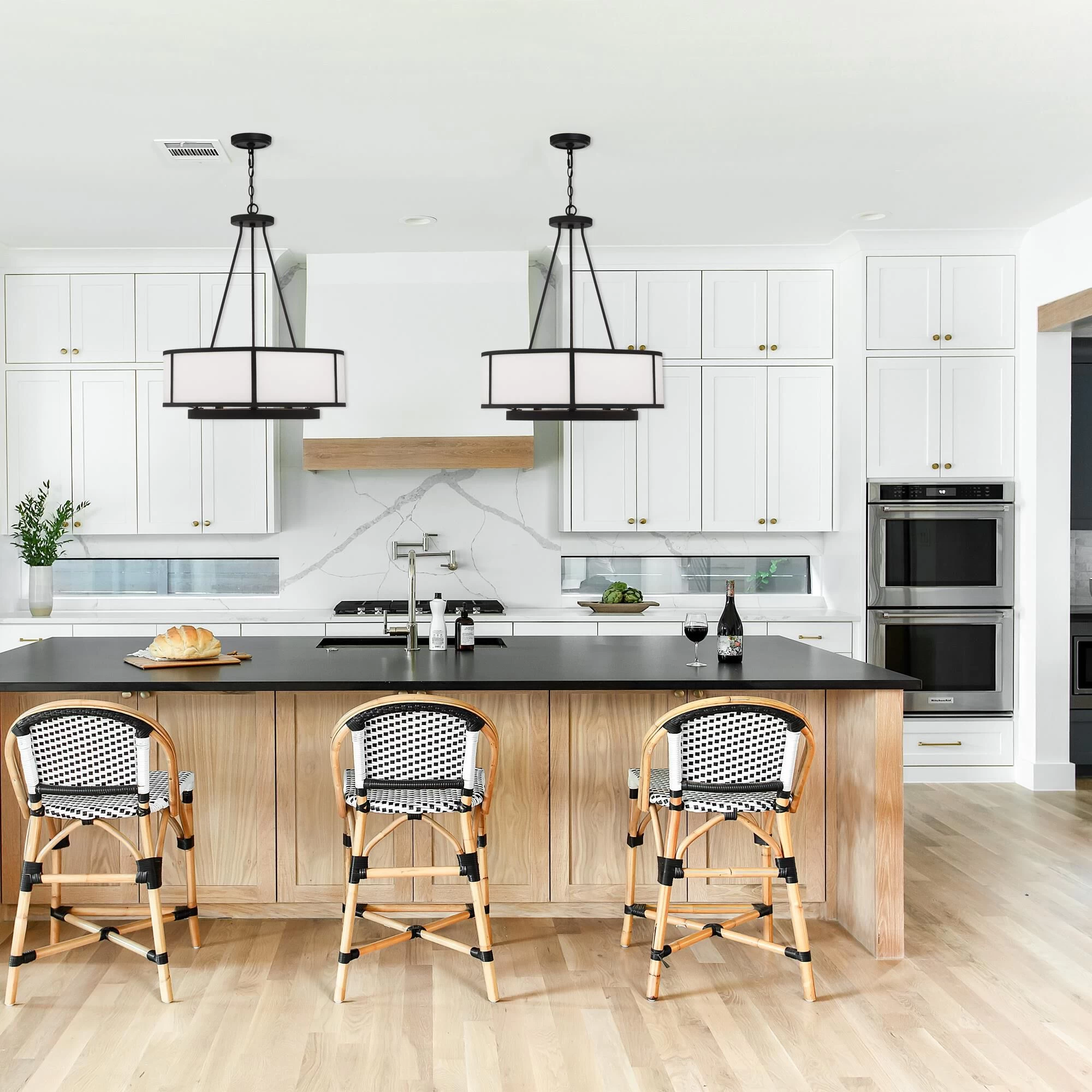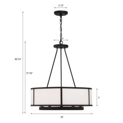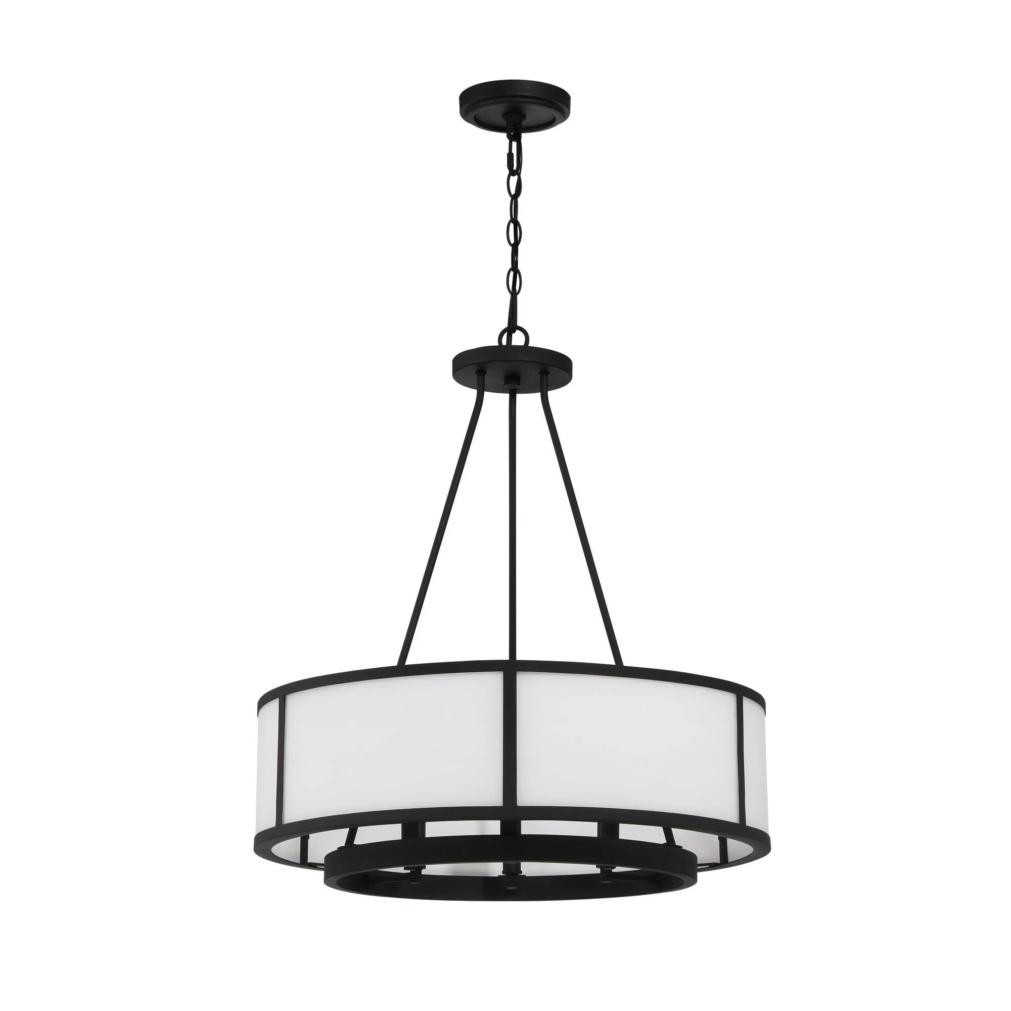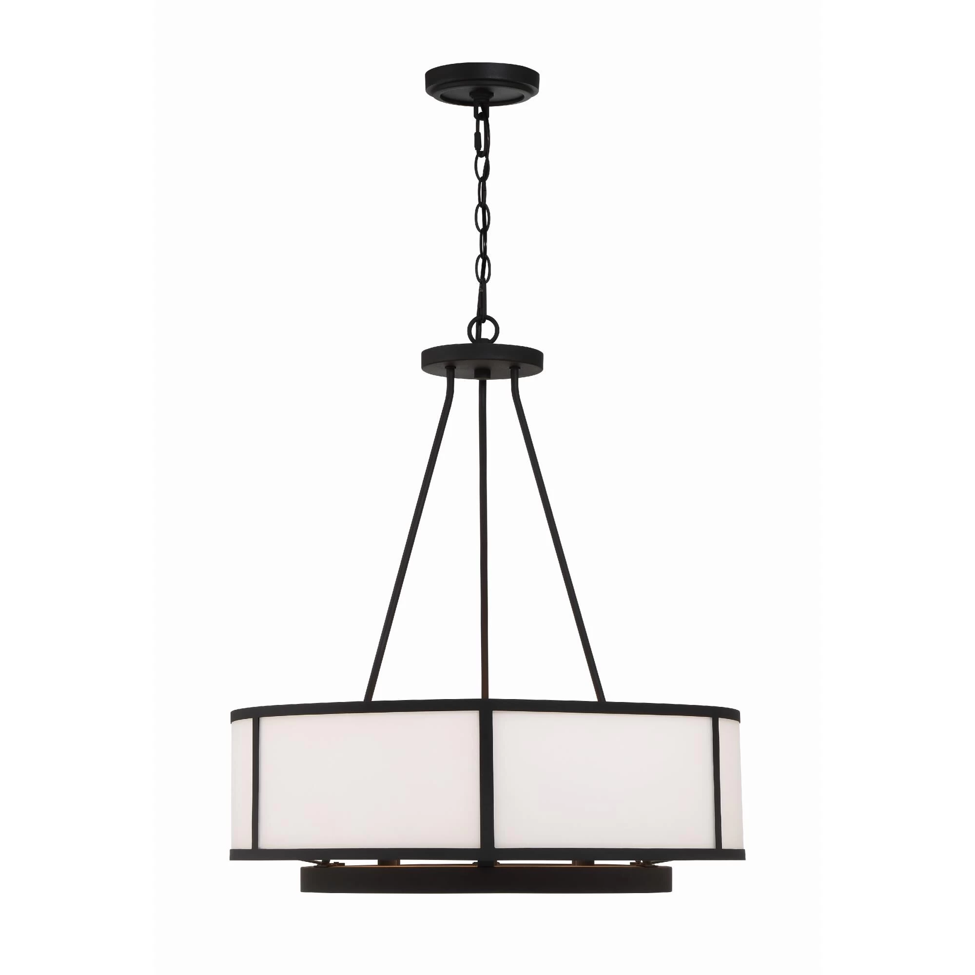 Showcasing a classic drum pendant, the Bryant is crafted with a white silk shade and black steel frame. The outer drum surrounds an inner suspension of candelabra sockets. The contrasting materials and bold graphic lines provide a design-driven style and a striking visual accent to many interior settings