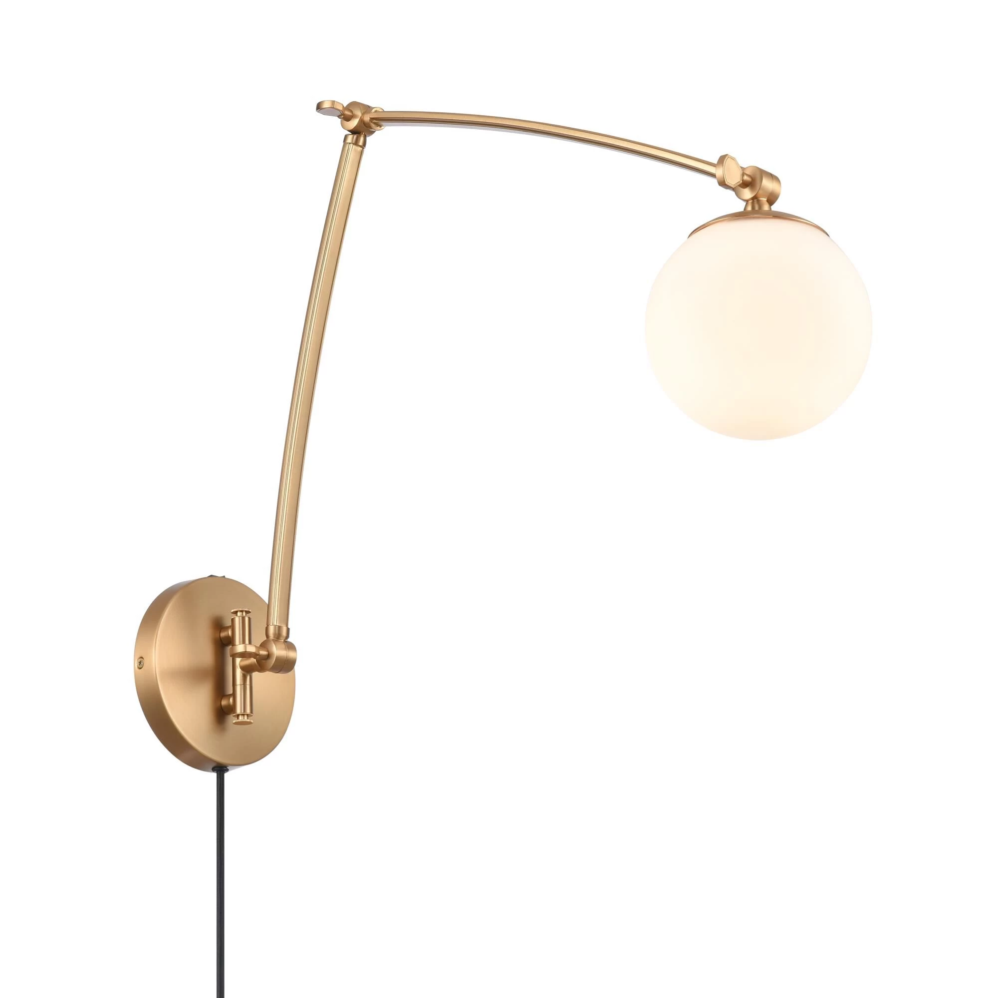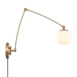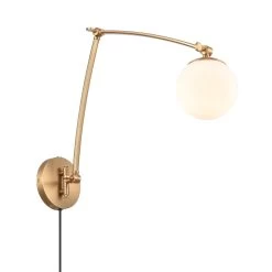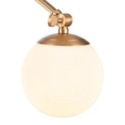 The Caroline collection features etched opal white glass shades, which are cupped by complimenting die-cast brushed gold metal holders and supported by curling metalwork and detailed tubing.