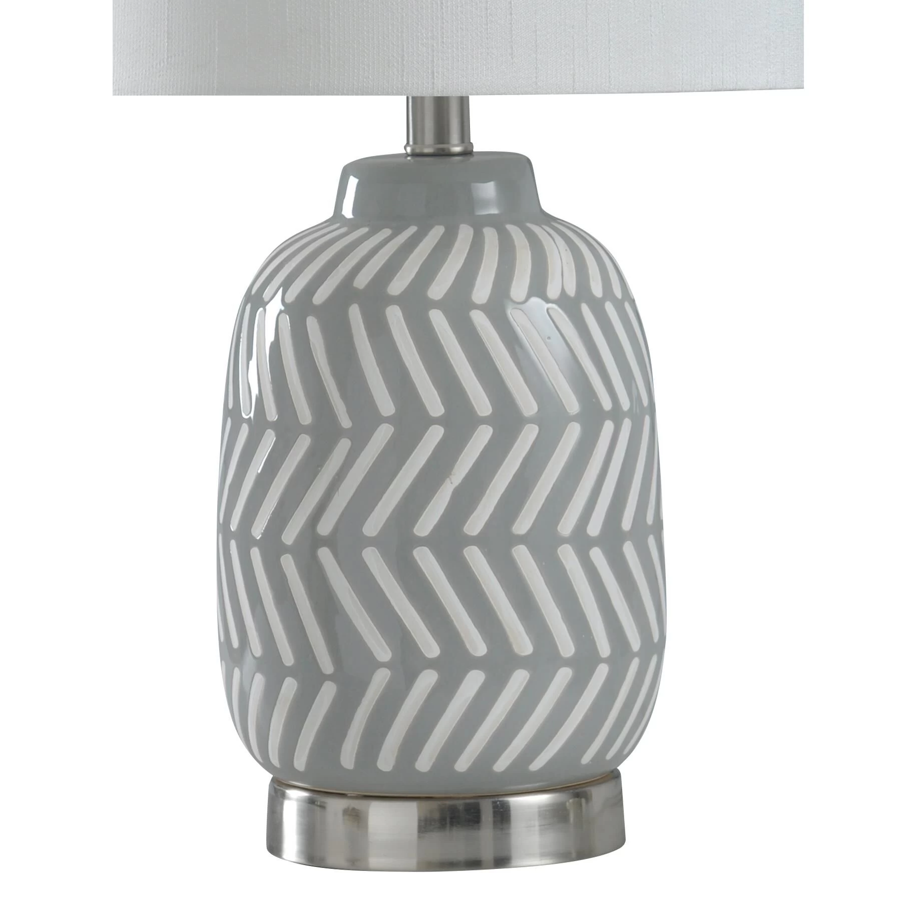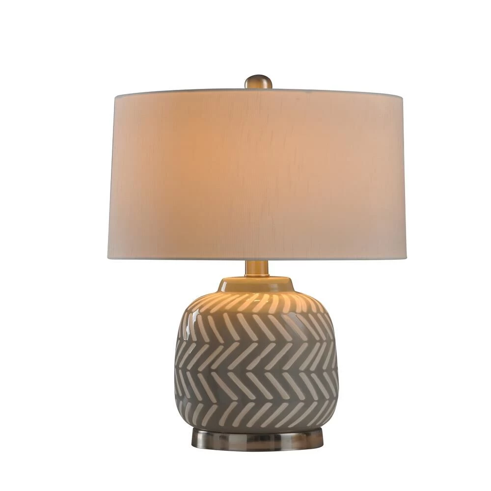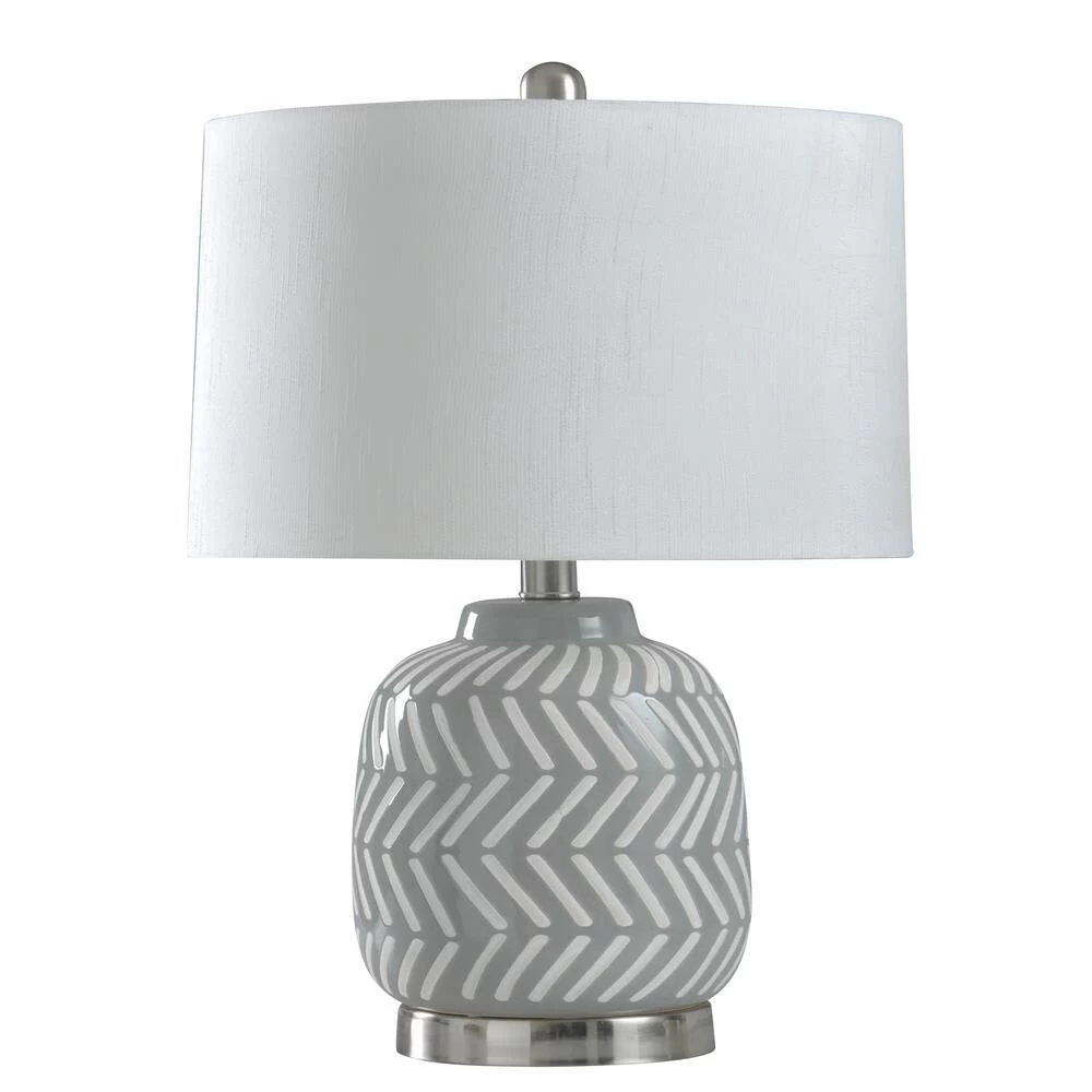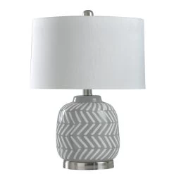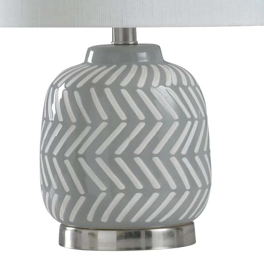 Brighten up your most intimate indoor spaces with the Ceramic and Metal Table Lamp. This energy-efficient table lamp sports a crisp gray and white herringbone design, allowing it to blend seamlessly within a modern design scheme. This casual indoor table lamp is a great option for a bedroom, hallway or living room setting.FeaturesBrushed nickel finish hardware and turn knobThis lamp features a gray and white herringbone design on the body and a metal finished base.This design style is casual and while also being modern due to the style and coloring.Lamp Base: 5.5″Dia x 1″H