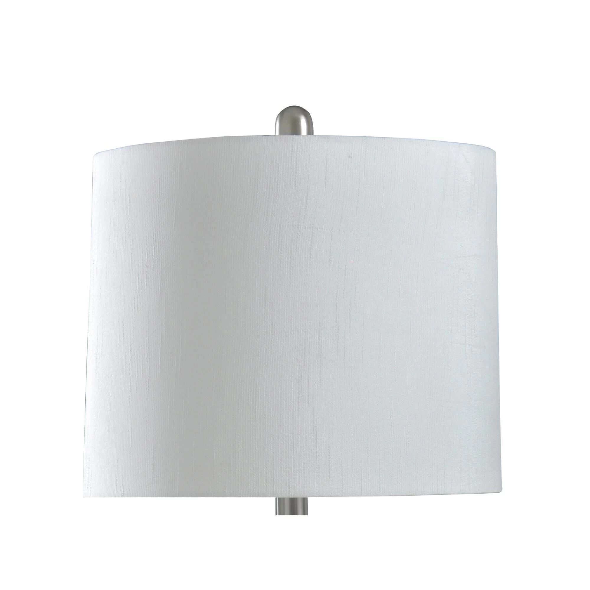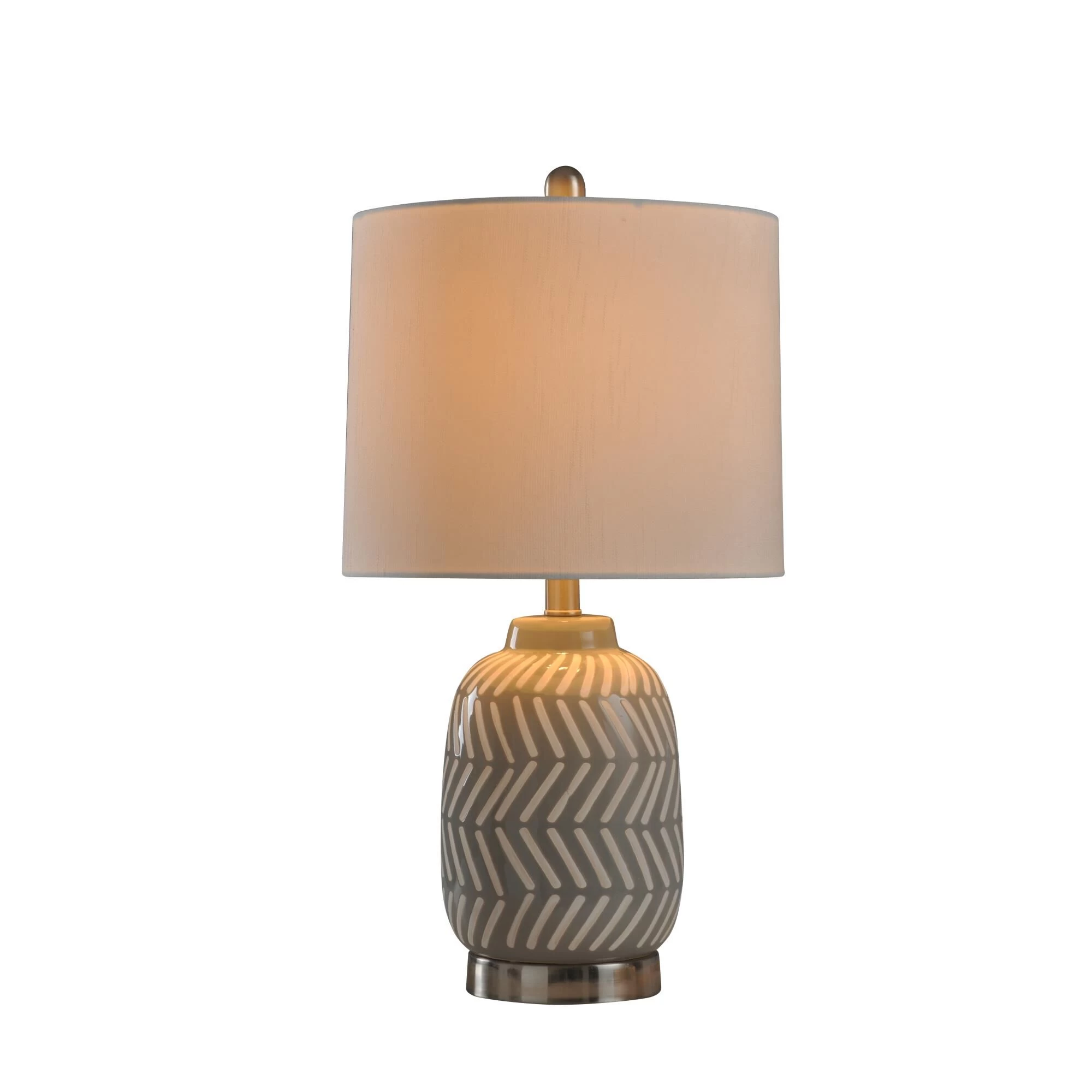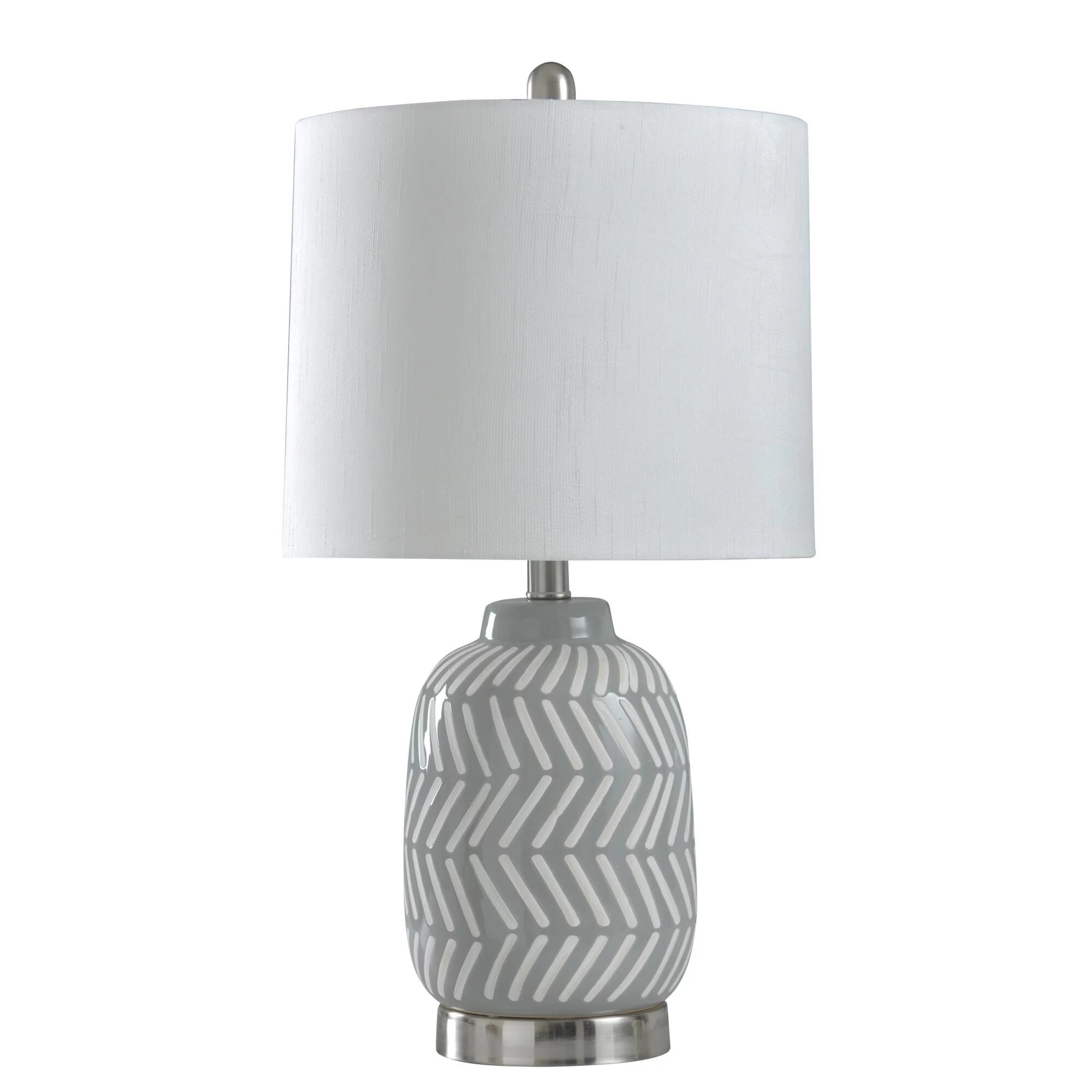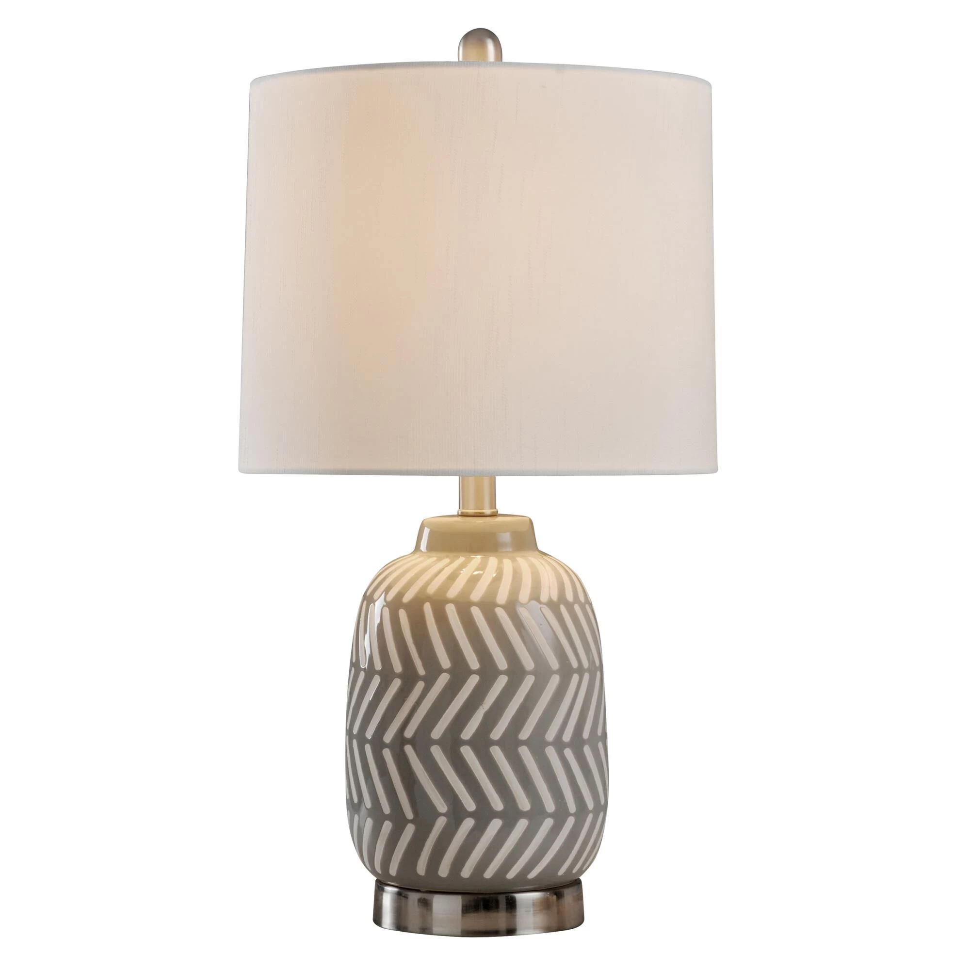 Brighten up your most intimate indoor spaces with the Ceramic and Metal Table Lamp. This energy-efficient table lamp sports a crisp gray and white herringbone design, allowing it to blend seamlessly within a modern design scheme. This casual indoor table lamp is a great option for a bedroom, hallway or living room setting.FeaturesBrushed nickel finish hardware and turn knobThis lamp features a gray and white herringbone design on the body and a metal finished base.This design style is casual and while also being modern due to the style and coloring.Lamp Base: 5.5″Dia x 1″H