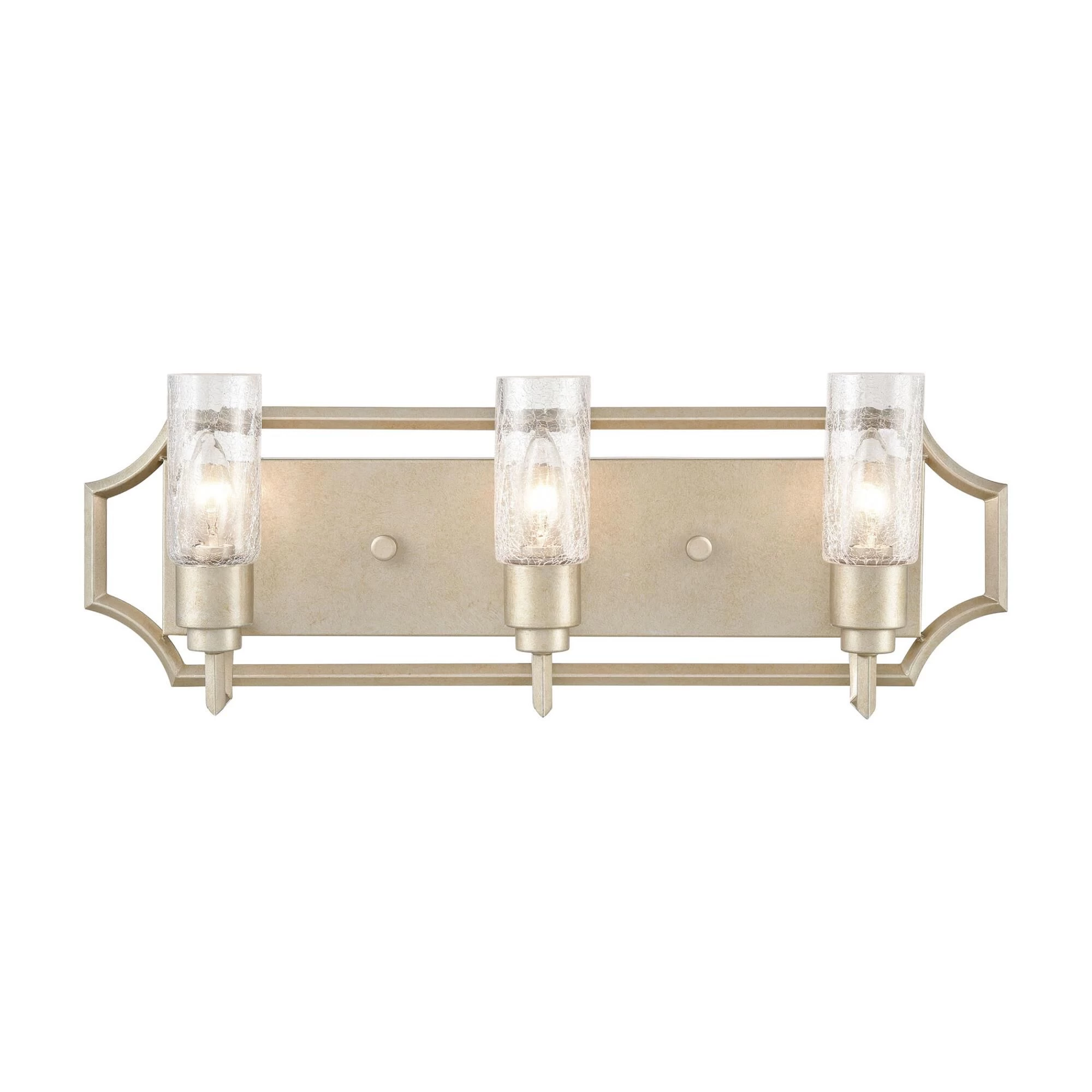 The Cheswick 3-Light Vanity Showcases Crackled Glass Cylinders Arranged Within A Geometric Framework. The Crackled Glass Diffuses The Light Which Is Softened Further By The Aged Silver Finish.