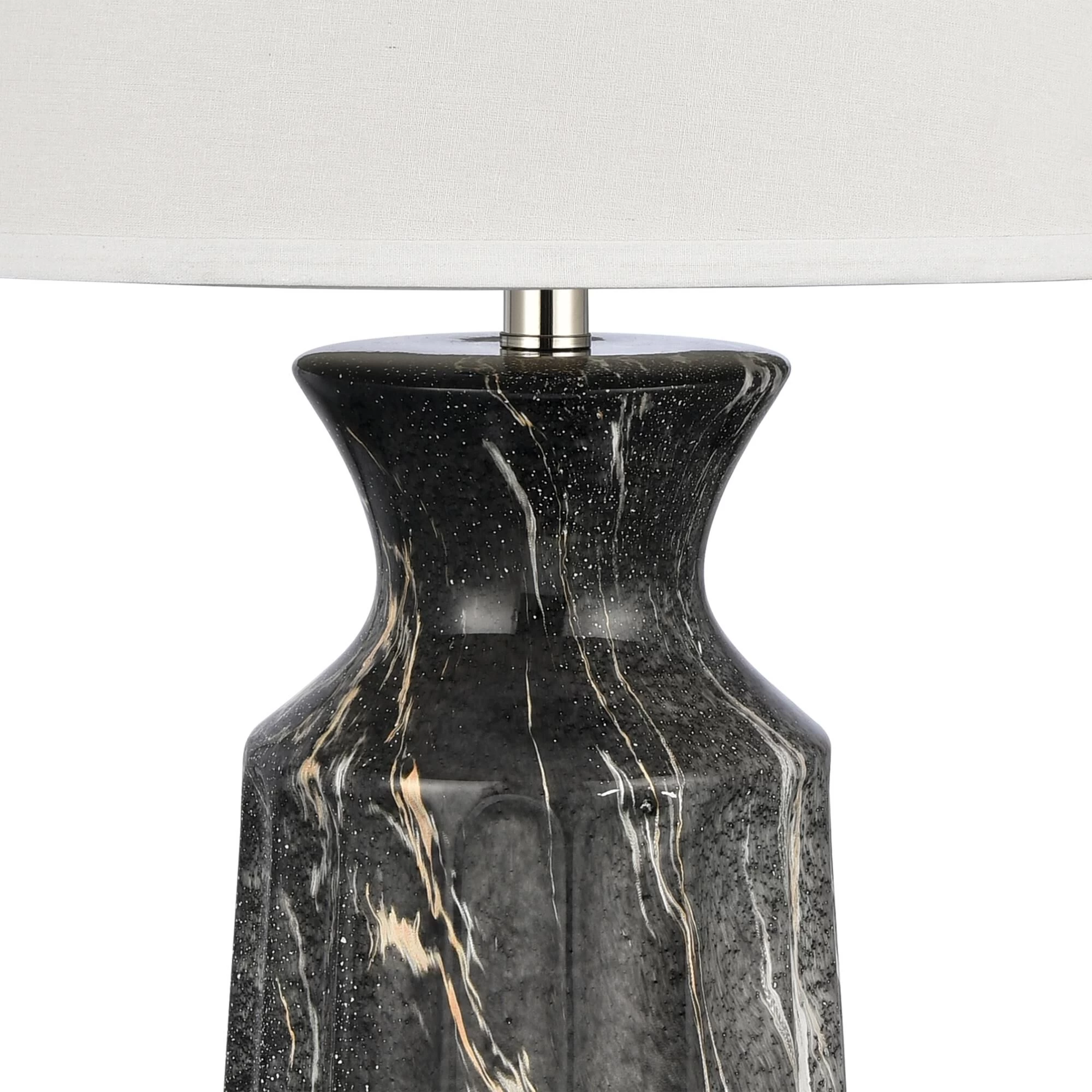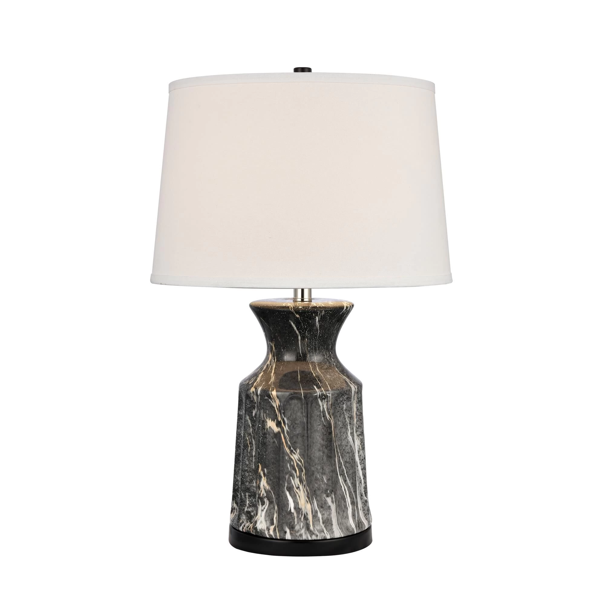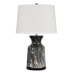 The Cochrane Gardens Table Lamp adds instant contemporary style glam to a living room or bedroom. Made from earthenware, this piece features a striking, black faux marble finish that works with its classic, vase shaped body to cut a bold silhouette. Its chic look is completed by a round, hardback shade in crisp, white linen.
