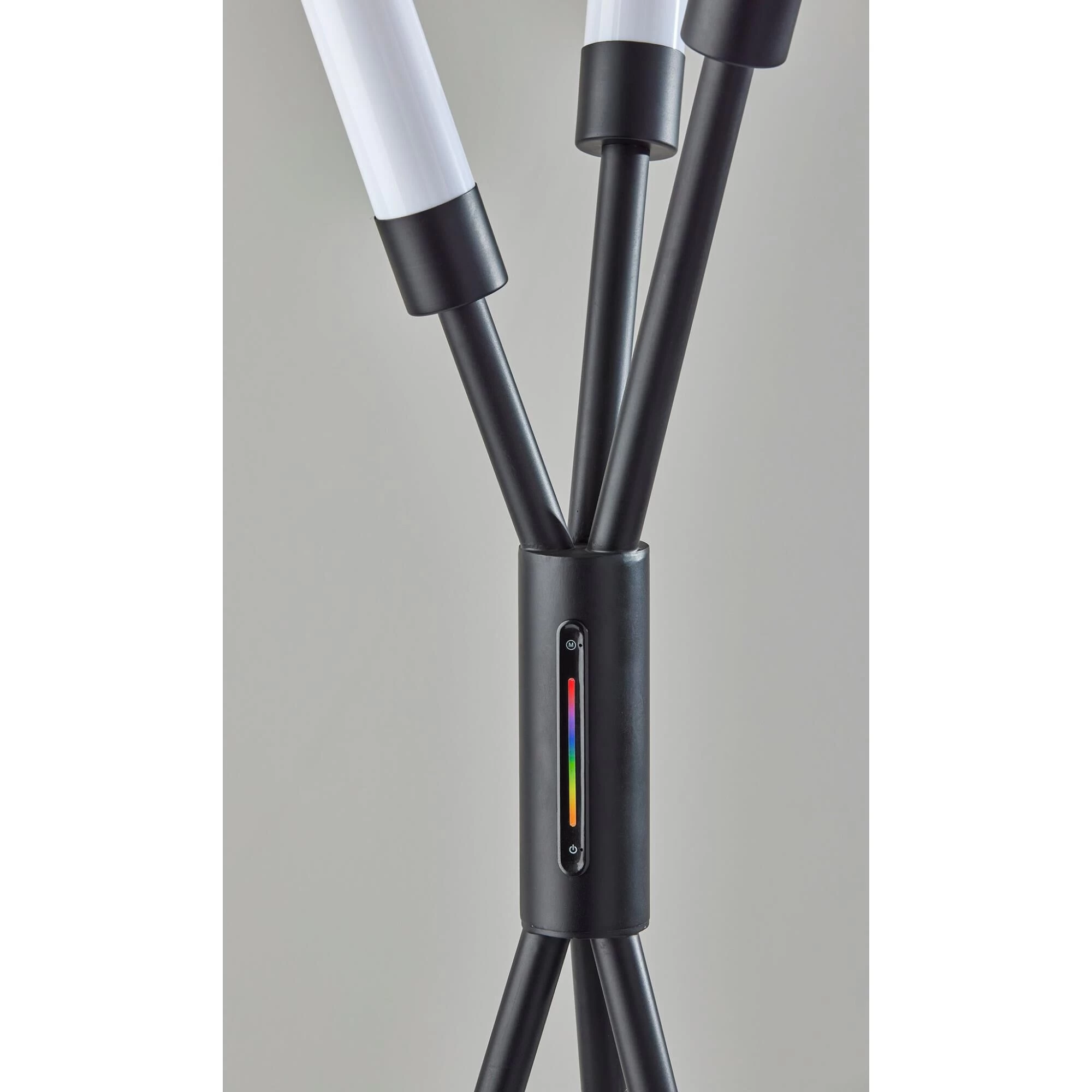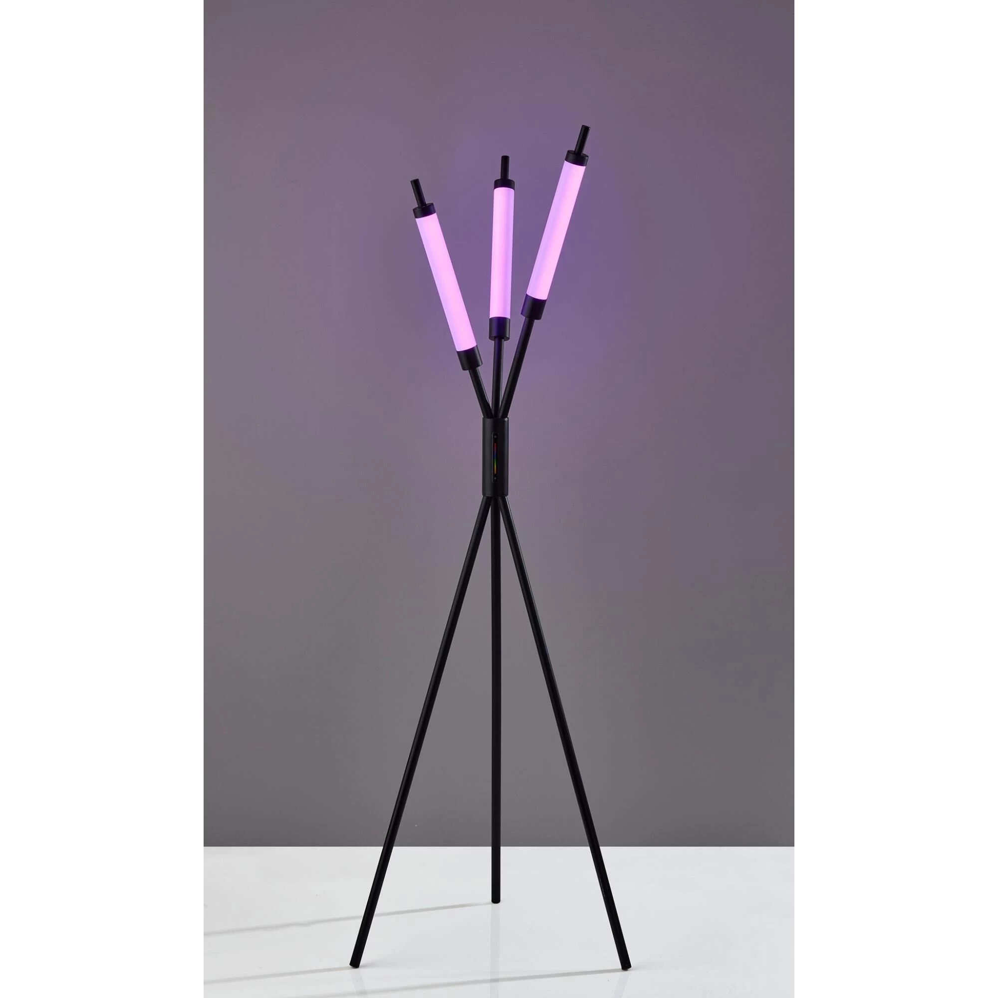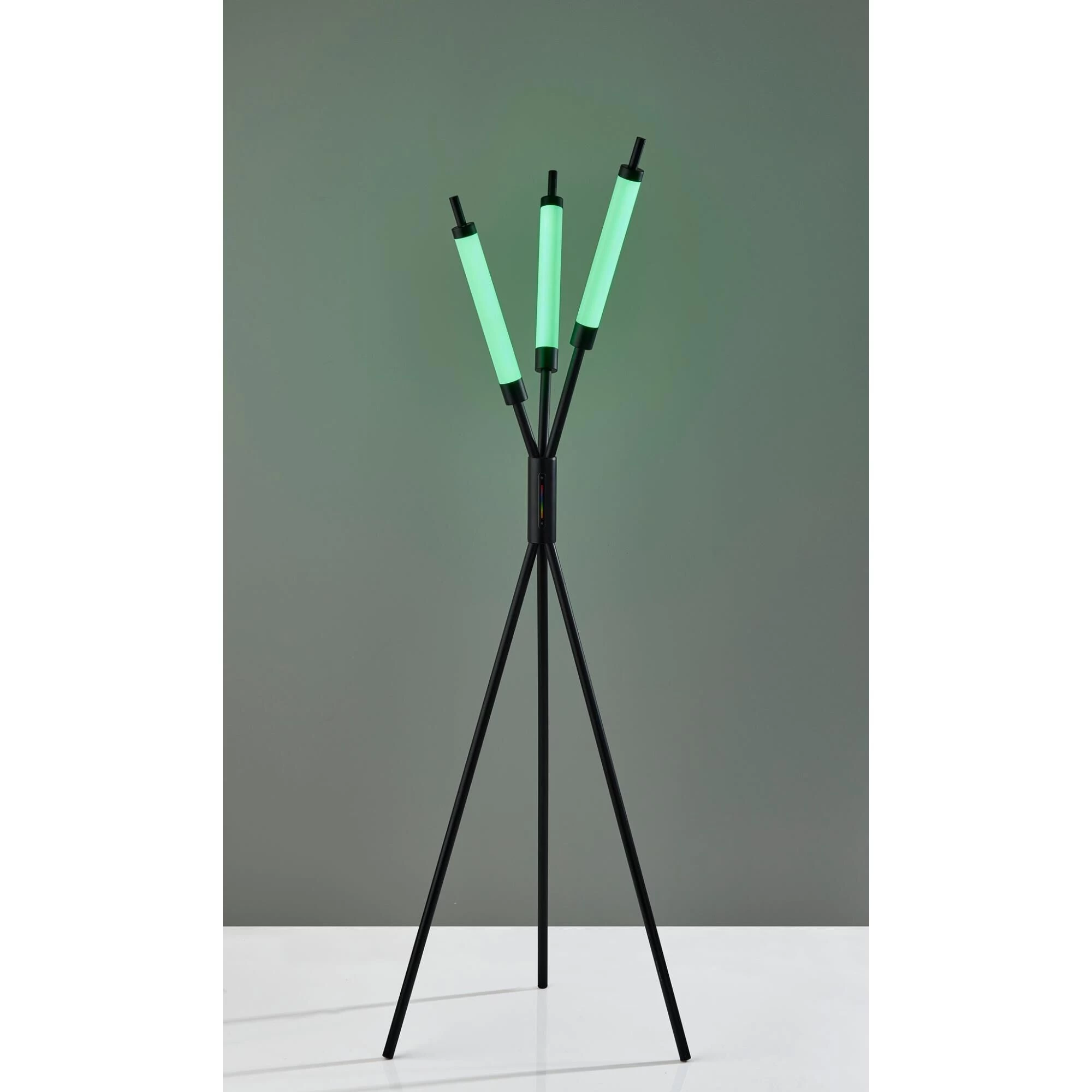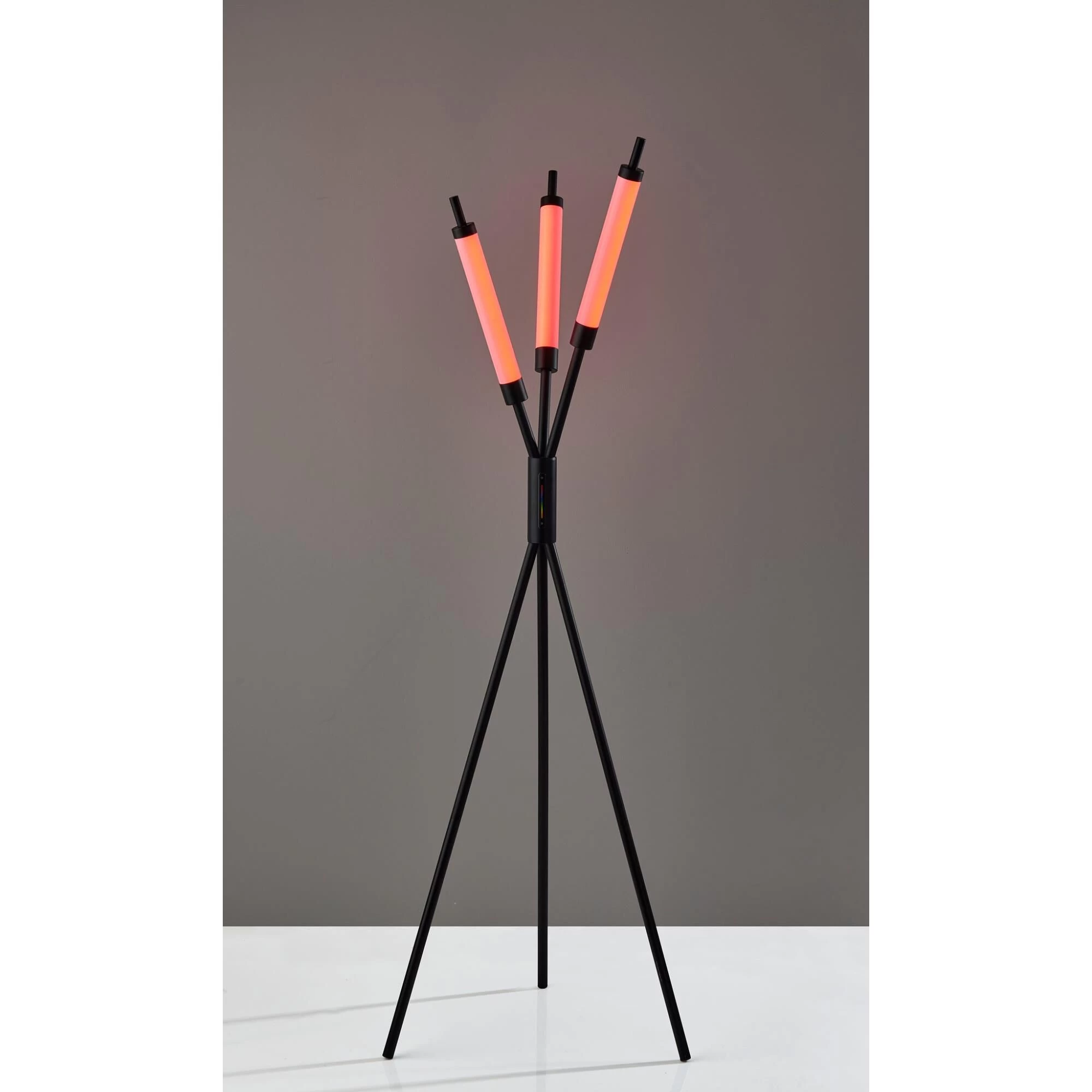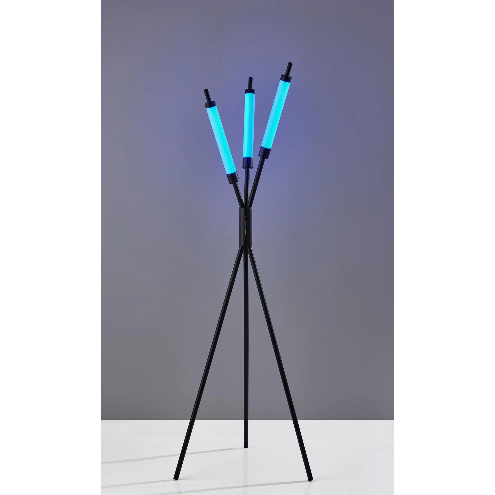 For a modern statement piece that adds vibrant ambient lighting, look no further than the 3 light Collin LED color changing floor lamp. The lamp provides an eye-catching silhouette. Three slender black metal poles rise from a tripod base and crisscross before each leads to a 10″ tall slender cylindrical shade measuring 1.5″ in diameter. The wide footprint of the lamp and elevated height of the integrated shades make this lamp a perfect choice in room corners or beside couches and love seats. Both economical and versatile, the three integrated 12W eco-friendly LEDs together produce up to 3,000 lumens to brighten your space. Operated by a touch switch conveniently located on the stem, the shades project light in a full spectrum of RGB color and feature three brightness settings all controlled by the touch of a finger. The lamp is also powered by a 5′ black cord. Complete your dcor with the Collin LED color changing table lamp and the compact design of the Collin LED color changing floor lamp.