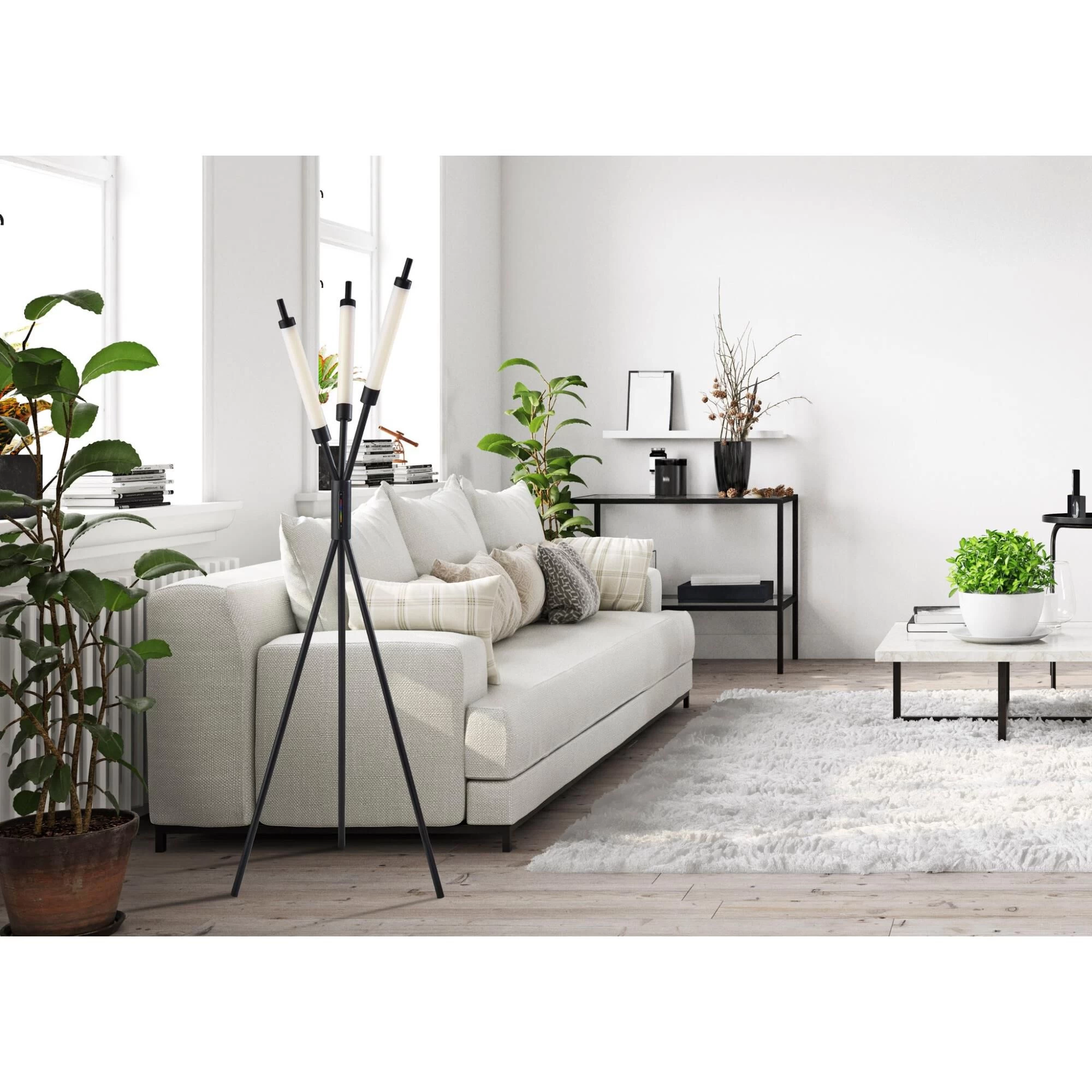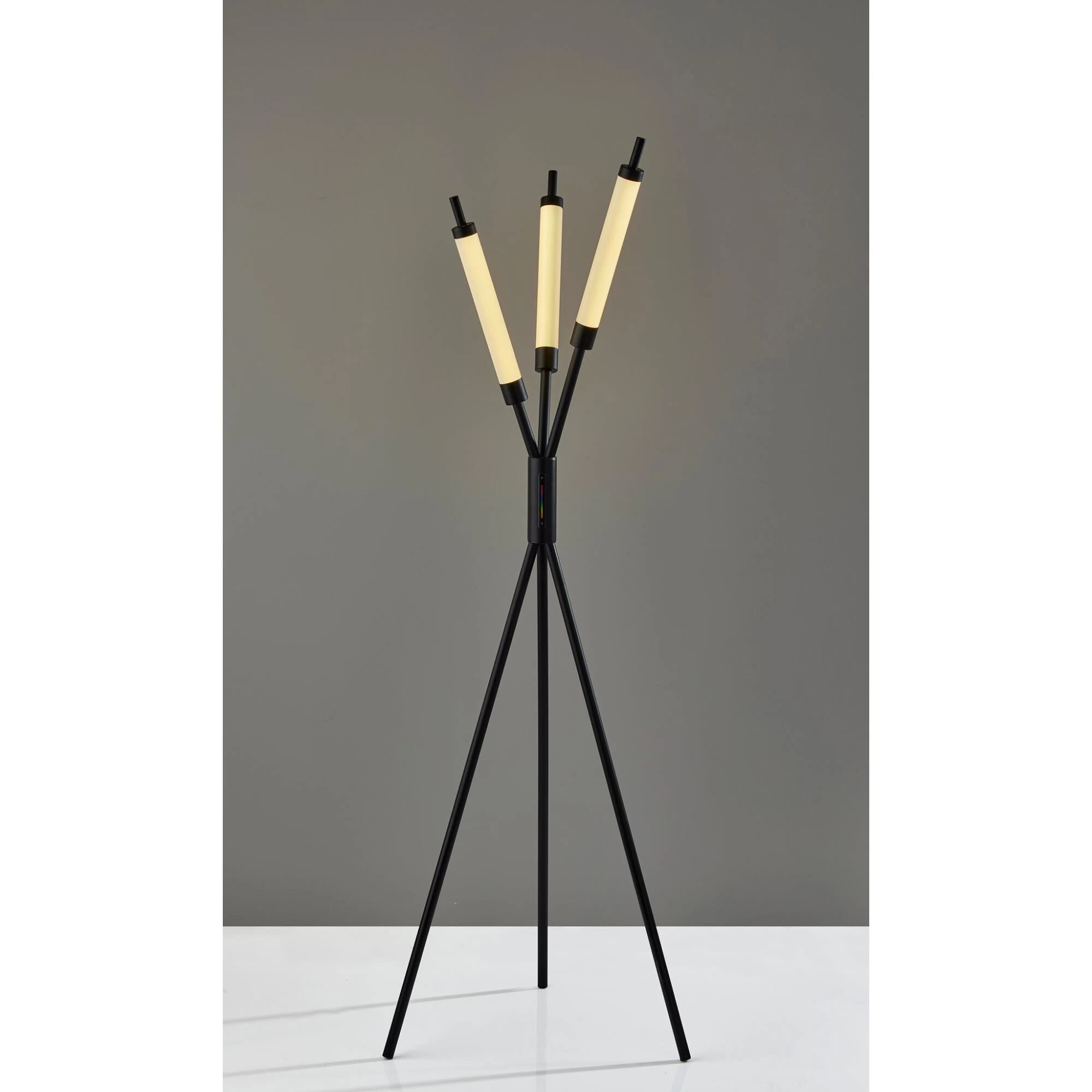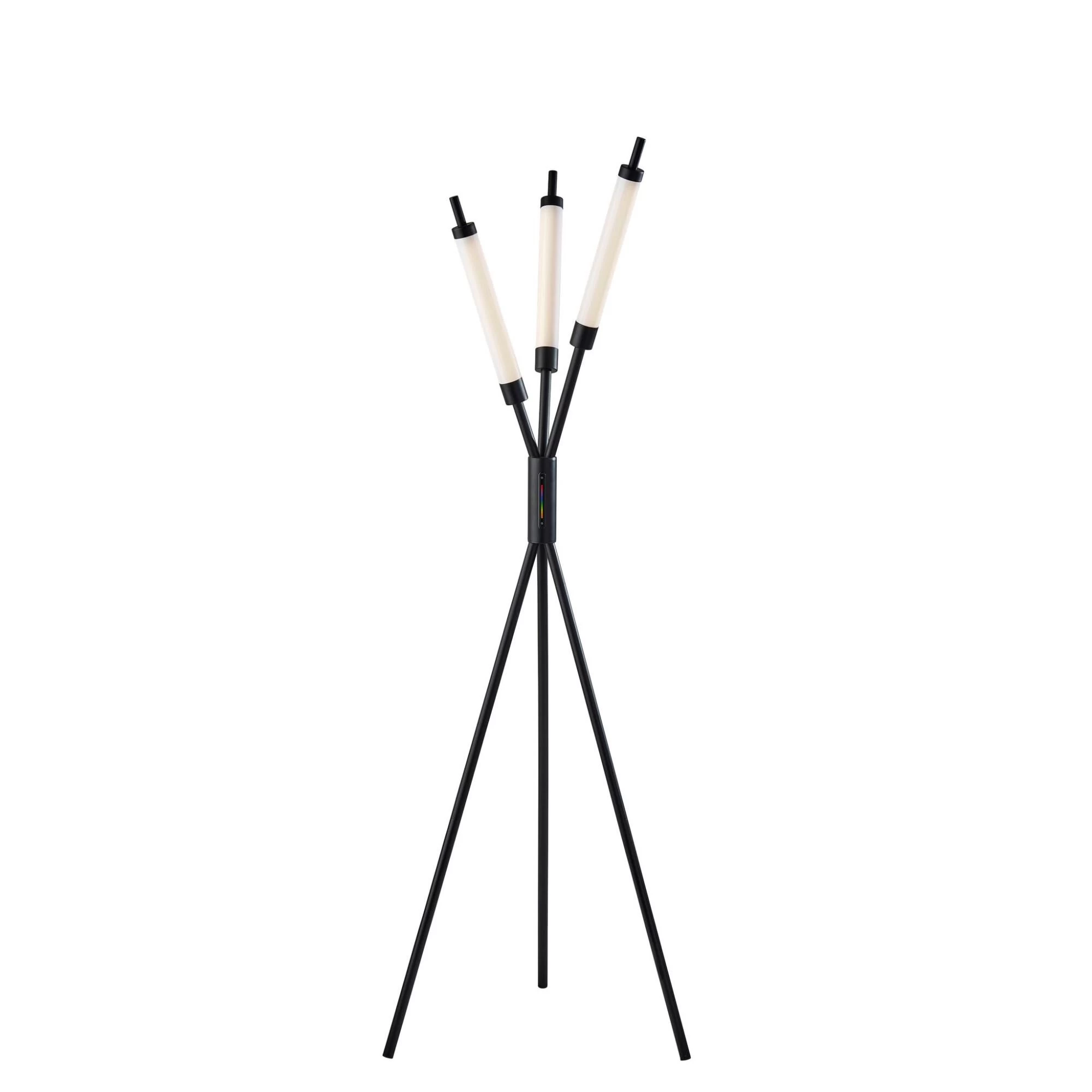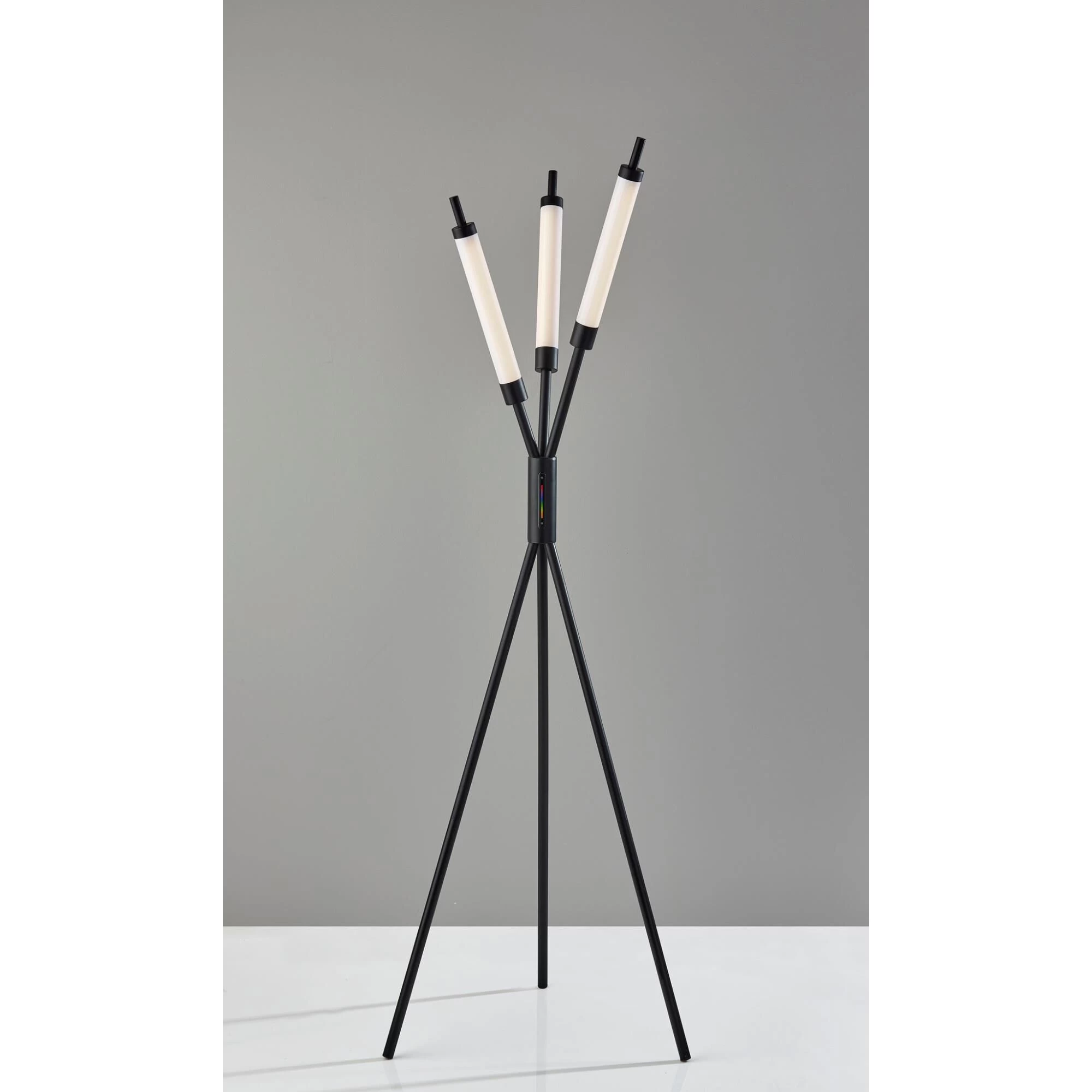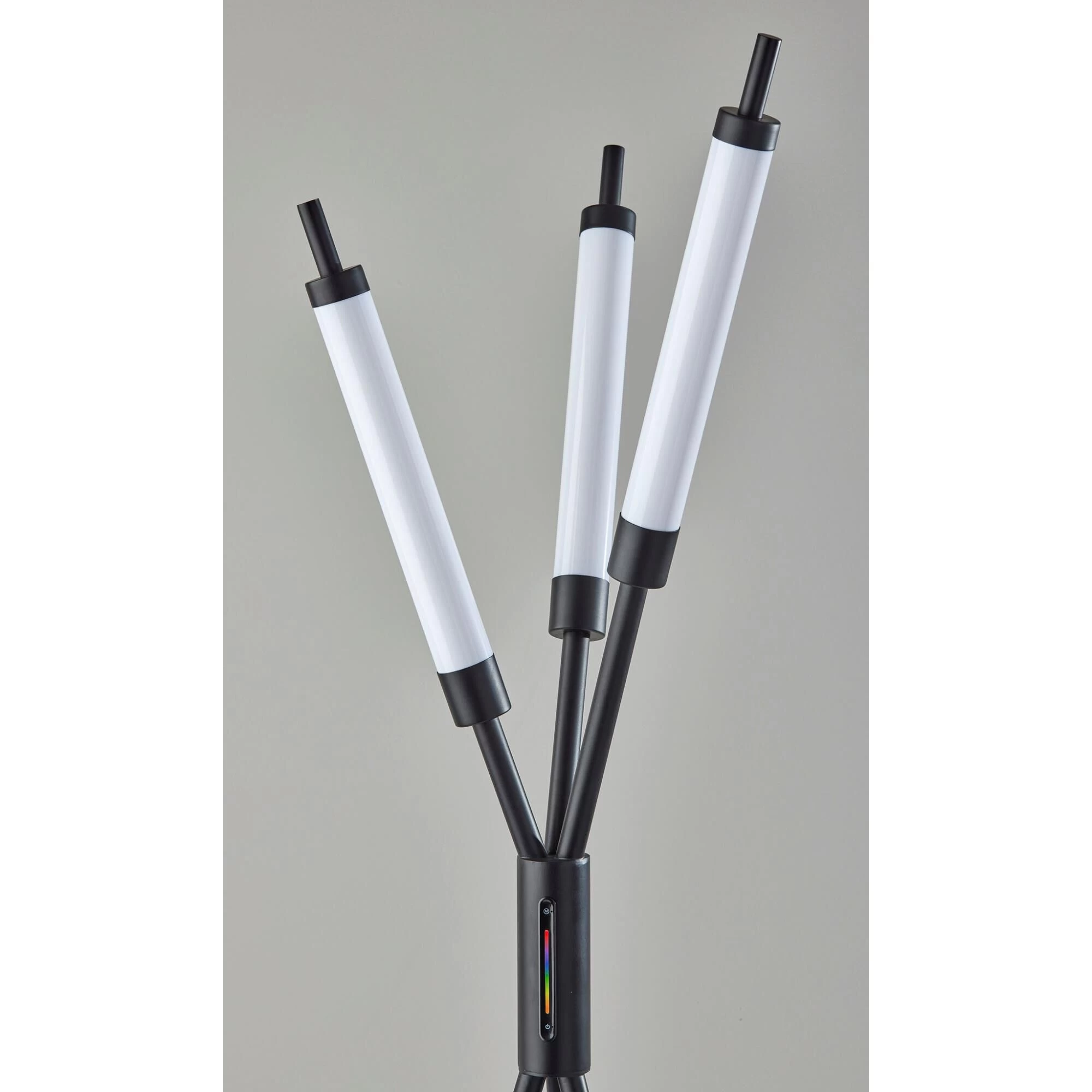 For a modern statement piece that adds vibrant ambient lighting, look no further than the 3 light Collin LED color changing floor lamp. The lamp provides an eye-catching silhouette. Three slender black metal poles rise from a tripod base and crisscross before each leads to a 10″ tall slender cylindrical shade measuring 1.5″ in diameter. The wide footprint of the lamp and elevated height of the integrated shades make this lamp a perfect choice in room corners or beside couches and love seats. Both economical and versatile, the three integrated 12W eco-friendly LEDs together produce up to 3,000 lumens to brighten your space. Operated by a touch switch conveniently located on the stem, the shades project light in a full spectrum of RGB color and feature three brightness settings all controlled by the touch of a finger. The lamp is also powered by a 5′ black cord. Complete your dcor with the Collin LED color changing table lamp and the compact design of the Collin LED color changing floor lamp.