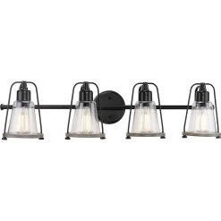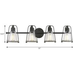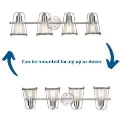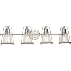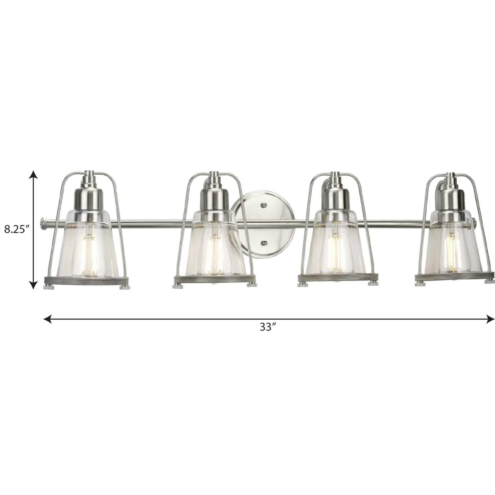 Mix old and new for charming character with the Conway Collection 4-Light Brushed Nickel Clear Seeded Farmhouse Bath Vanity Light. A brushed nickel bell-shaped frame and round backplate are accented by hand-painted, weathered grey wood-style accents for a charming nautical aesthetic. A light source glows from within a clear seeded glass shade for visual texture.
