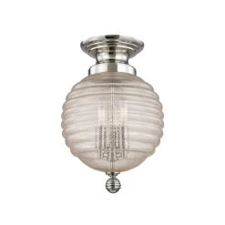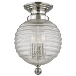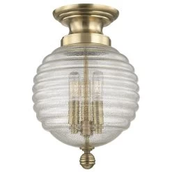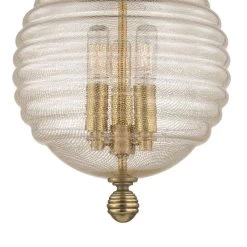Brass mesh dissolves into spun glass in our Coolidge family. Its unifying theme is the beehive, with the iconic shape most prominently displayed in its artisanal diffuser. Cast metal canopy and finial spin subtle variations on the spherical shape.