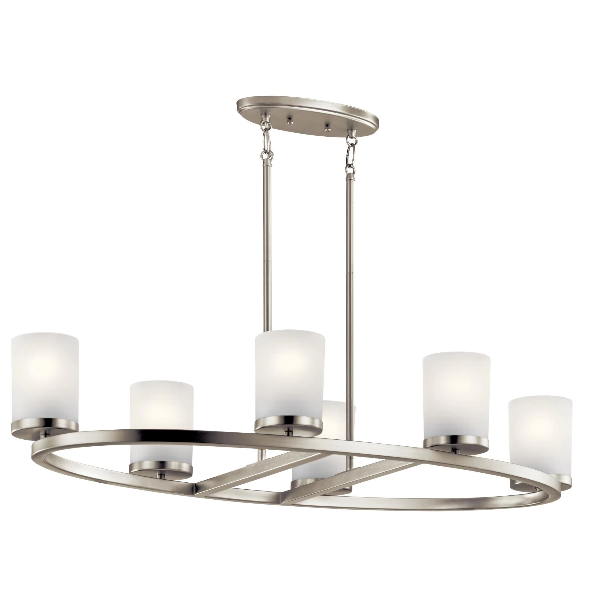 Simple lines and softly etched glass shades bring transitional style to the Daimlen 6 light oval chandelier in Brushed Nickel.