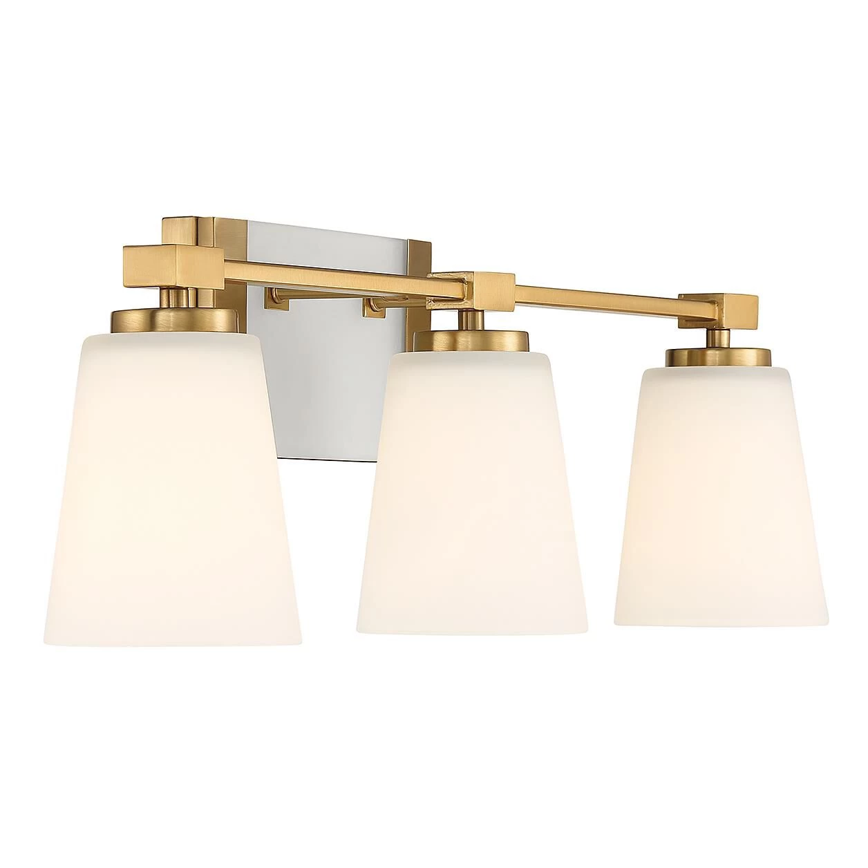 Add a relaxing spa feeling to any bathroom with the Savoy House Darby 3-light bath vanity light! White glass shades offer up a soft yet flattering glow while a matching pane of white glass creates a serene floating effect. Finished in warm brass. Darby is 8″ in height, 25.25″ in width and extends 7″ from the wall. Uses three standard size bulbs of up to 60 watts per bulb (bulbs not included).