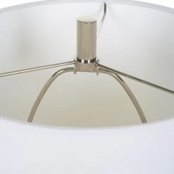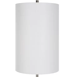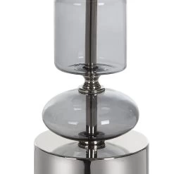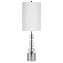 The Stratus Buffet Lamp Features Geometric Gray Glass Ornaments Stacked Between Sleek Polished Nickel Plated Details, Creating A Unique And Sophisticated Look. The Tall Hardback Shade Is Covered In A Crisp White Linen Fabric.