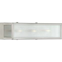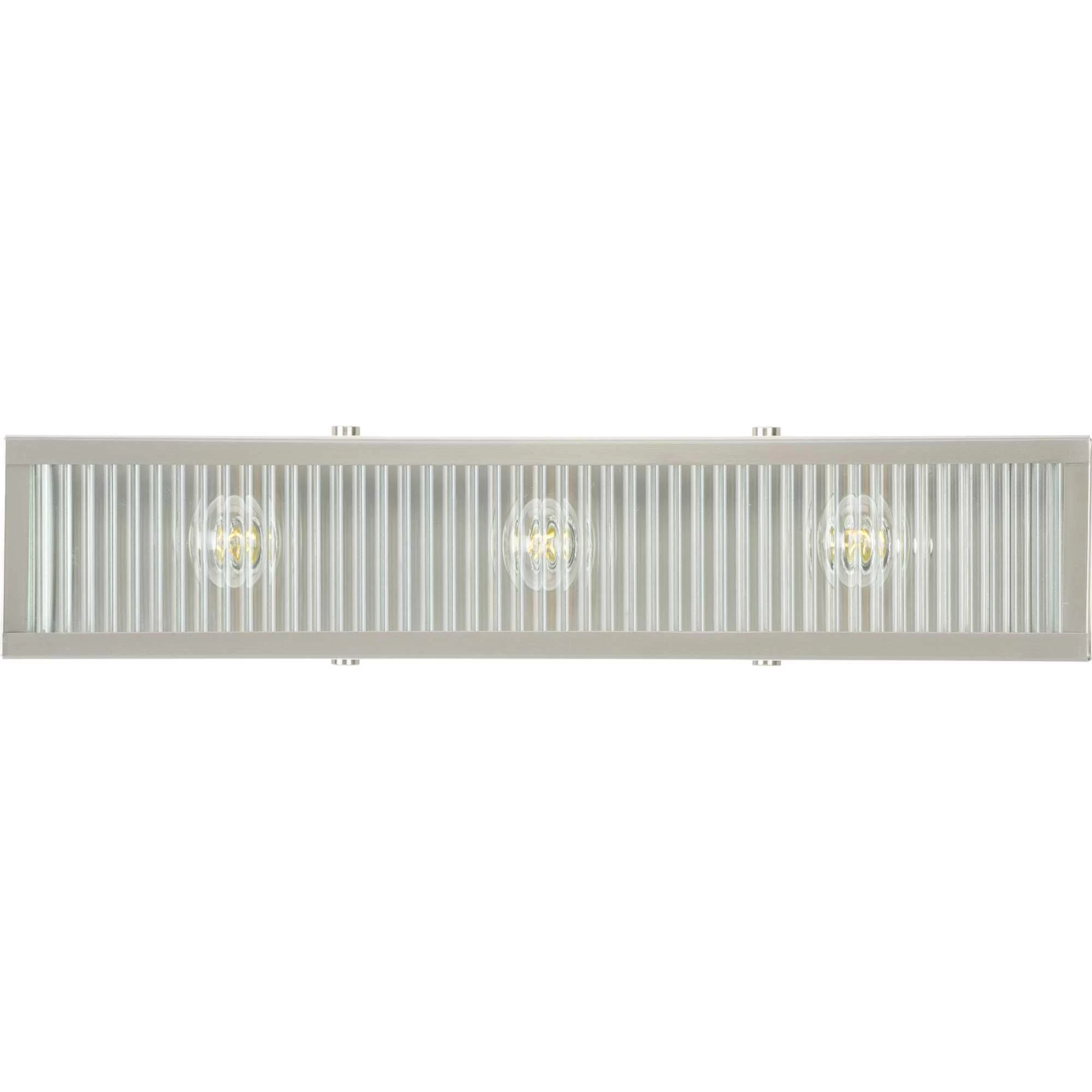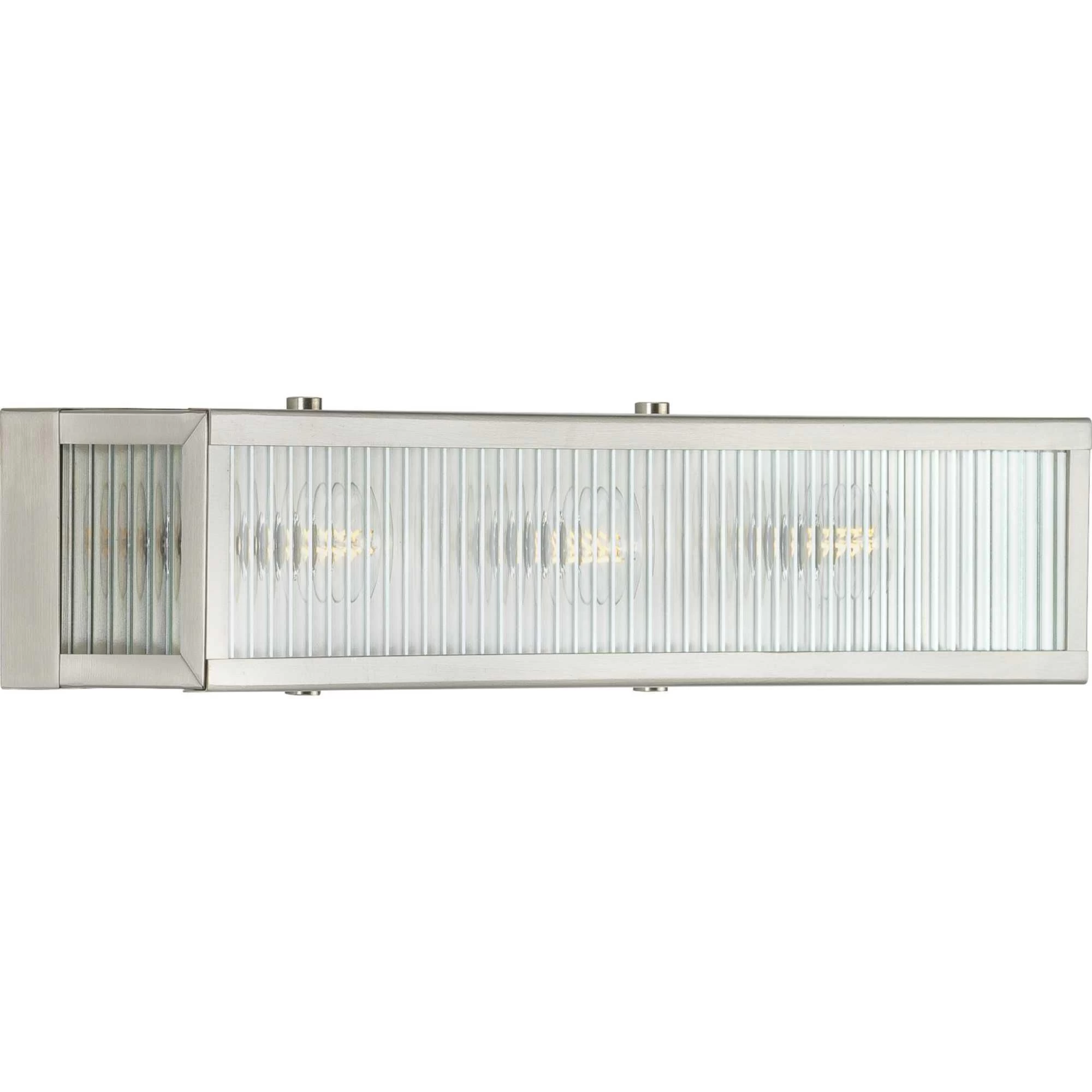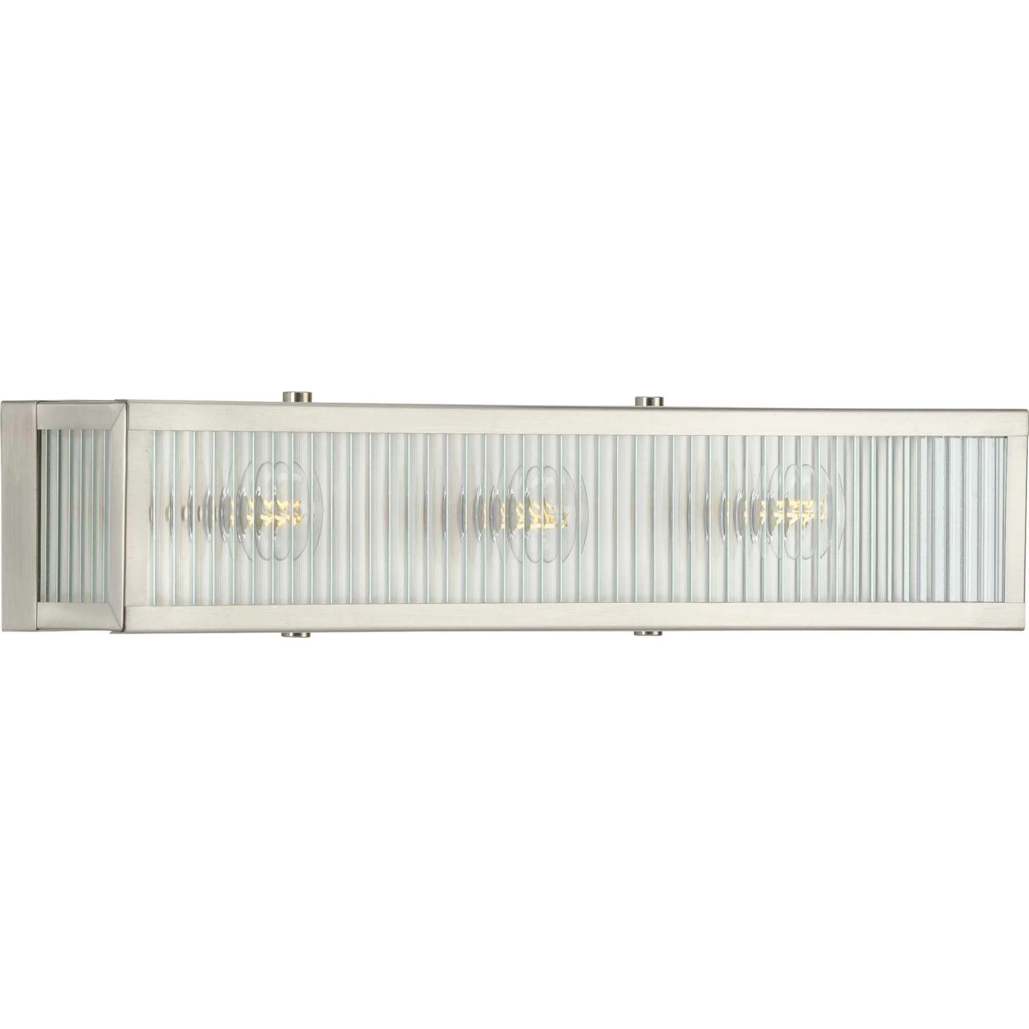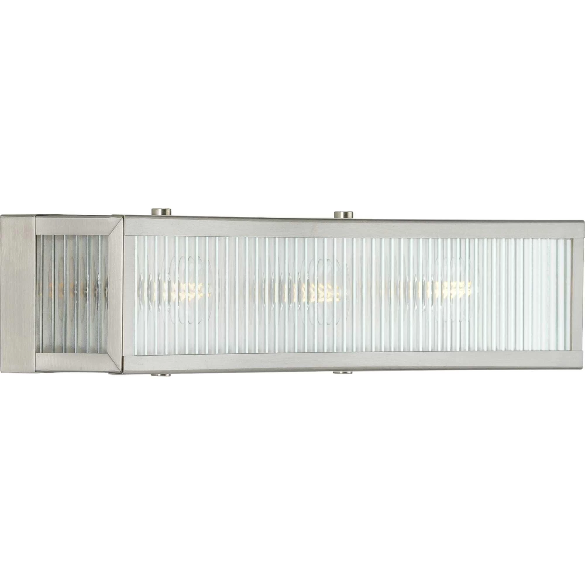 Incorporate a vintage feel with a dash of industrial personality with this three-light bath. An attention-grabbing, clear ribbed glass takes center stage in the design to create a gaslight glow when the fixture is illuminated. A simple, metal frame coated in a sleek stainless steel finish encases the ribbed glass to emphasize the light fixture’s chic industrial edge.