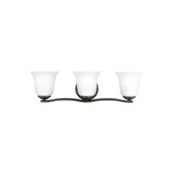 The Sea Gull Lighting Emmons three light vanity fixture in bronze offers shadow-free lighting in your powder room, spa, or master bath room. The Emmons lighting collection by Sea Gull Lighting combines form and function in a traditional empire silhouette. Trumpeted Satin Etched glass shades and a circular finial further enhance the design. Cluster three sizes together in a multi-fixture installation to make a beautifully dramatic statement in the living room, foyer, entryway or family room. The Emmons collection comes in two finishes: Brushed Nickel and Heirloom Bronze. Its assortment includes three-, five- and nine-light chandeliers; one-light mini pendant, three-light pendant, two-light semi-flush mount; one-light wall sconce; and two-, three- and four- light bath vanity fixtures. Incandescent and ENERGY STAR-qualified LED lamping are available; all fixtures are California Title 24 compliant.