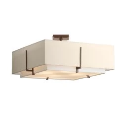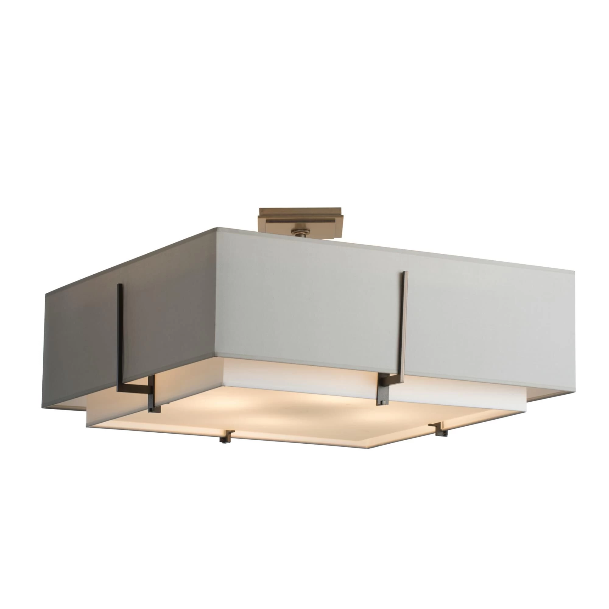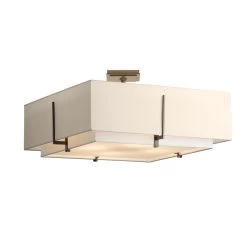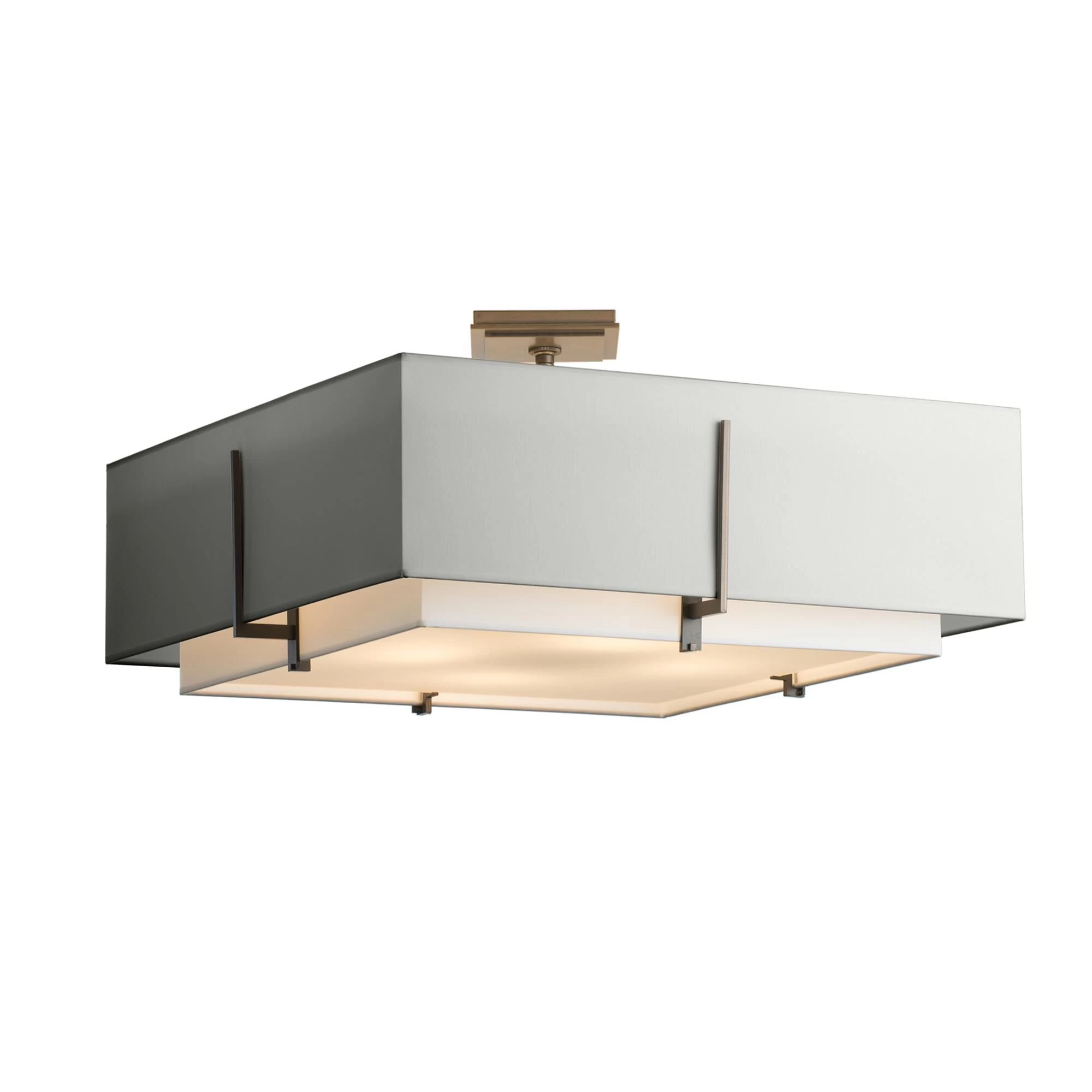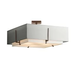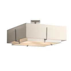 This semi-flush ceiling light features four bulbs within two shades. The shades are cradled by four steel bars creating a bold contrast with the bars’ vertical lines set against the horizontal planes of the shades. All Hubbardton Forge products are hand-crafted to last one at a time in Vermont and backed by a Lifetime Limited Warranty.