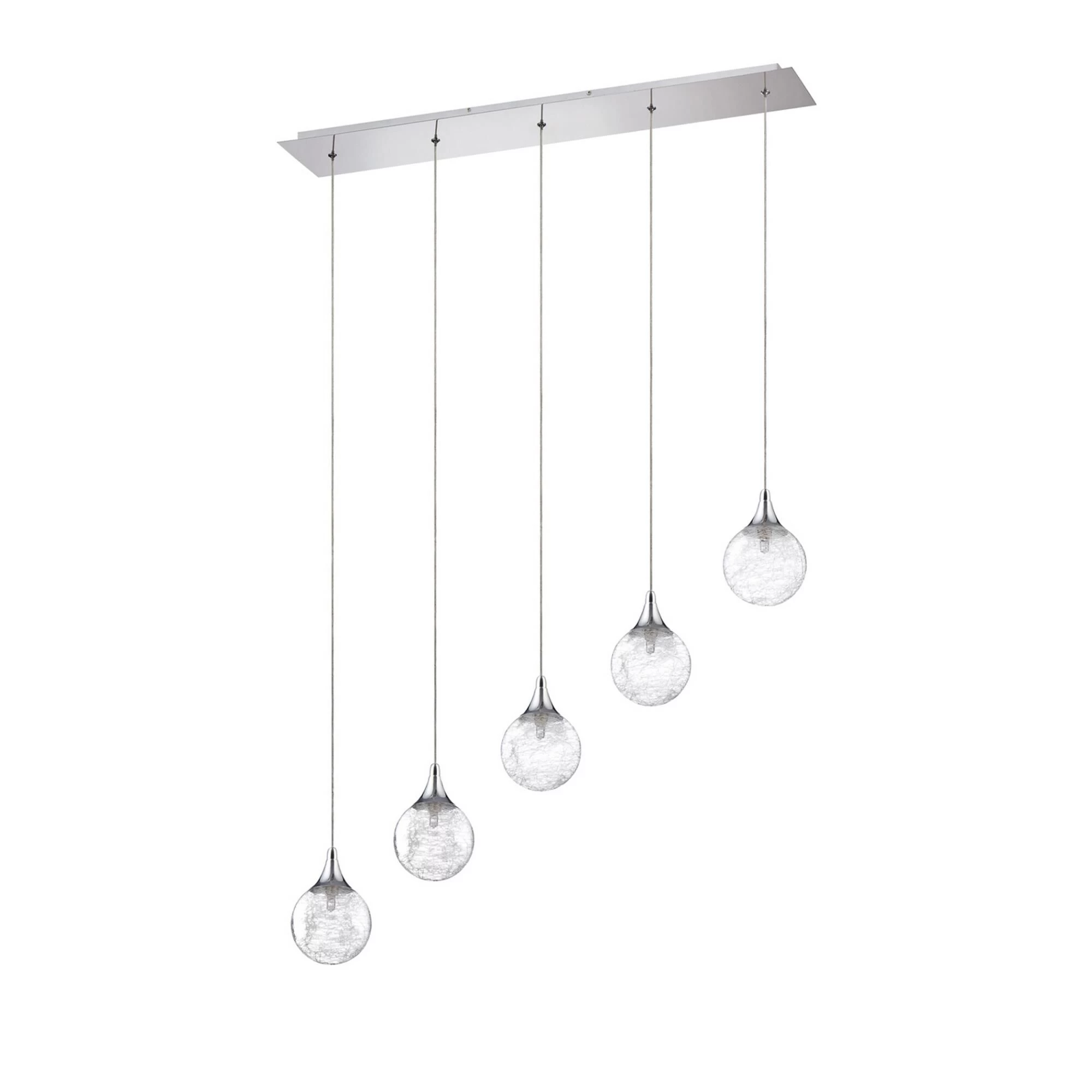 Add transitional illumination to your space with this FYBRA 5-Light Island Light. The stretched glass fibers inside clear glass globes and clean chrome finish make it perfect for minimalist and modern interiors. Eye-catching and stylish, the pendant length is adjustable up to 84 in. This fixture uses five G9 base, open-fixture rated 50-watt bulbs (sold separately) and includes all the hardware for an easy installation.