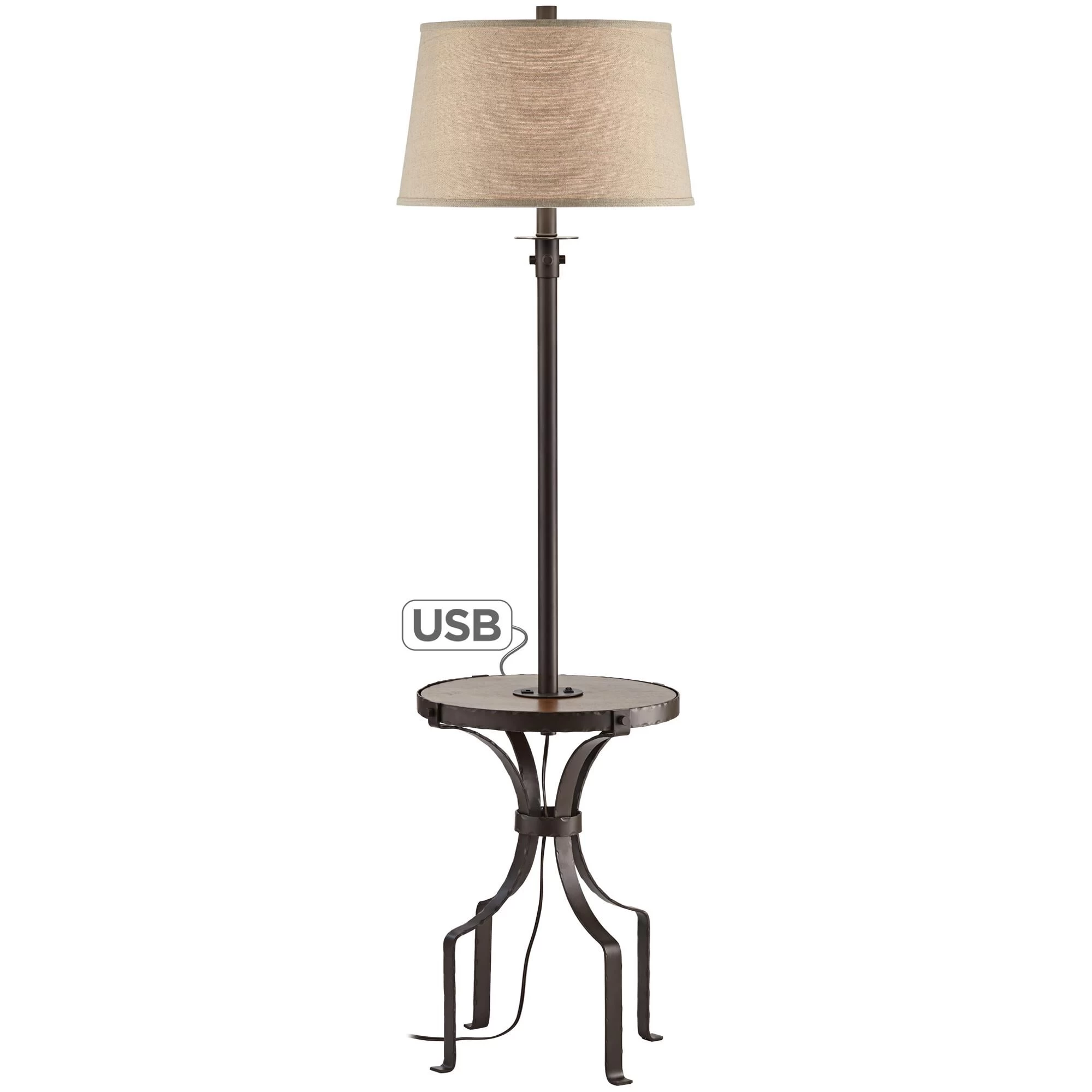 A convenient tray turns this industrial floor lamp into a side table, perfect for compact living spaces. The table includes a USB port perfect for keeping a smart phone charged. A dark bronze finish over hammered, decorative metal is accented with a wood tabletop that cements its rugged look and feel. A burlap shade on top creates soft, diffused illumination perfect for gathering with the family or settling in with a great book.