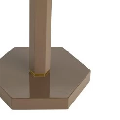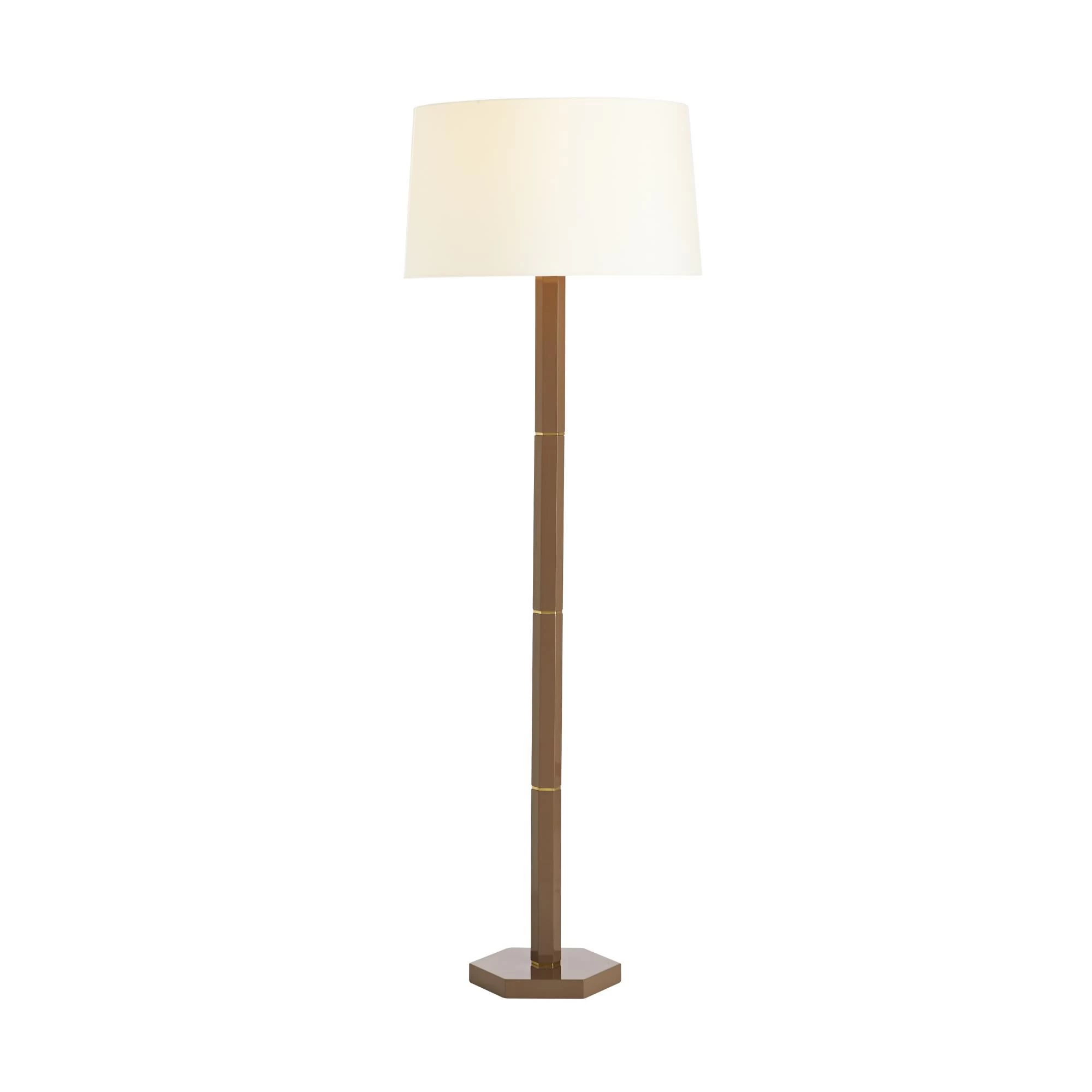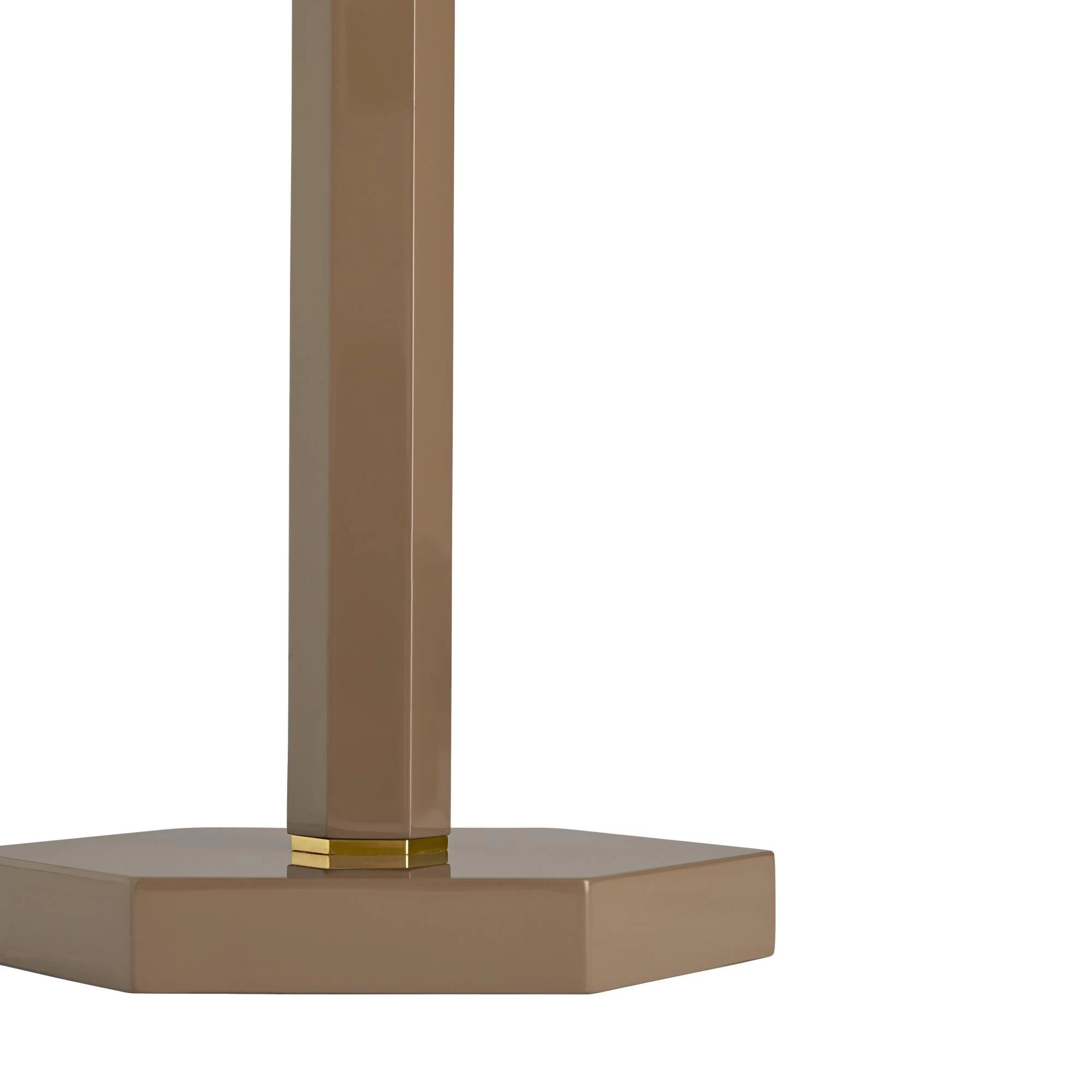 Interior angles and equilateral sides convene to create the graciously geometric silhouette of this floor lamp. A taupe lacquer finish is met with antique brass breaks, adding a refined element to the heavily structured design. A hexagon-shaped base lends to the angular profile and further plays up its faceted form. The neutral color palette of this piece allows it to easily blend with existing dcor and function in a variety of settings.
