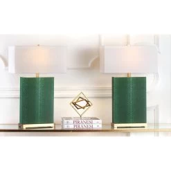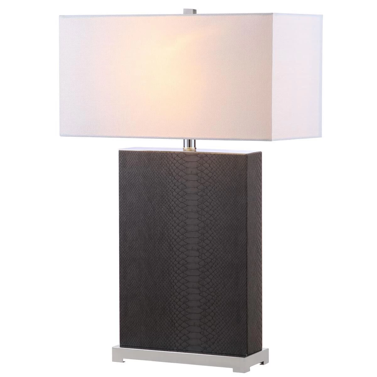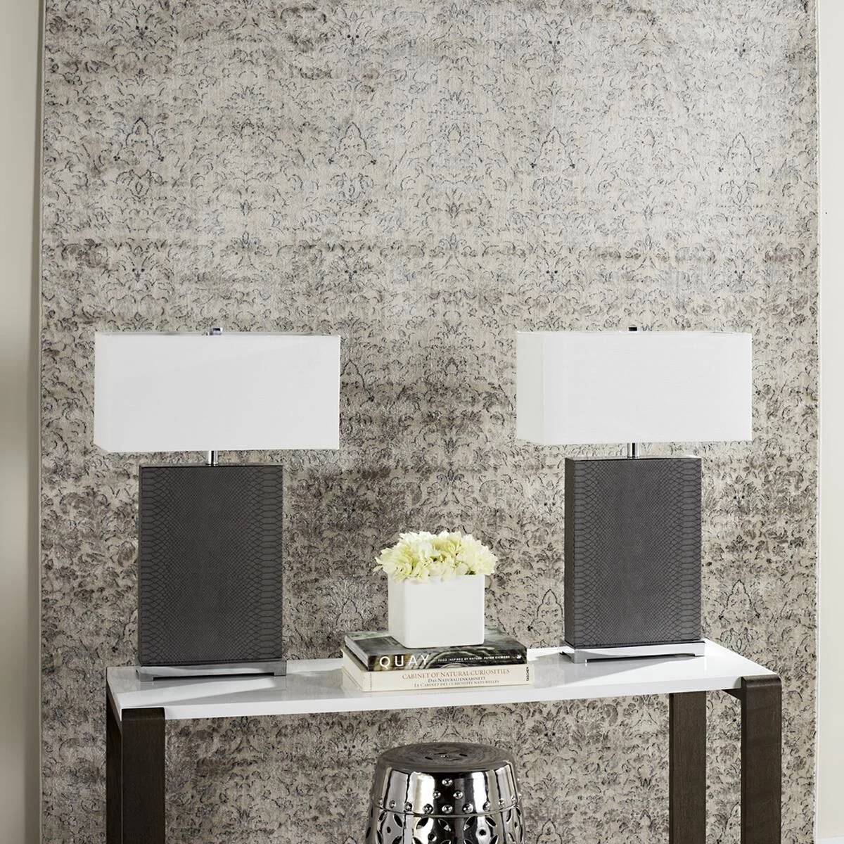 Furnishings appointed to a newly renovated penthouse suite at one of New York Citys poshest hotels inspired this modern table lamp. Finished with a mlange of elegant textures, its suave disposition makes it a designer favorite. Set of 2 Lamps.