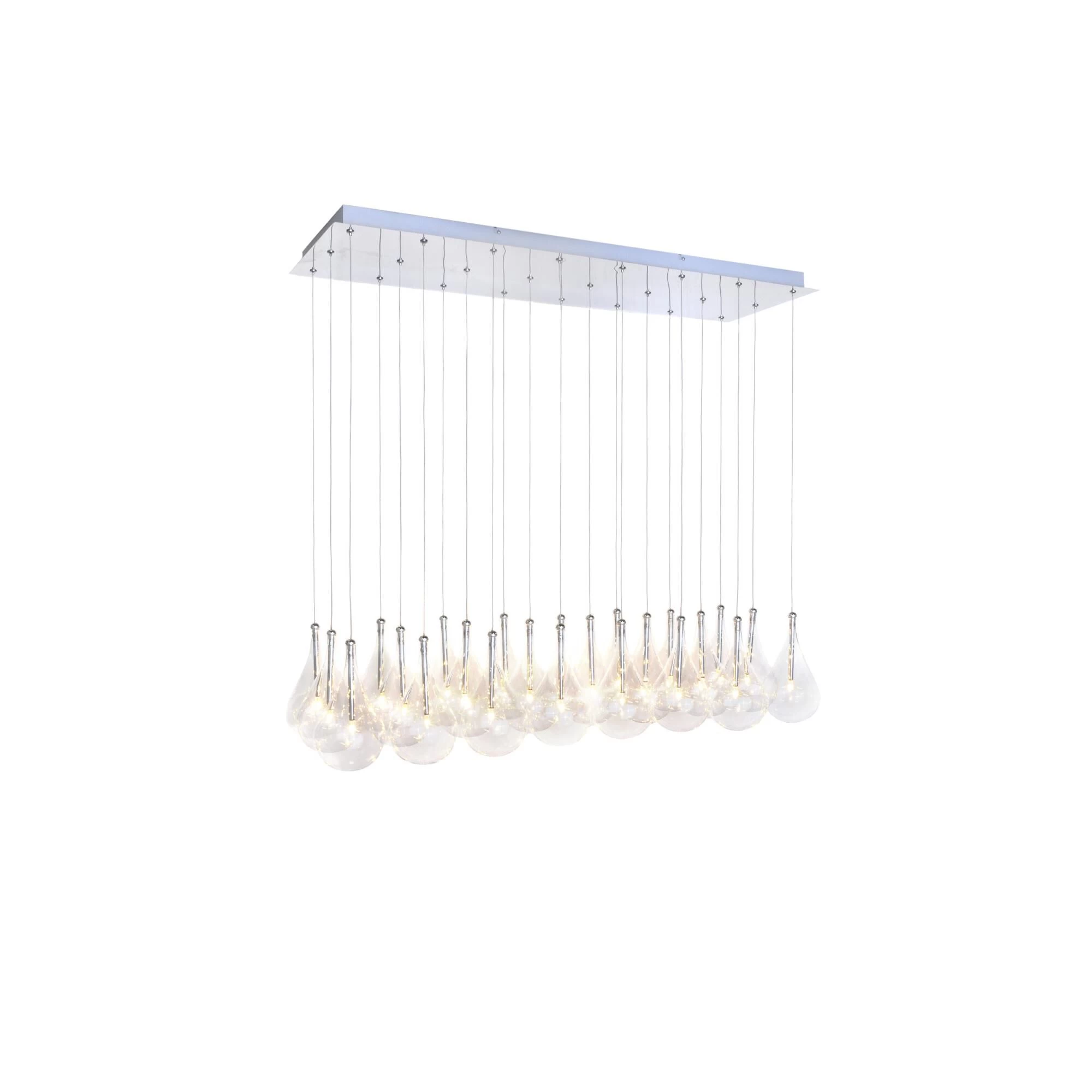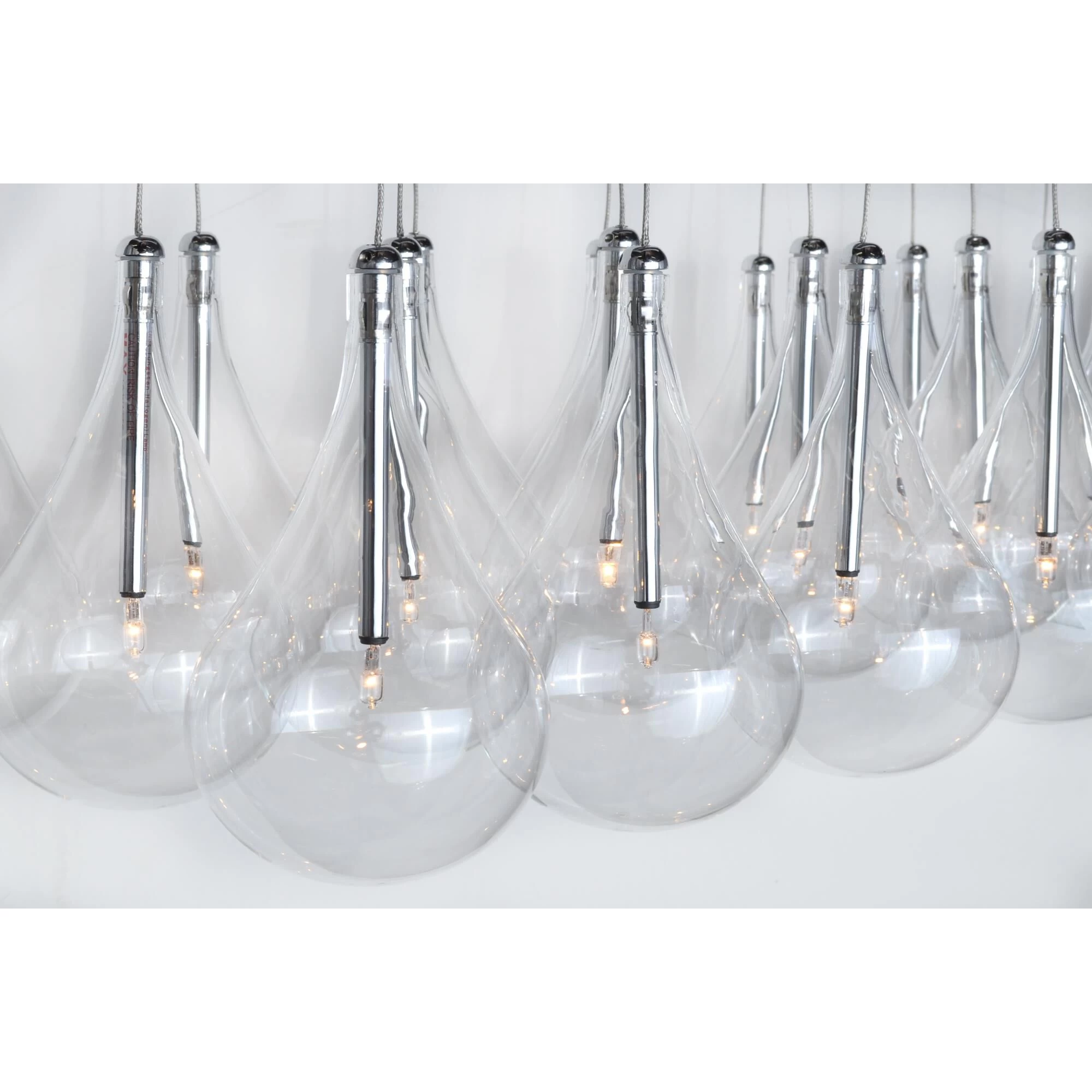 A simple idea gracefully executed in the Larmes collection. Row upon row of Clear oversized teardrops, mounted onto an extended Polished Chrome lamp holder that supports xenon lamps, sets the stage. Individually adjustable drops for custom stagger effects allow for dramatic impact. An added benefit of each drop being aircraft cable-suspended, is the ability to adjust the overall height of the piece to fit the space. The final result is stark and stunning.
