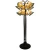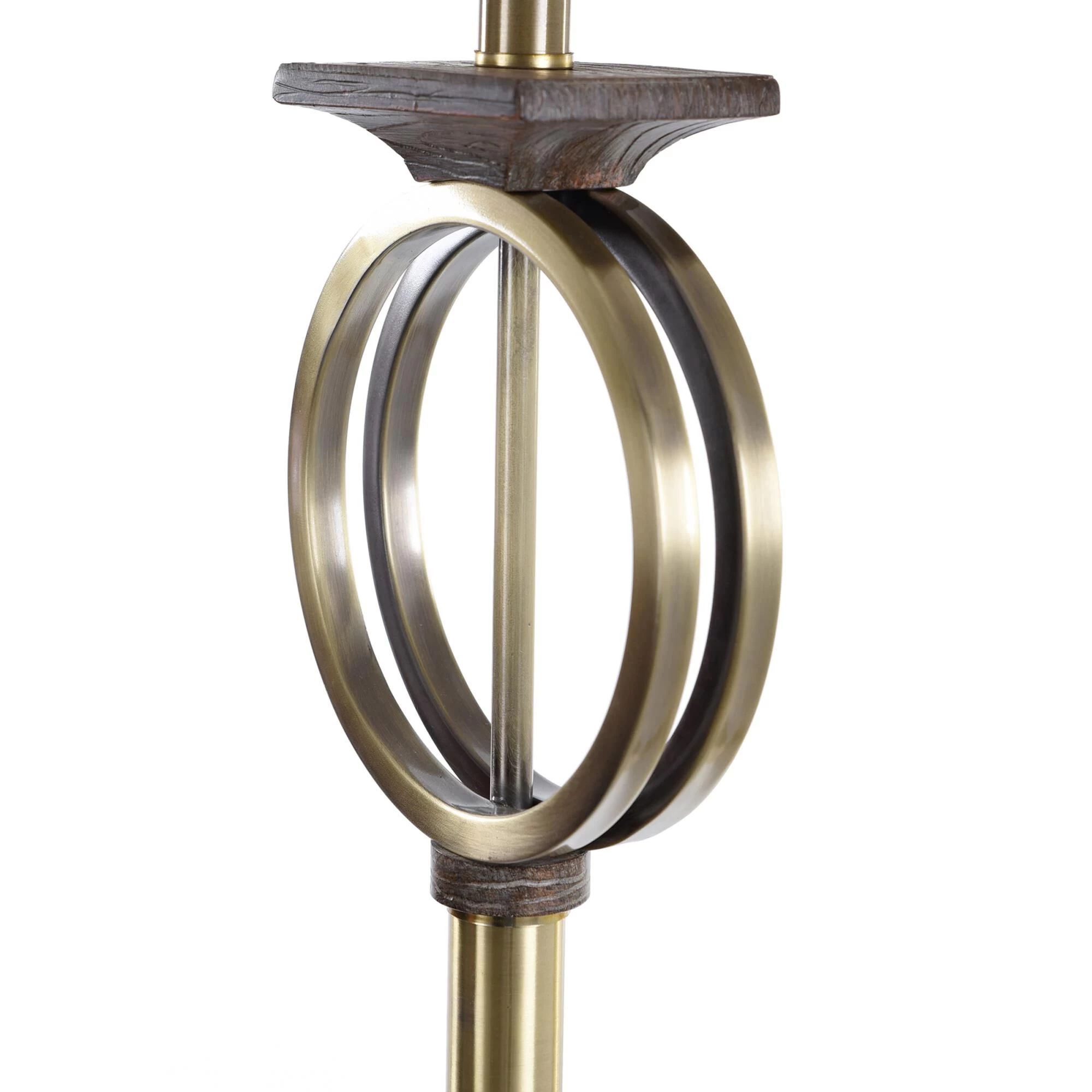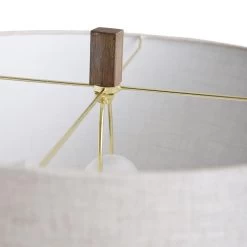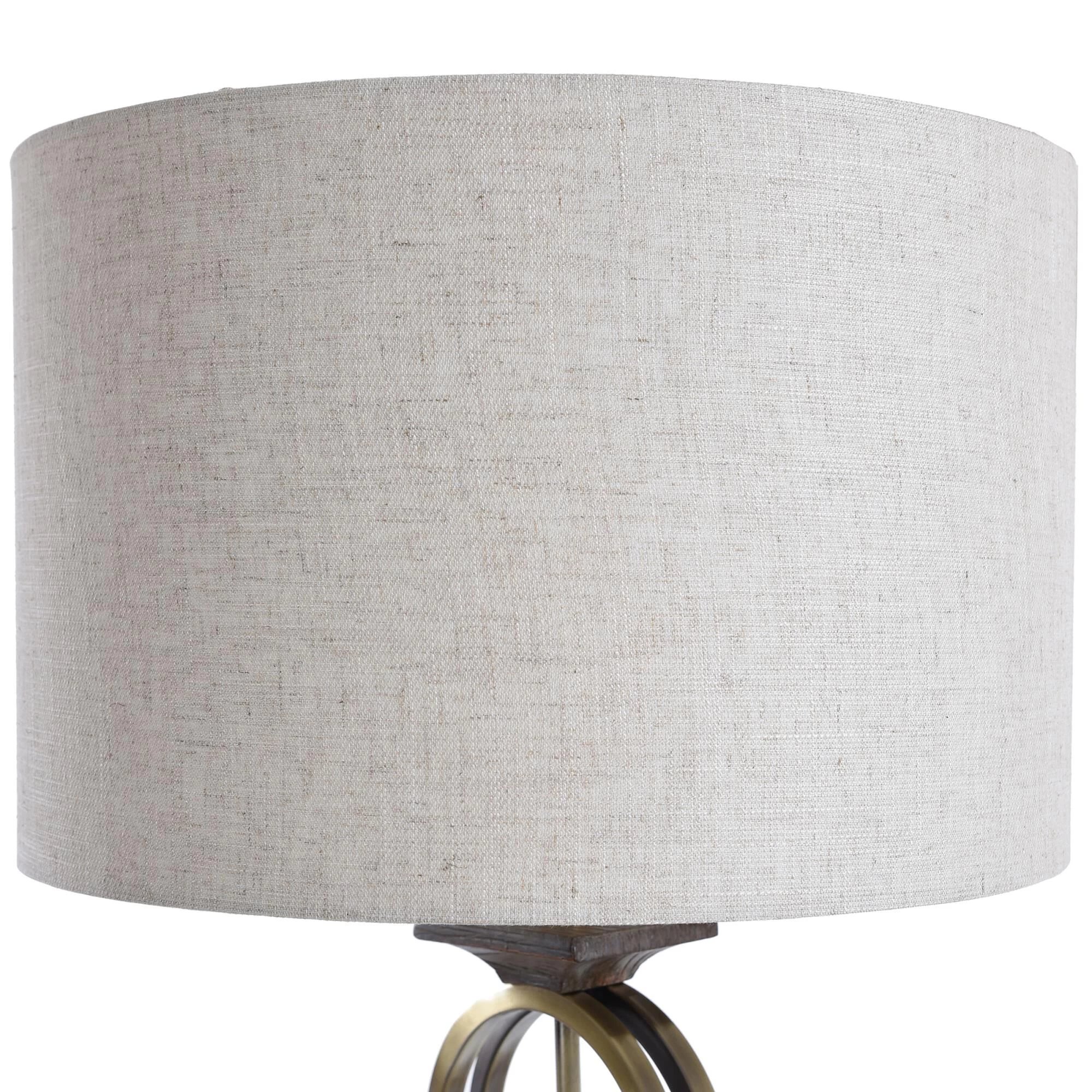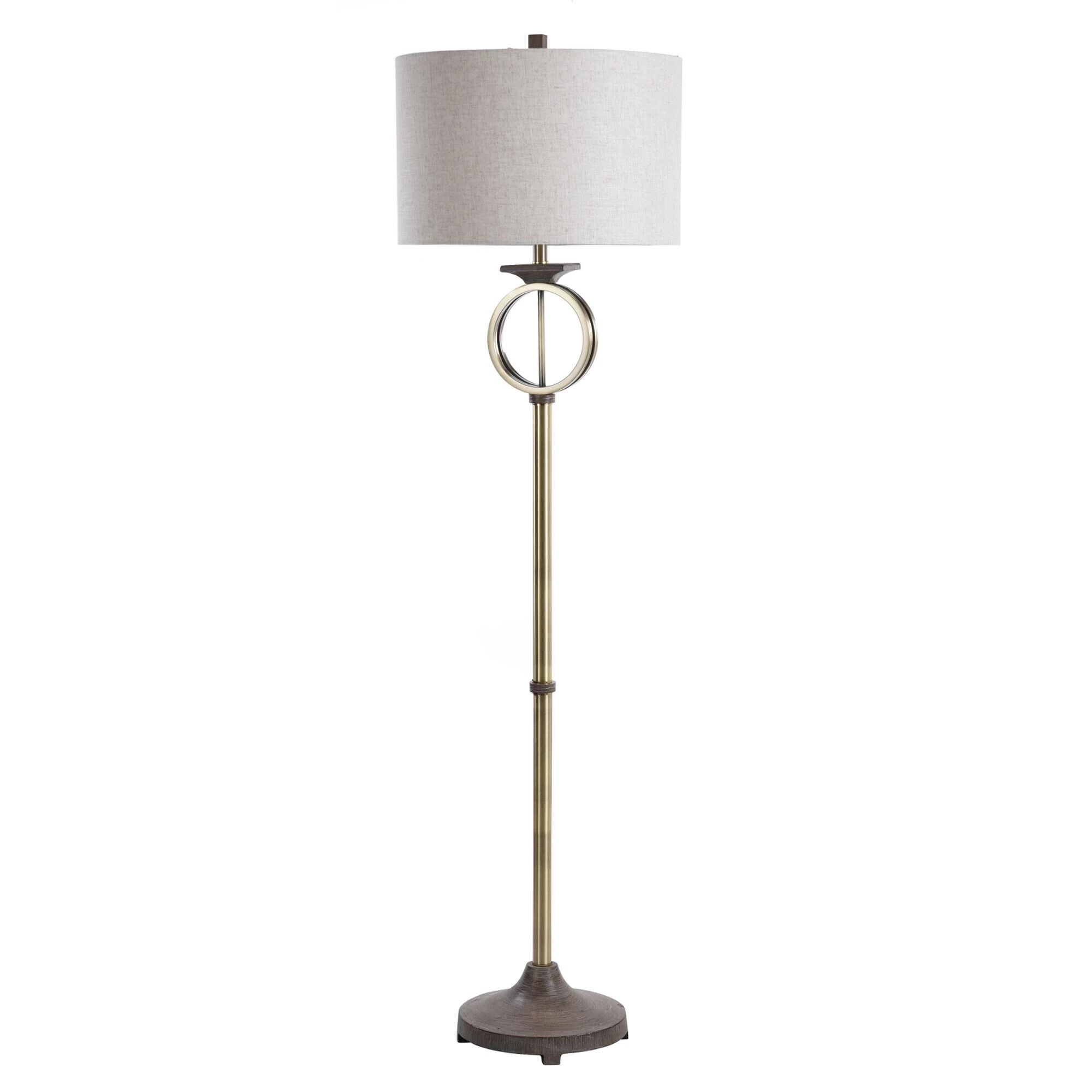 The contemporary Maconfield floor lamp features an off white linen shade over a steel frame with a dark wood-like finish and a ring-shaped brass accent. The intriguing shape of the frame and the lamp’s unique production process ensure it is a one-of-a-kind accent piece. A three-way switch makes this brass and wood floor lamp a stylish and functional addition to a family room or living room.Features -Due to the production process, each piece is unique and no two are exactly alikeLamp body has a brass metal ring with mouldd wood like accents throughoutRound moulded wood base with feetNecking is in brass metal finishMoulded wood rectangular finialHeathered linen drum shaped shade