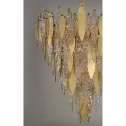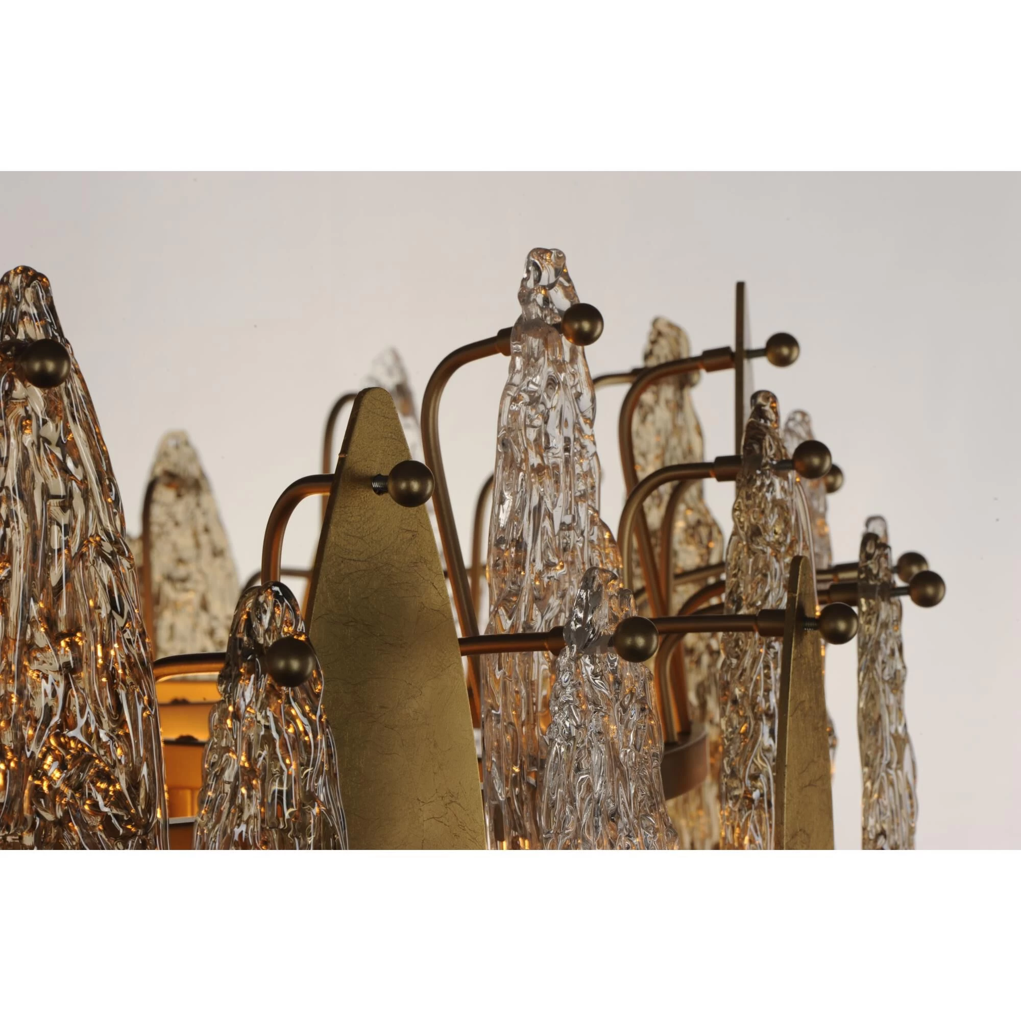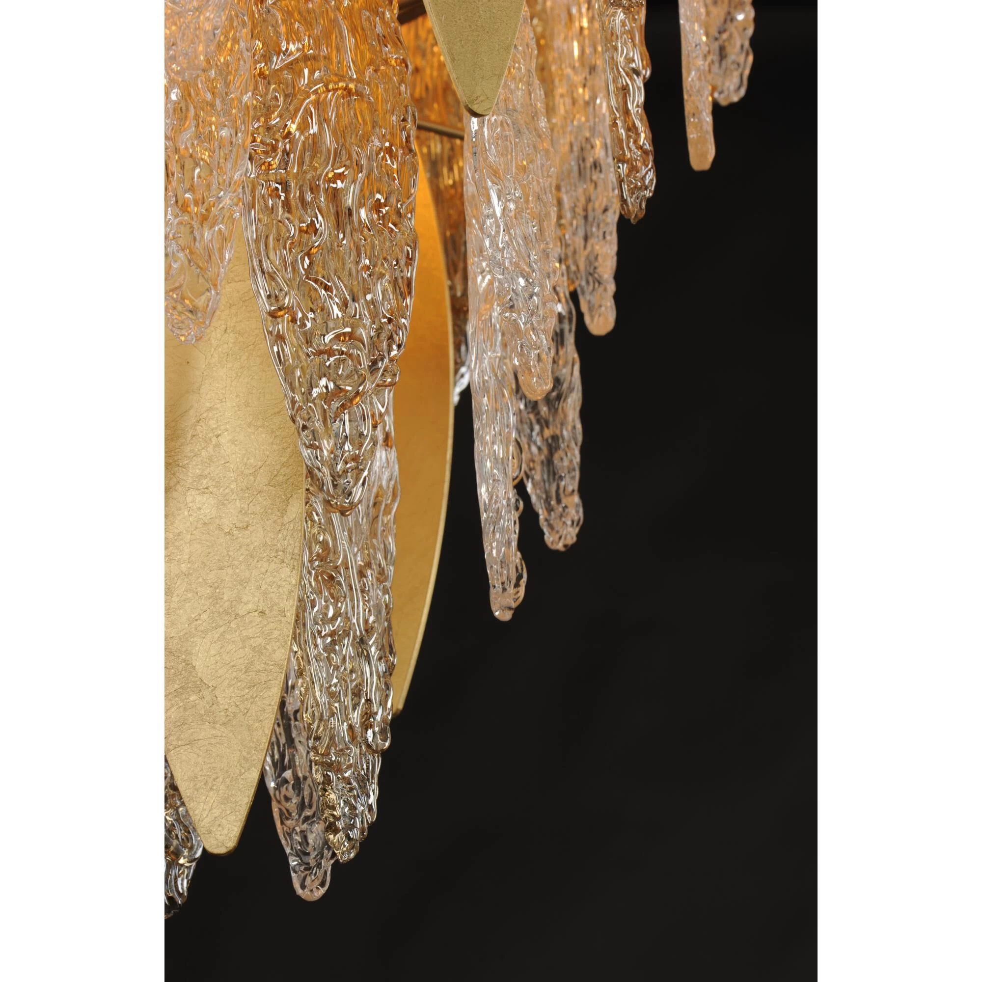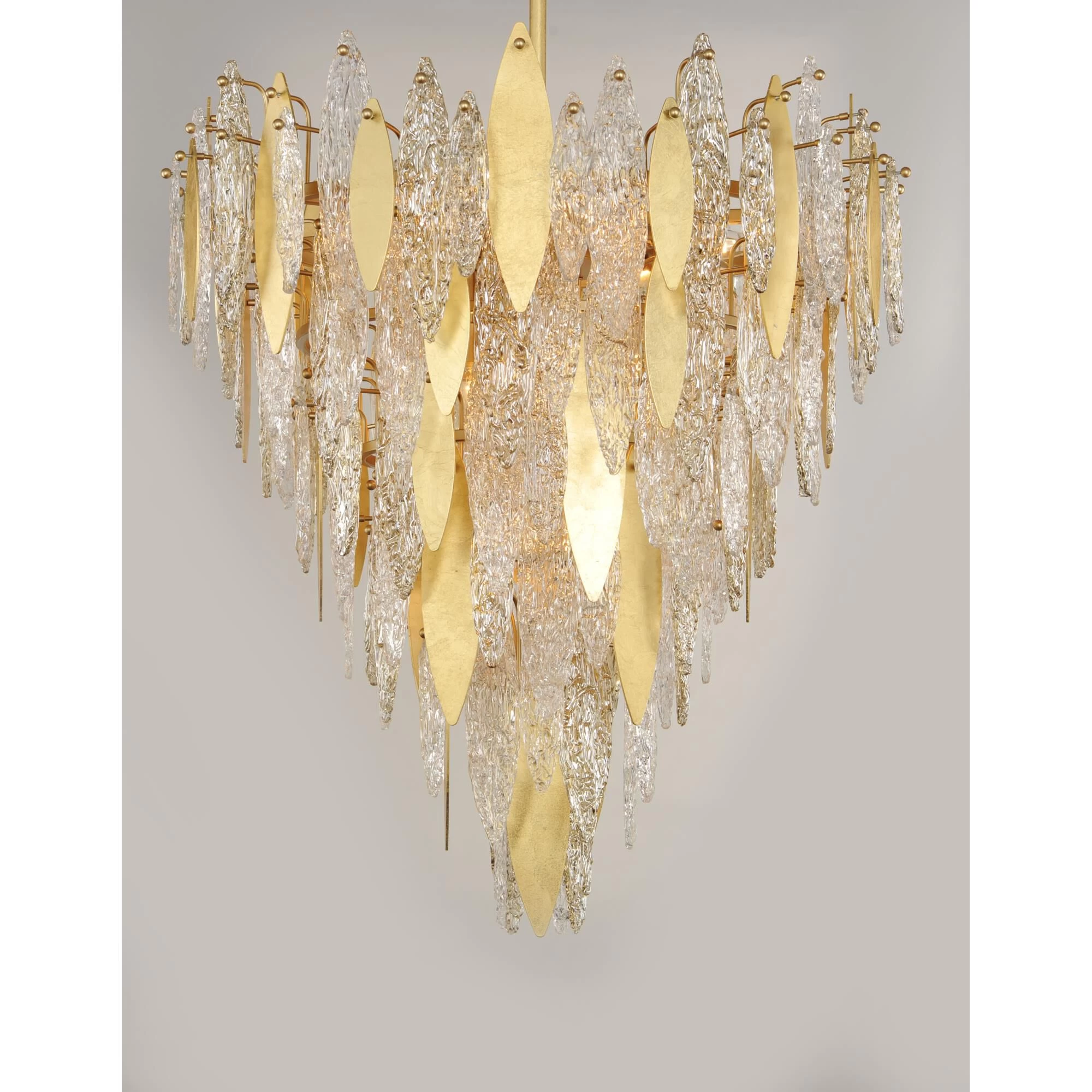 Hand-formed glass petals of Clear and Champagne-tint suspend from a tiered frame of gold and accented with petals of solid metal finished in Gold Leaf. Numerous candelabra sockets are strategically placed within the fixture to create glimmer and elegance to this majestic collection.