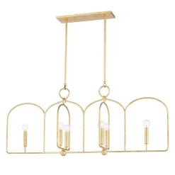With its open, arched metal frame and gold leaf or aged iron finish, Mallory makes a stylish statement. Clear, round bulbs atop sleek, straight candle holders create a beautiful contrasting effect. Available as a sconce, pendant or linear, each fixture hangs from a round metal loop giving the piece a feeling of motion.