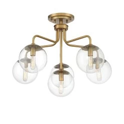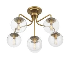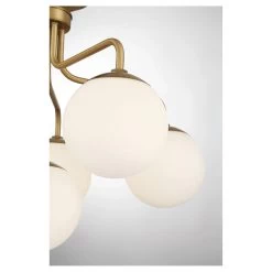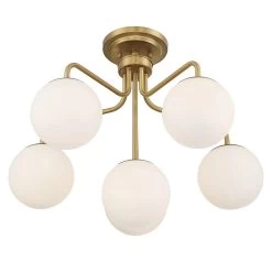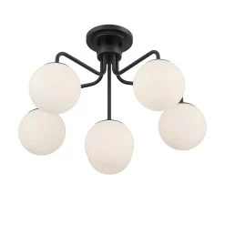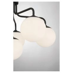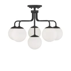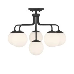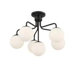 The Savoy House Marco 6-light ceiling light delivers a sleek lighting look that is inspired by midcentury modern style. A minimal design finished in matte black keeps the focus on the light coming from shades of white opal glass. Marco is 18.25″ in height and 24″ in width. It uses six candelabra size bulbs of up to 60 watts per bulb.