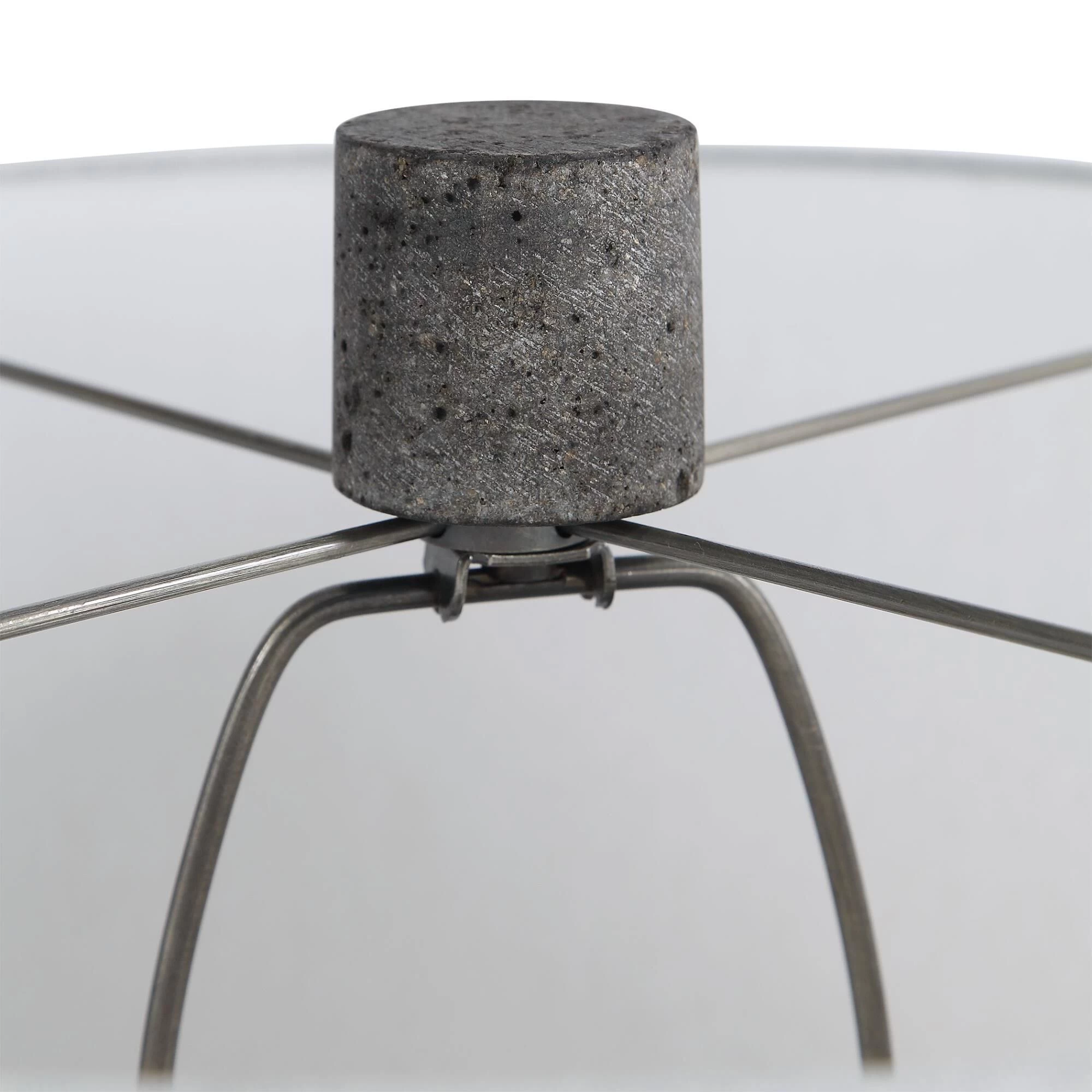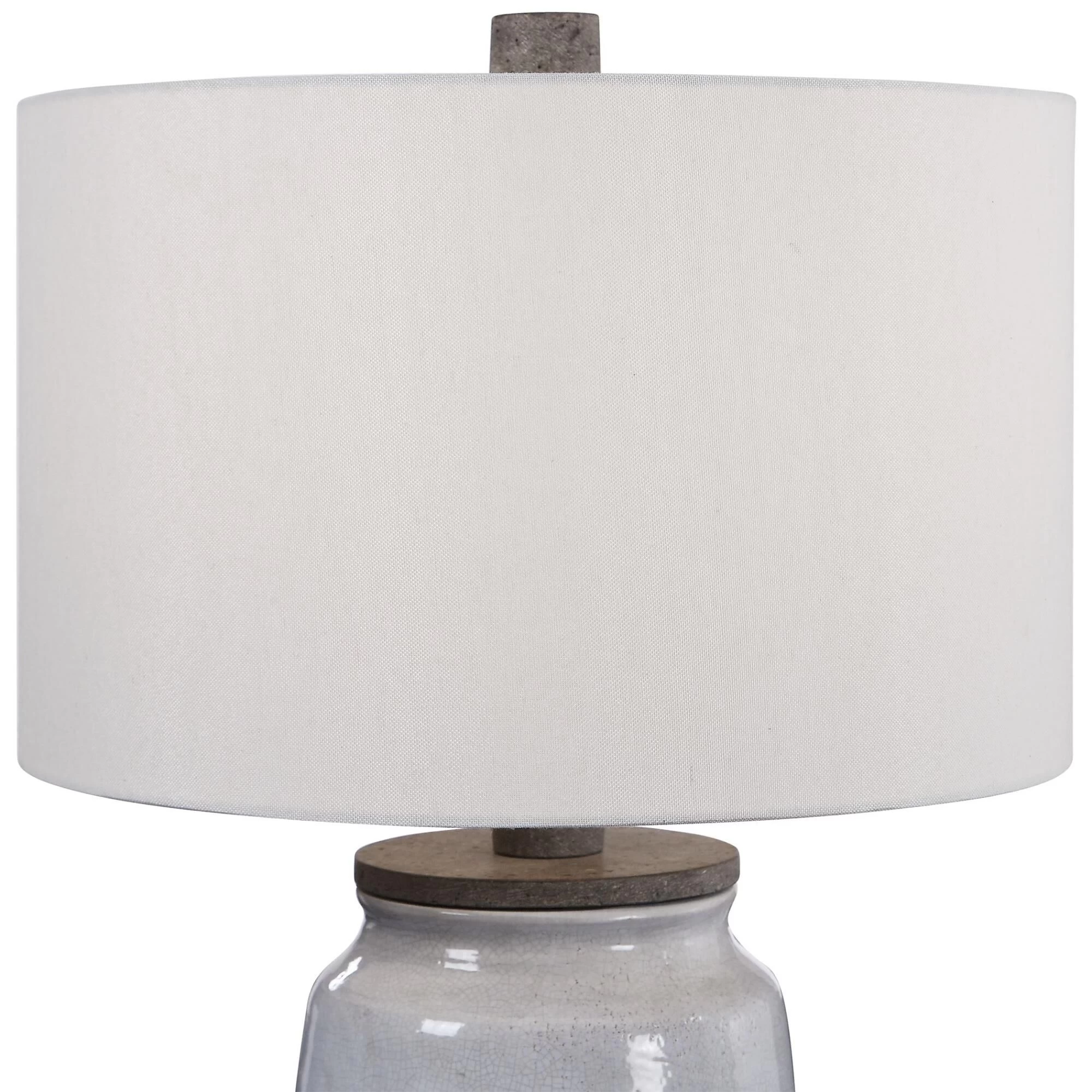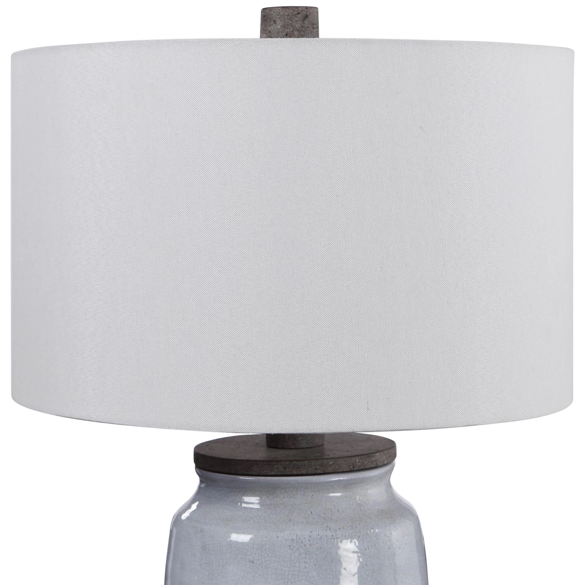 This Ceramic Table Lamp Is Finished In A Light Blue Crackle Glaze, Accented With Aged Charcoal Stained Concrete Details. The Round Hardback Drum Shade Is A White Linen Fabric With Light Slubbing. Due To The Nature Of Fired Glazes On Ceramic Lamps, Finishes Will Vary Slightly.