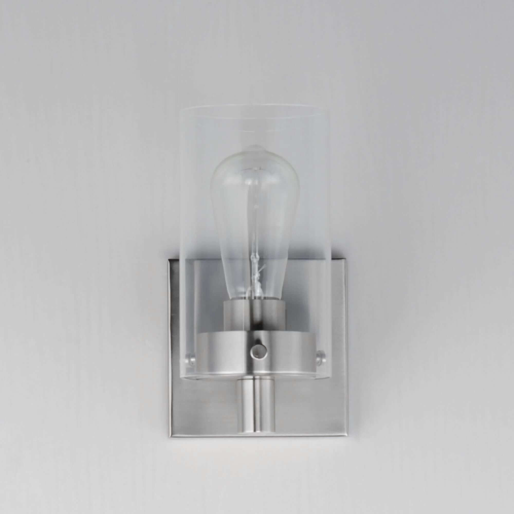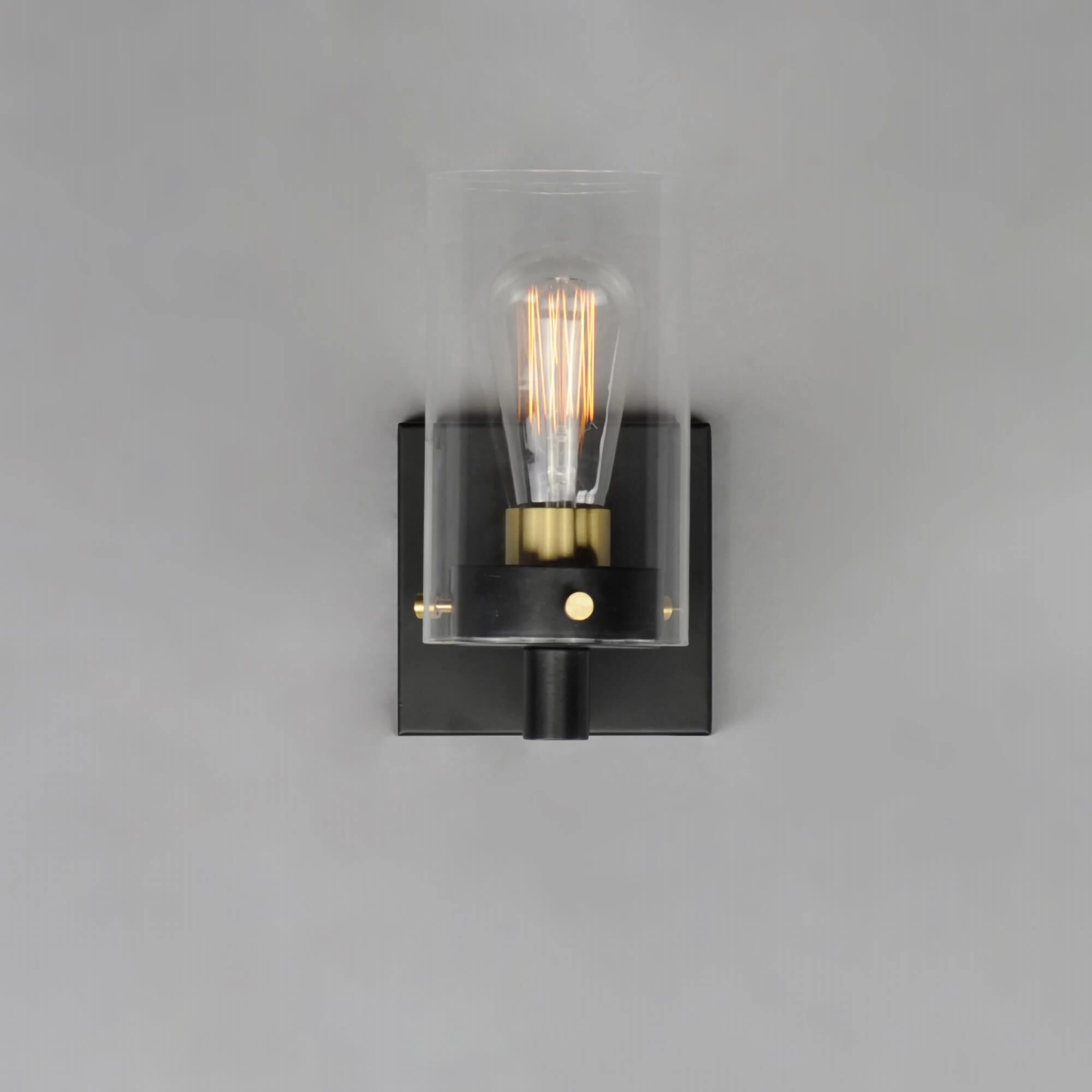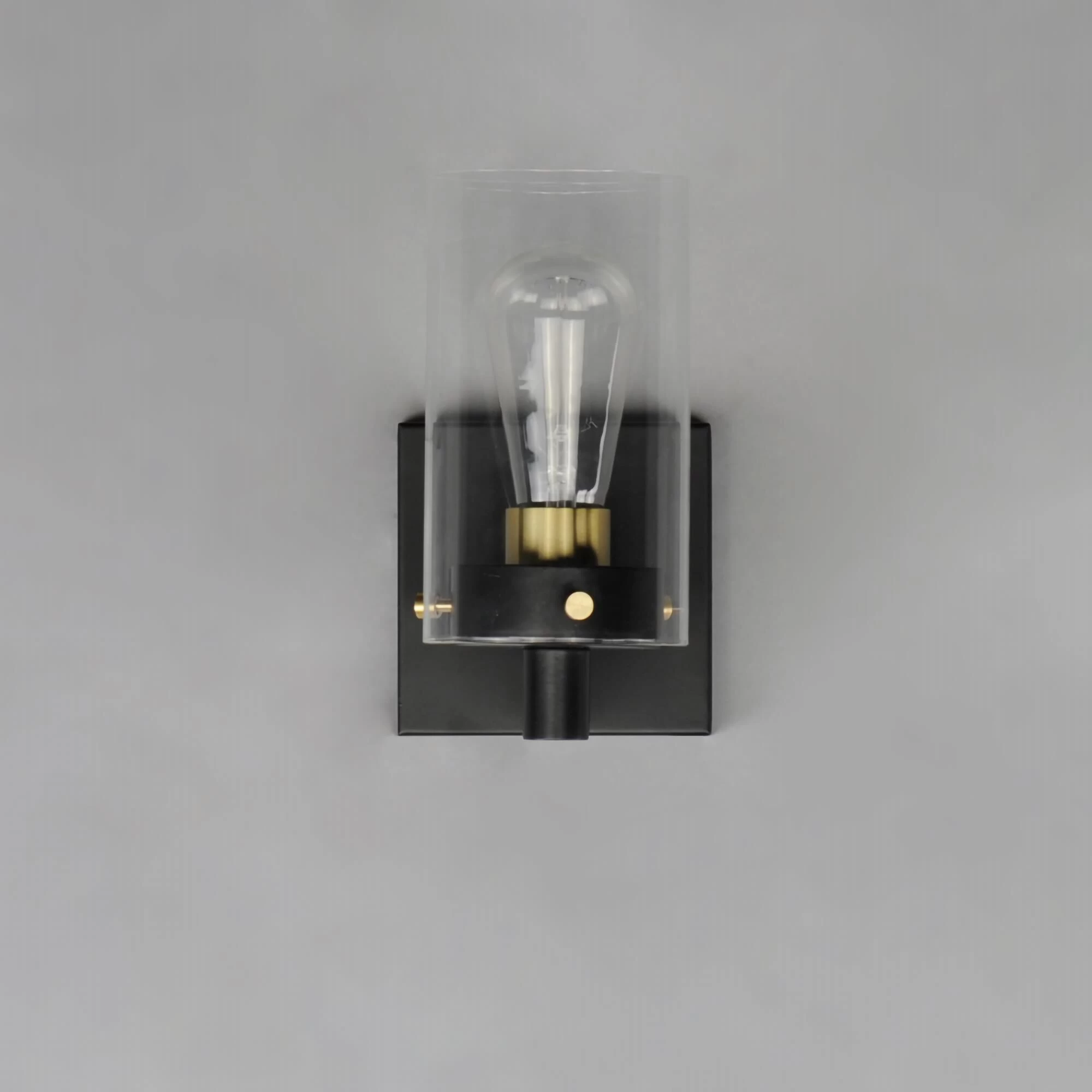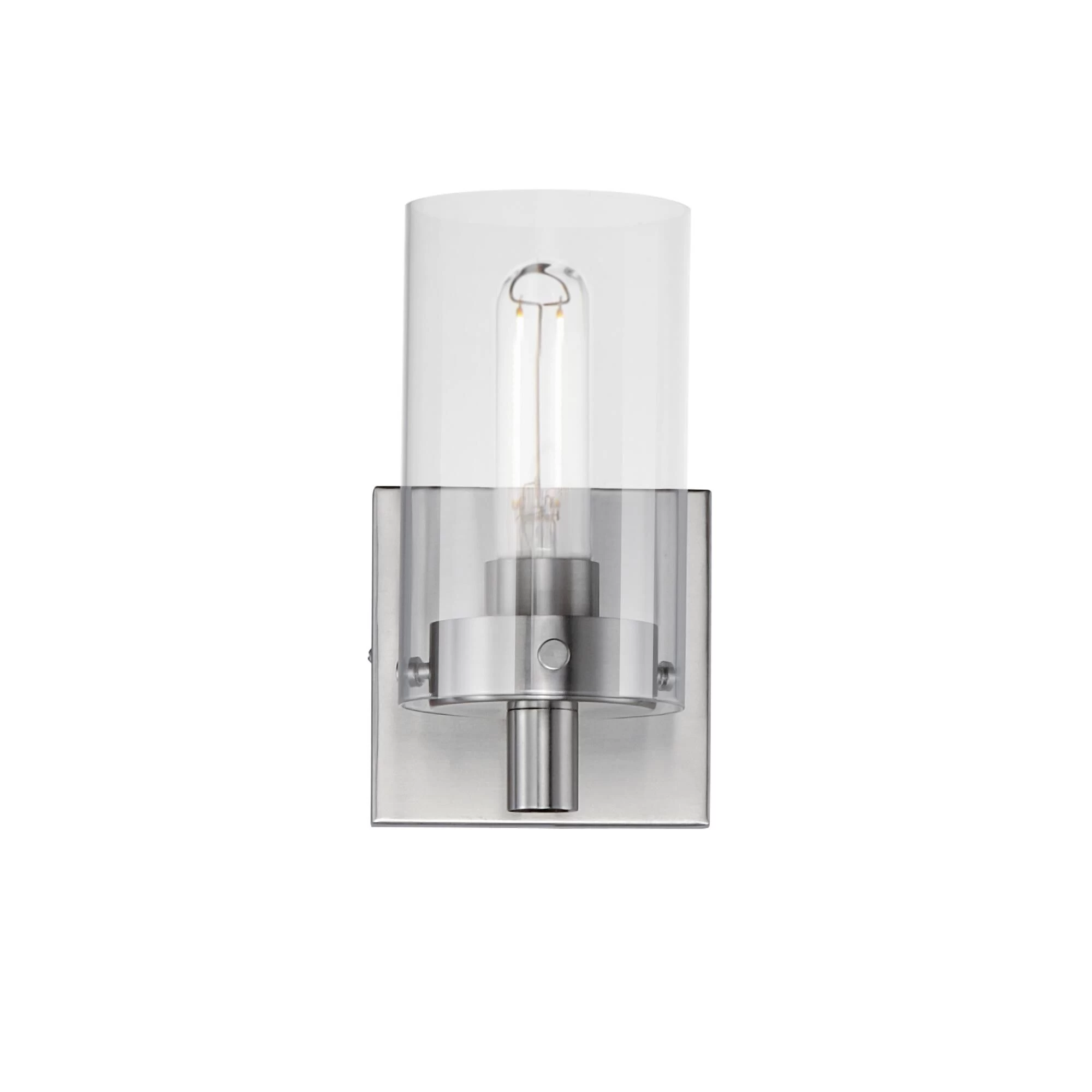Simple clear glass cylinders are secured by decorative thumb screws in this transitional collection of sconces and pendants both neutral in design and suitable for damp applications. Choose from Satin Nickel or a two-tone Black and Satin Brass finish to pair with popular interior finishes in hardware, plumbing and decor.