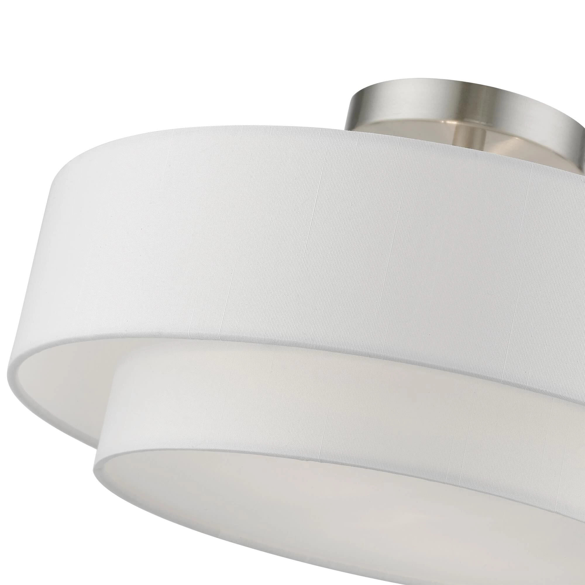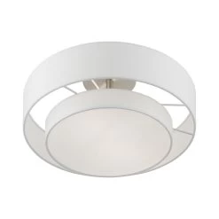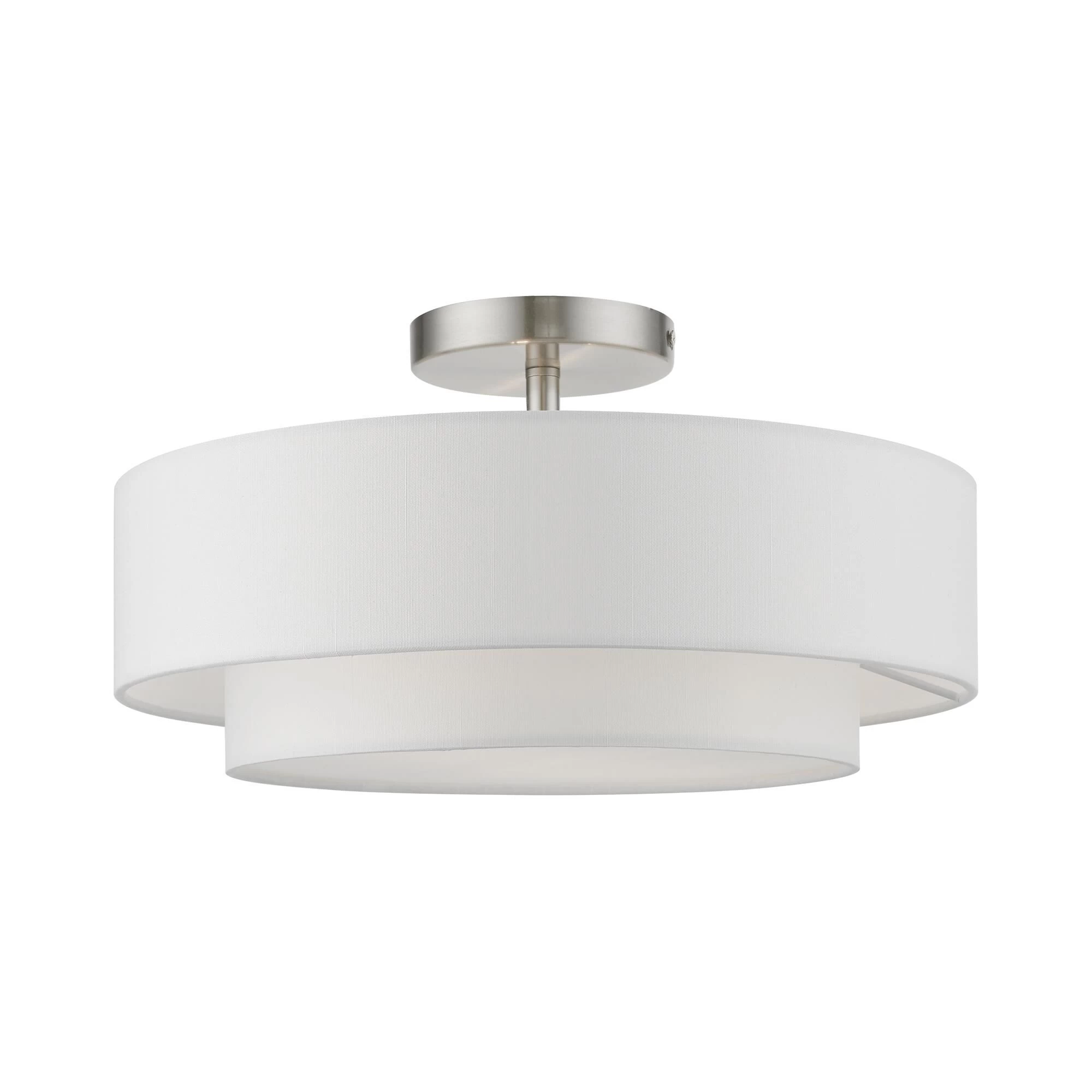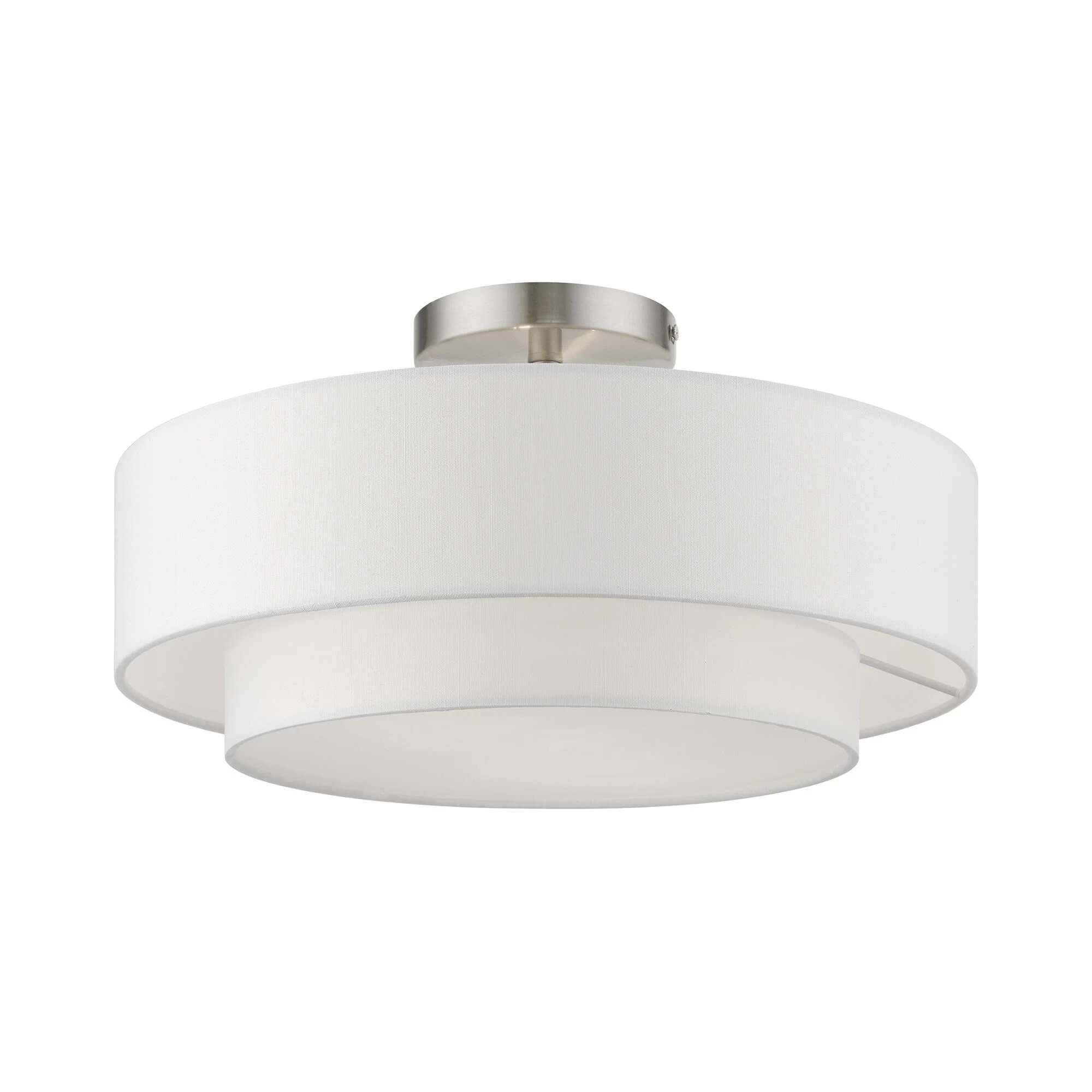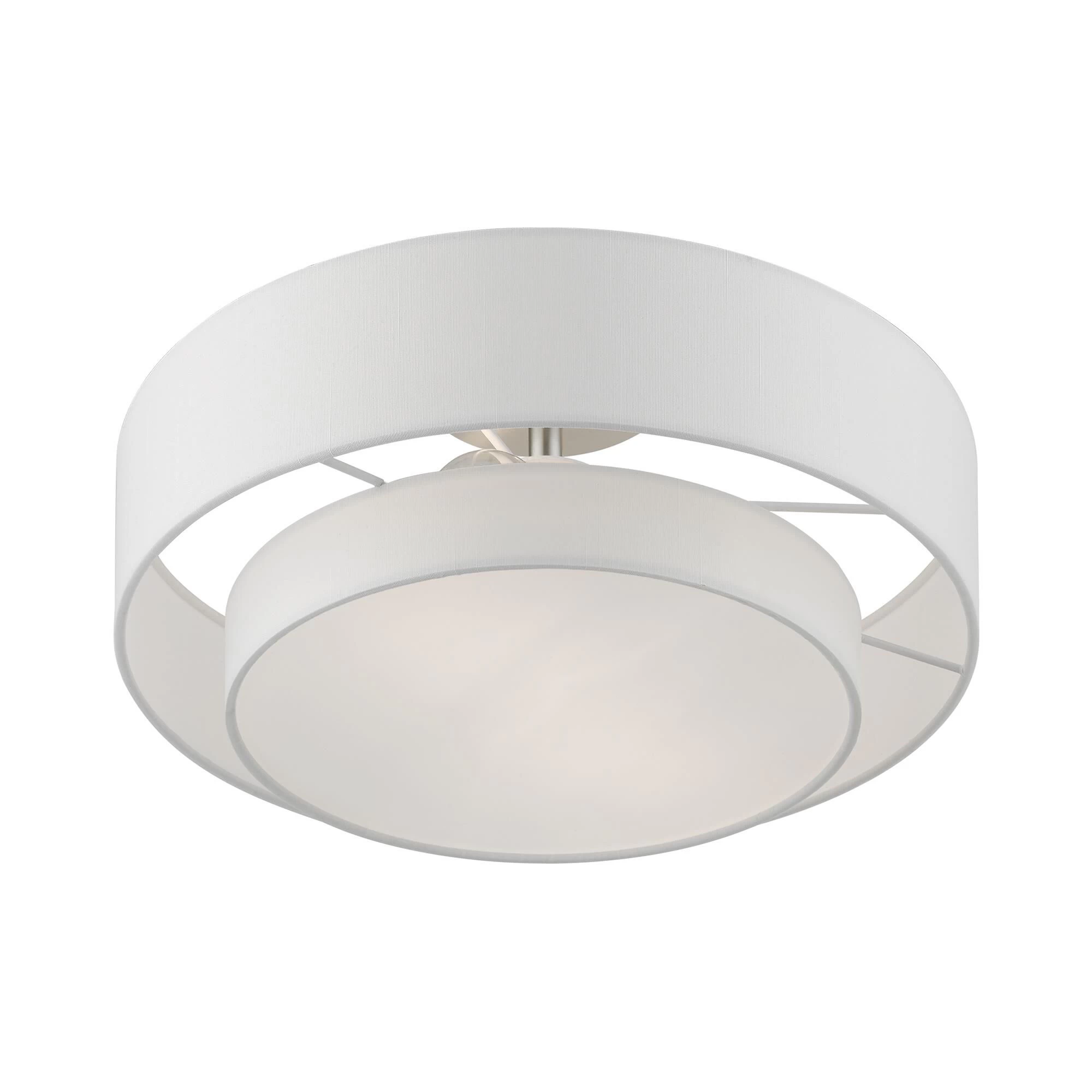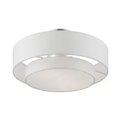 The sleek style and simple design of this Meridian semi flush mount makes it easy to use in any space. The double hand crafted off white fabric hardback fabric drum shade and bottom satin white acrylic diffuser blend for a clean look.