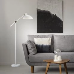 Mid-century modern takes a feminine turn with the Peggy floor lamp. The abstract oval metal shade is softened with a white finish. Antique Brass accents and a white fabric-covered cord enhance the look. The 22 balance arm adjusts the overall height from 52 to 59.5. The 10 white marble base keeps the lamp steady on the floor. A brass rotary switch on the shade turns the lamp on and off. This lamp is smart outlet compatible. Bulb is not included.