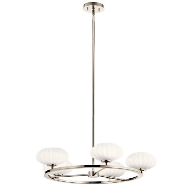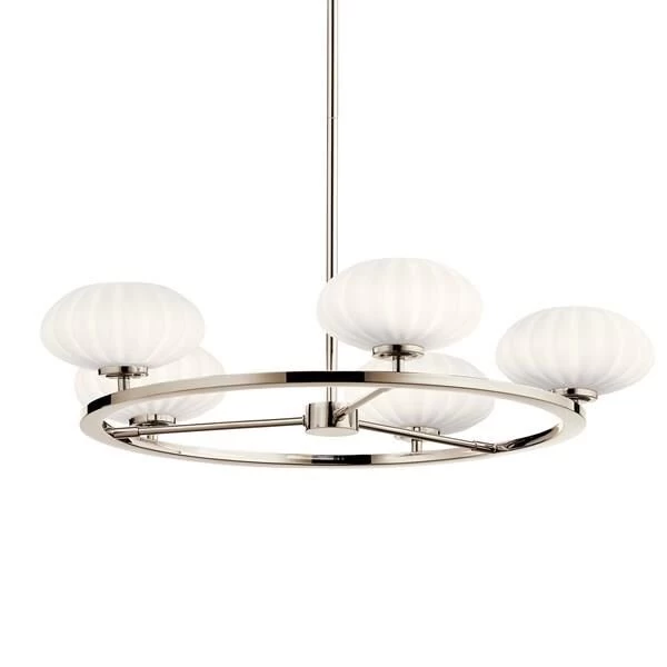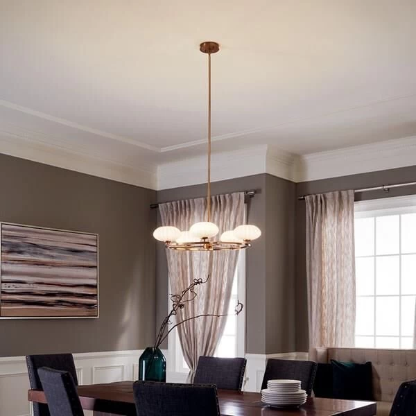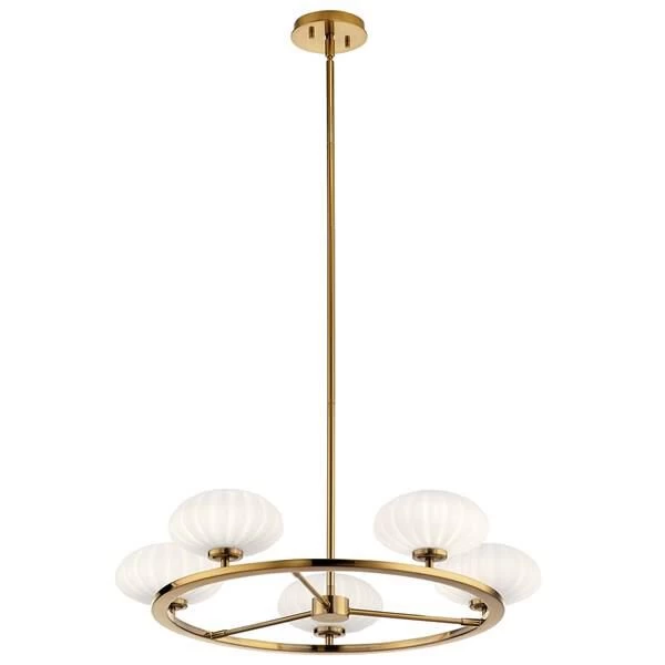 The Pim 40 inch 5 light round chandelier features a nostalgic mid century modern design in Fox Gold and rounded shaped satin etched cased opal glass. A perfect addition in several aesthetic environments including contemporary and transitional.