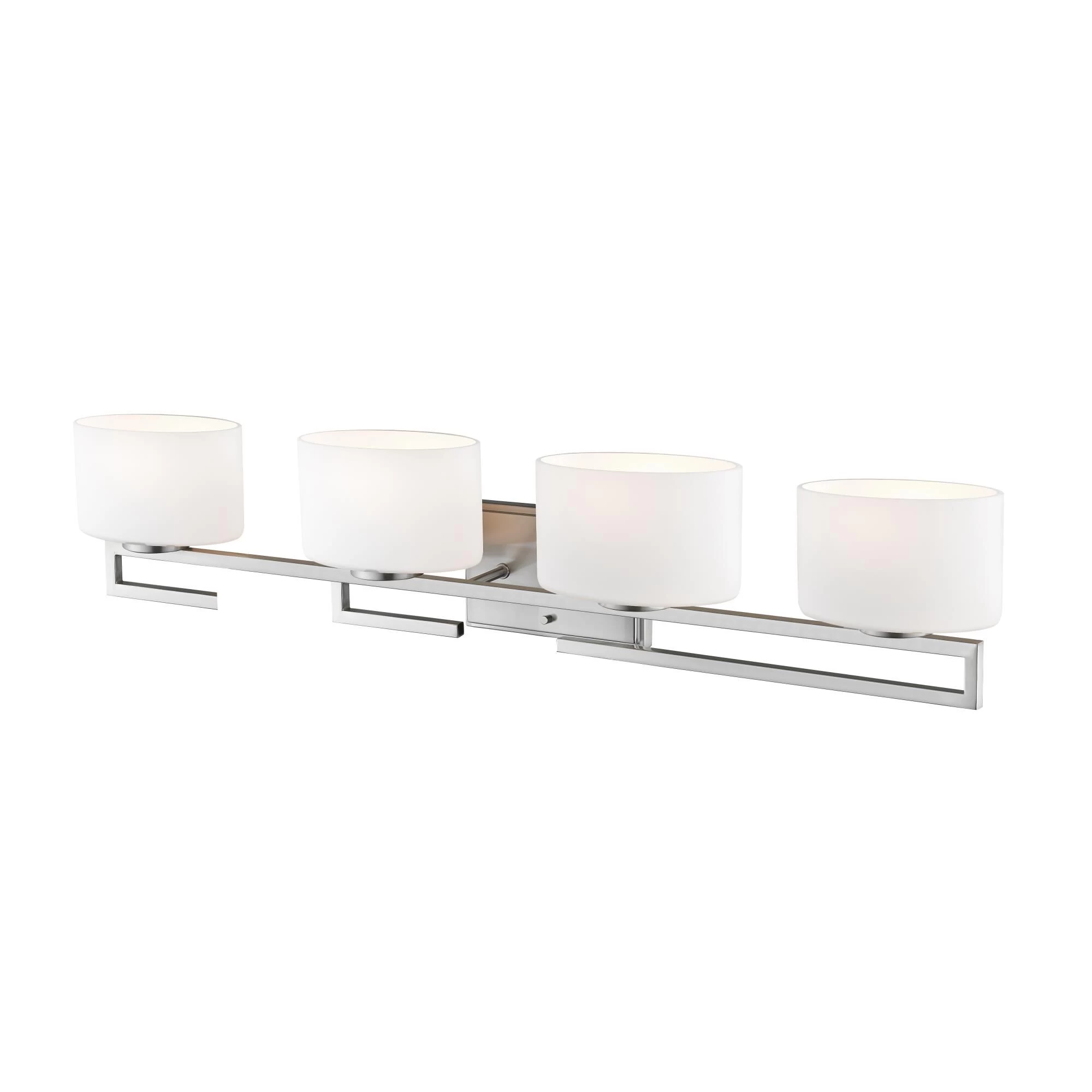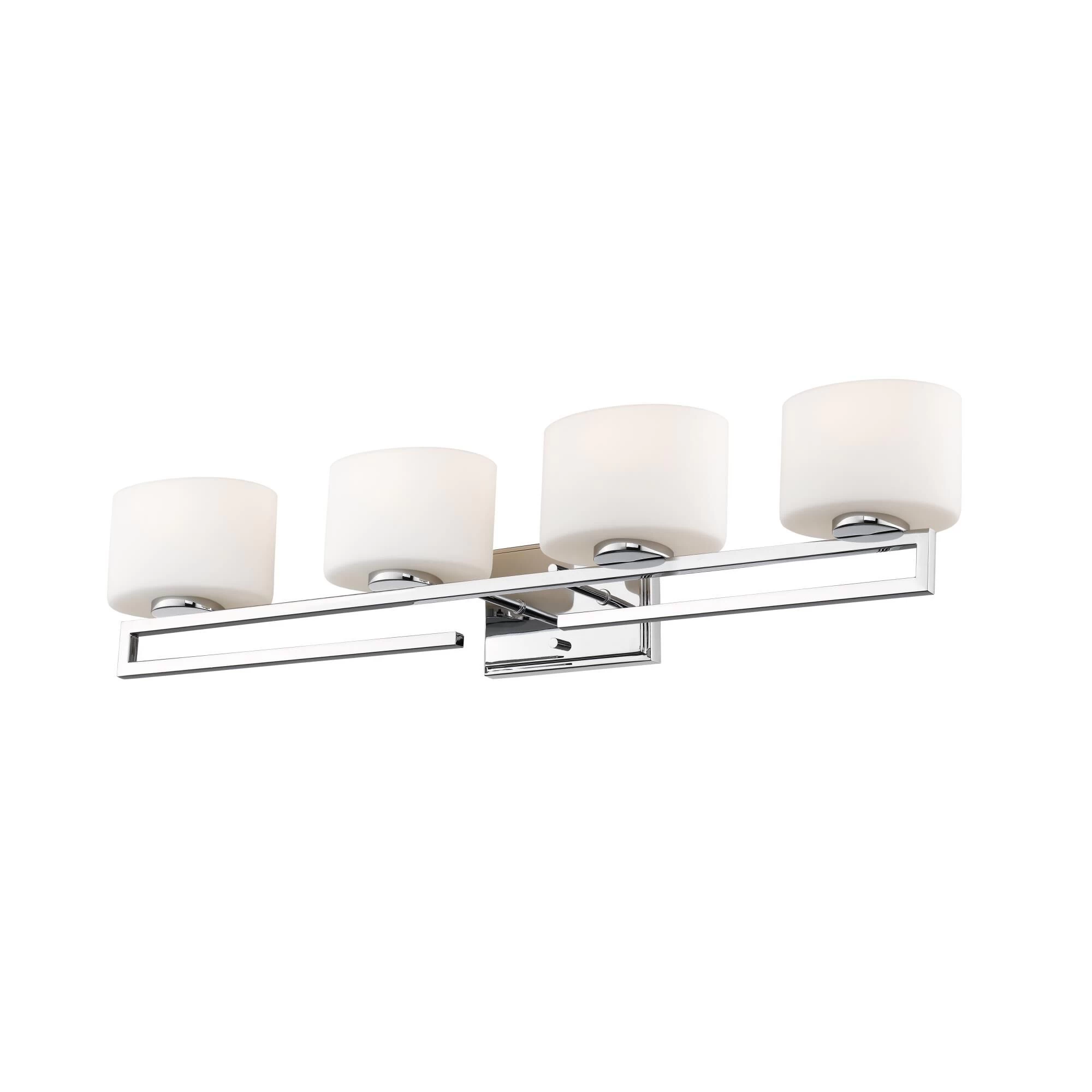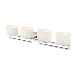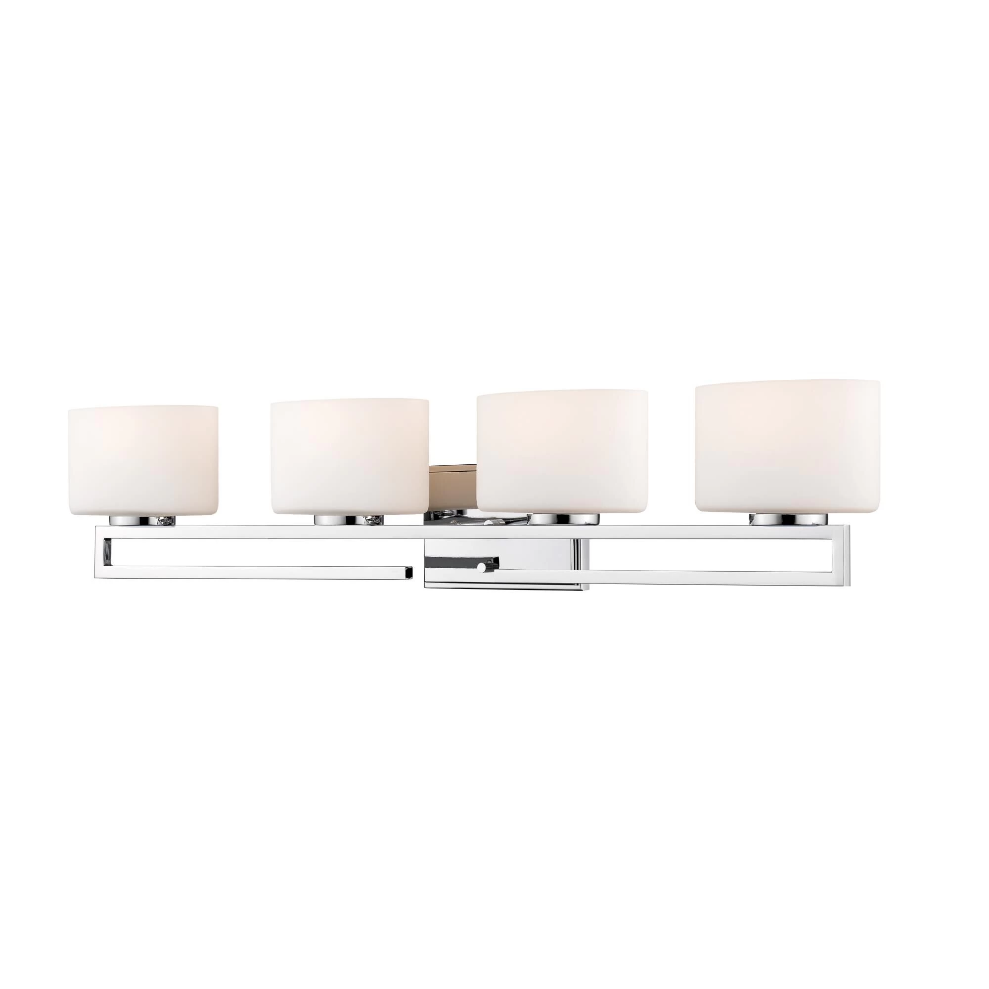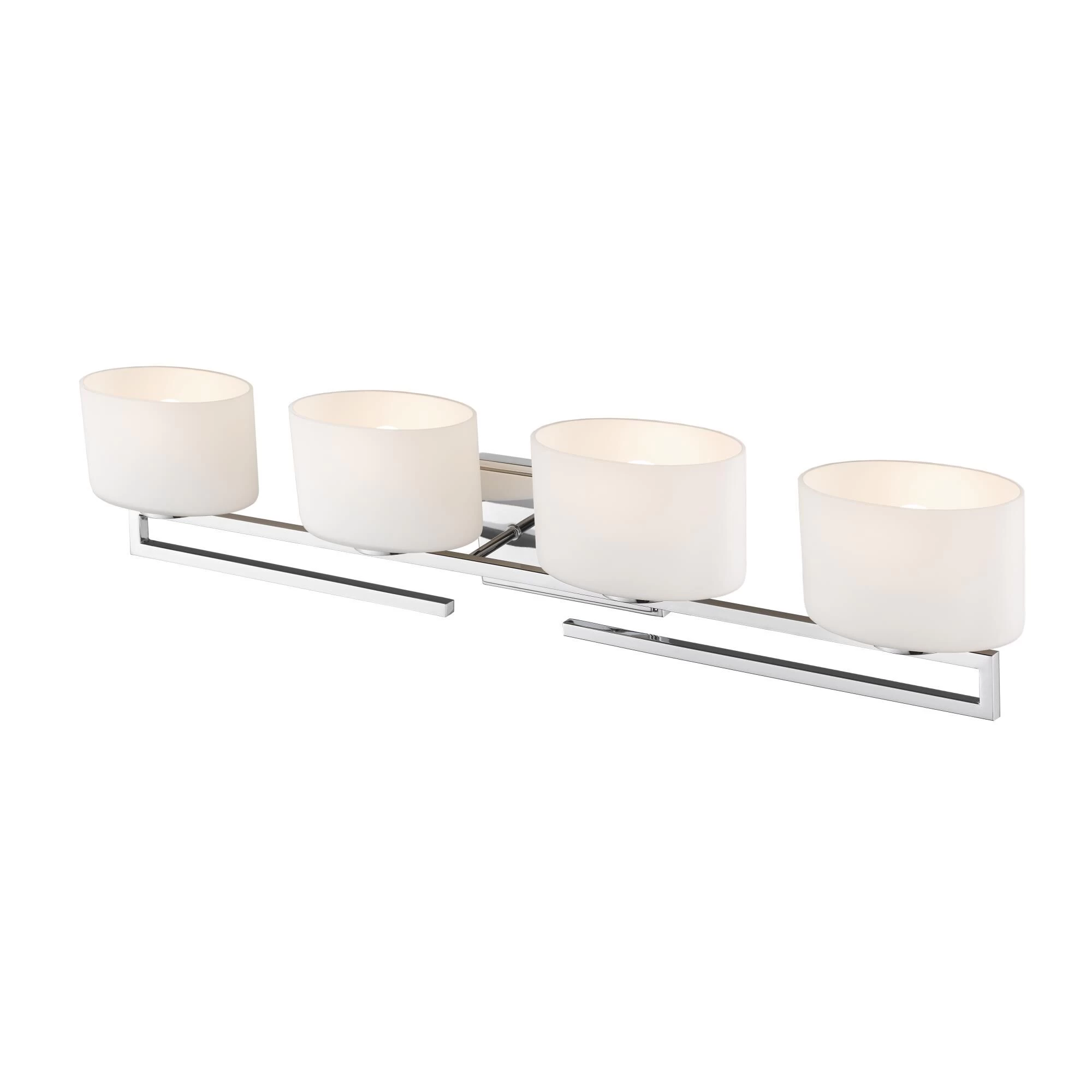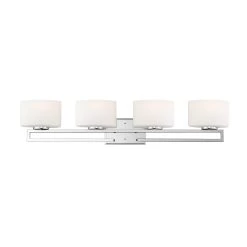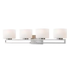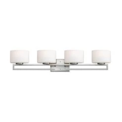 A riveting silhouette stands out in the design of this four-light vanity fixture. Gorgeous brushed nickel finish steel offers a geometric profile and backdrop that hosts rounded matte opal glass shades, delivering soft, energy-saving illumination and the convenience of dimmable lighting.