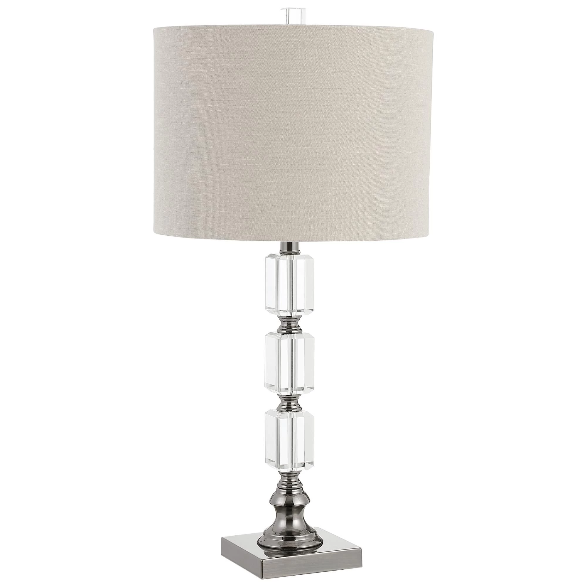 Roxy by Allure Design Elements, an elegant table lamp features stacked crystal separated by dark antique nickel accents. The round hardback shade is a light taupe linen fabric with light slubbing.