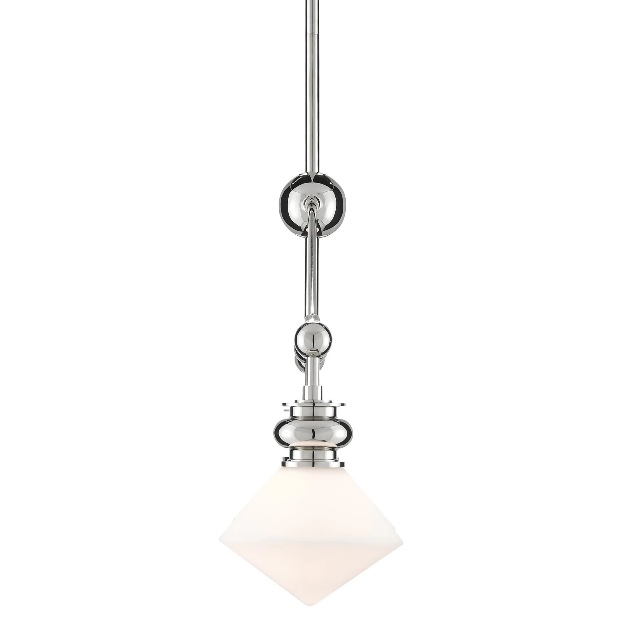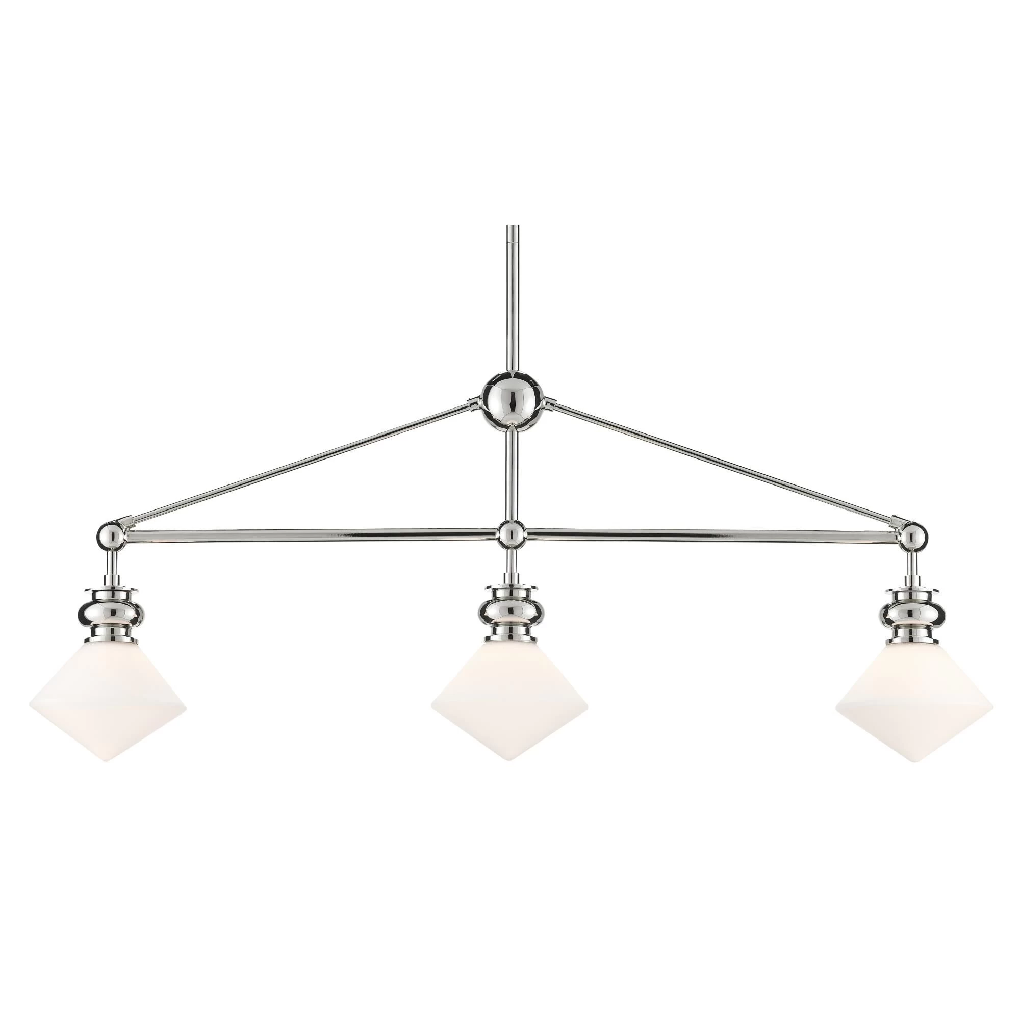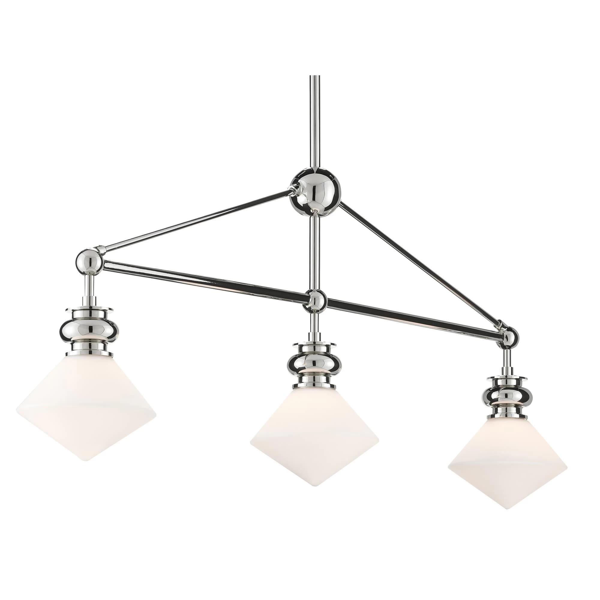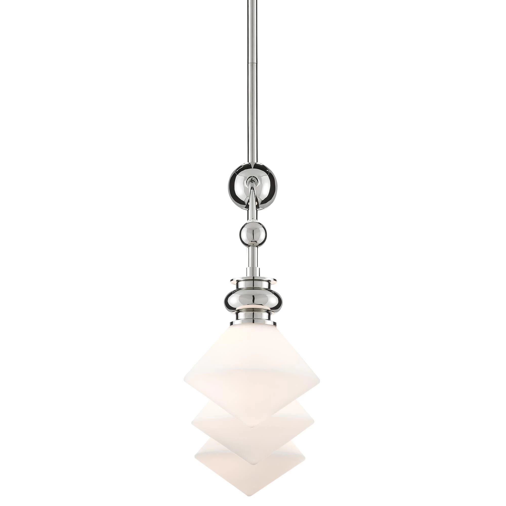Our Rycroft Rectangular Chandelier is a smart choice when a tailored design element is desired. The pointy rhombus-like shade, made of opaque glass, was inspired by a spinning top. Clarence Millari designed this silver chandelier with a polished nickel finish on the metal. We offer the Rycroft as a wall sconce, a pendant, a flush mount, and a round chandelier.