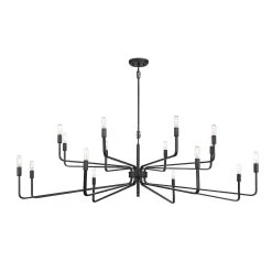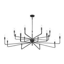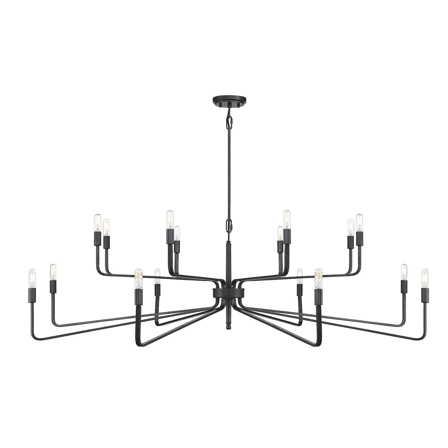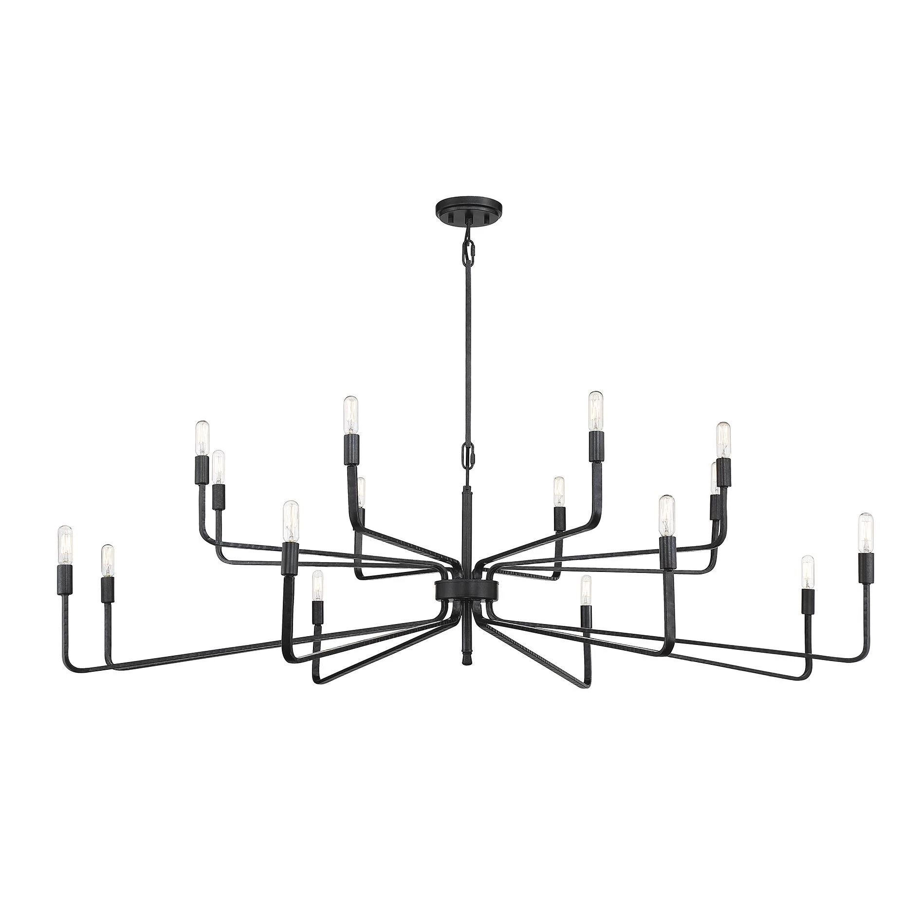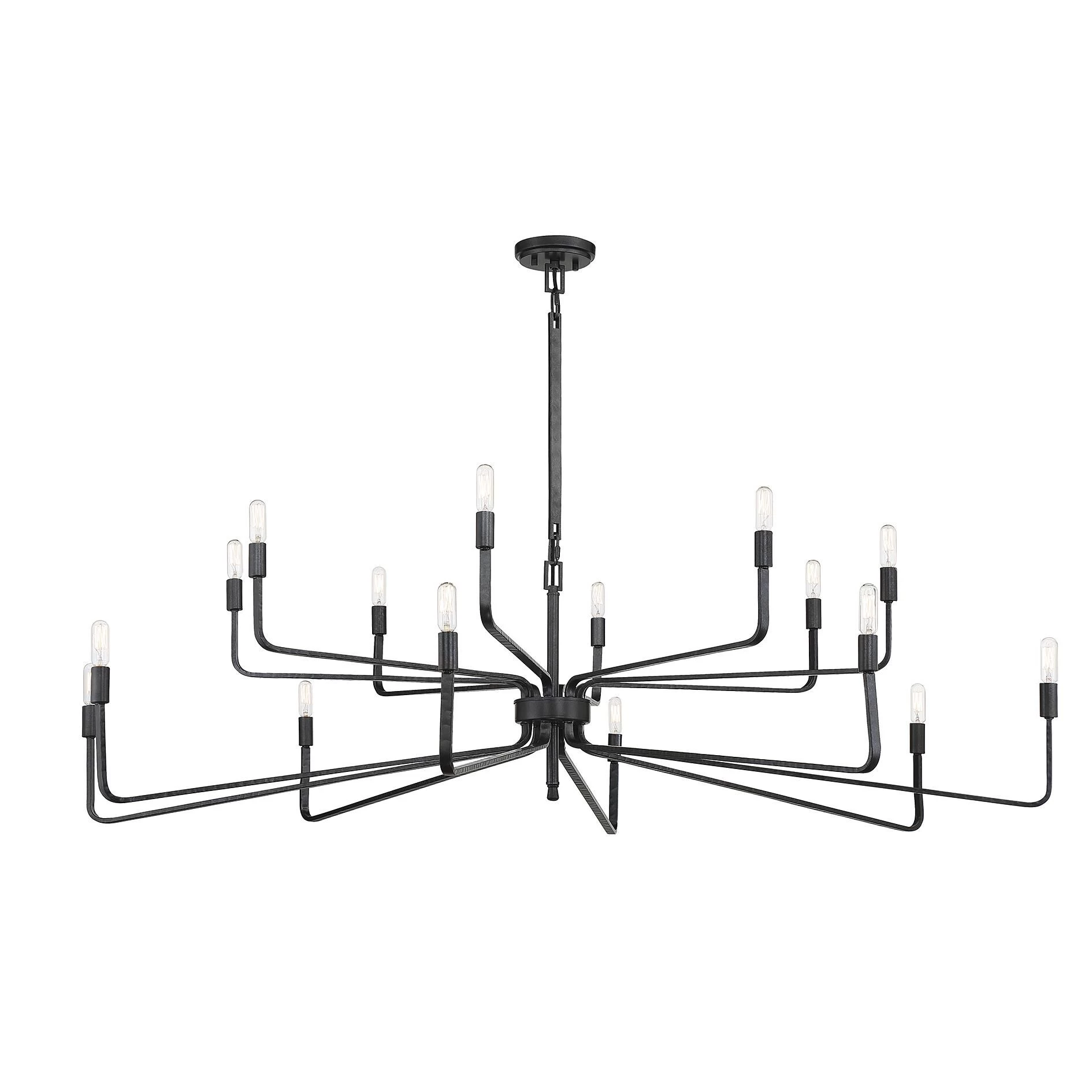 Able to illuminate a large space without looking imposing, the Salem Collection relies on clean lines to make a decorative statement with a hint of handcraftsmanship. The Forged Iron finish adds nostalgic charm to this double tier 16-light chandelier, which measures 18″ high x 57″wide and is illuminated by 16 60-watt candelabra bulbs.