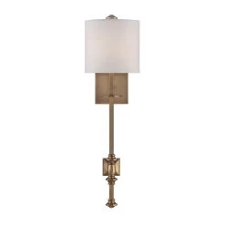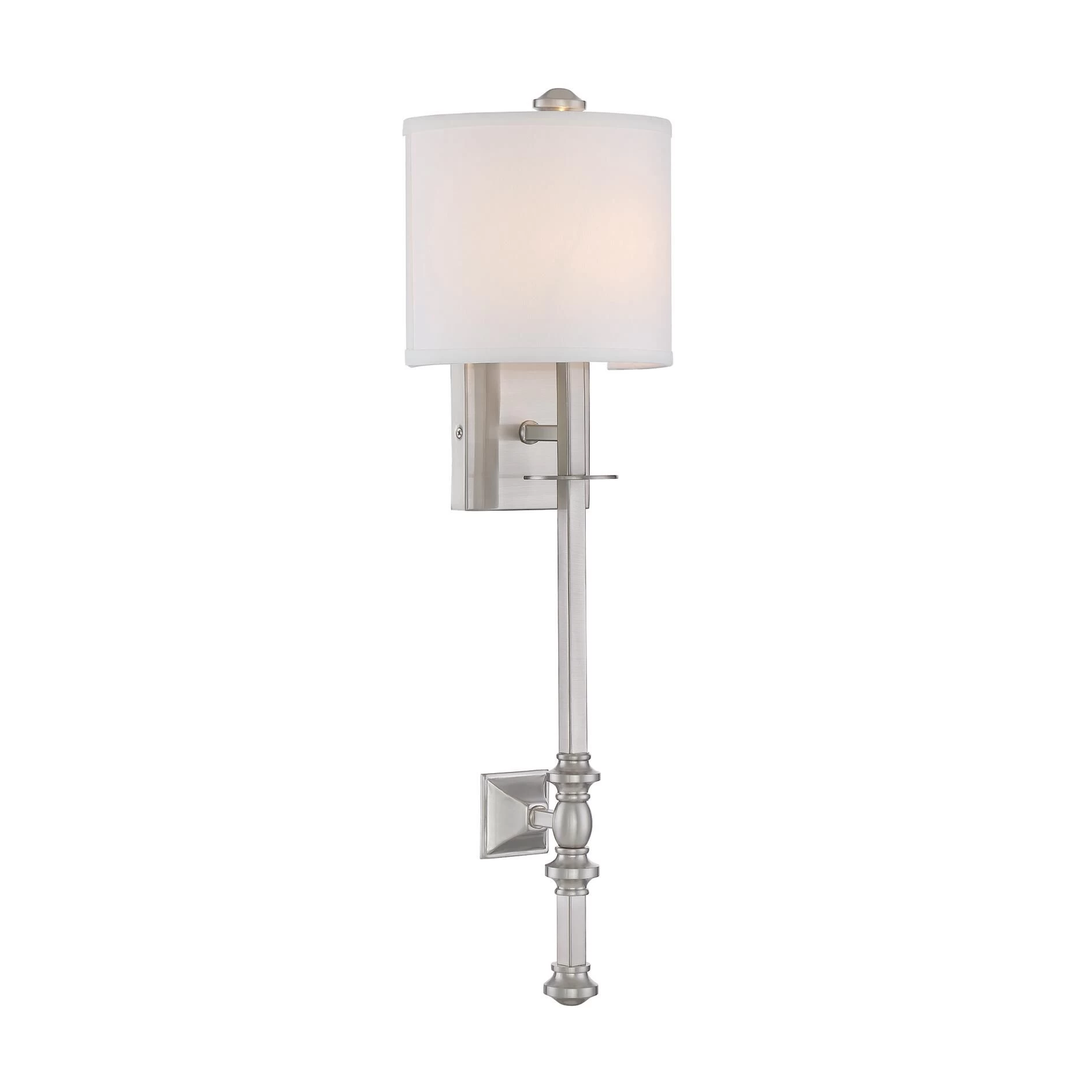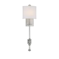 With its perfect blend of traditional and contemporary style, the Devon sconce will be right at home in your transitional decor. The clean straight lines of the light arm and square wall plate are lightly embellished with simple, attractive finial and detailing. And the satin nickel finish is both polished and inviting. A white drum-style shade is chic and fresh-looking, and the single 60W, C-style bulb provides lovely light. Overall, the Devon is a fixture with a timeless, elegant aesthetic. This sconce is 7.5 wide, 26.5 high, and extends a 5.5 from the wall. It is simple, yet sophisticated style for your dining area, living room, bedroom, great room, entryway, office, media room, or hallway.
