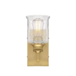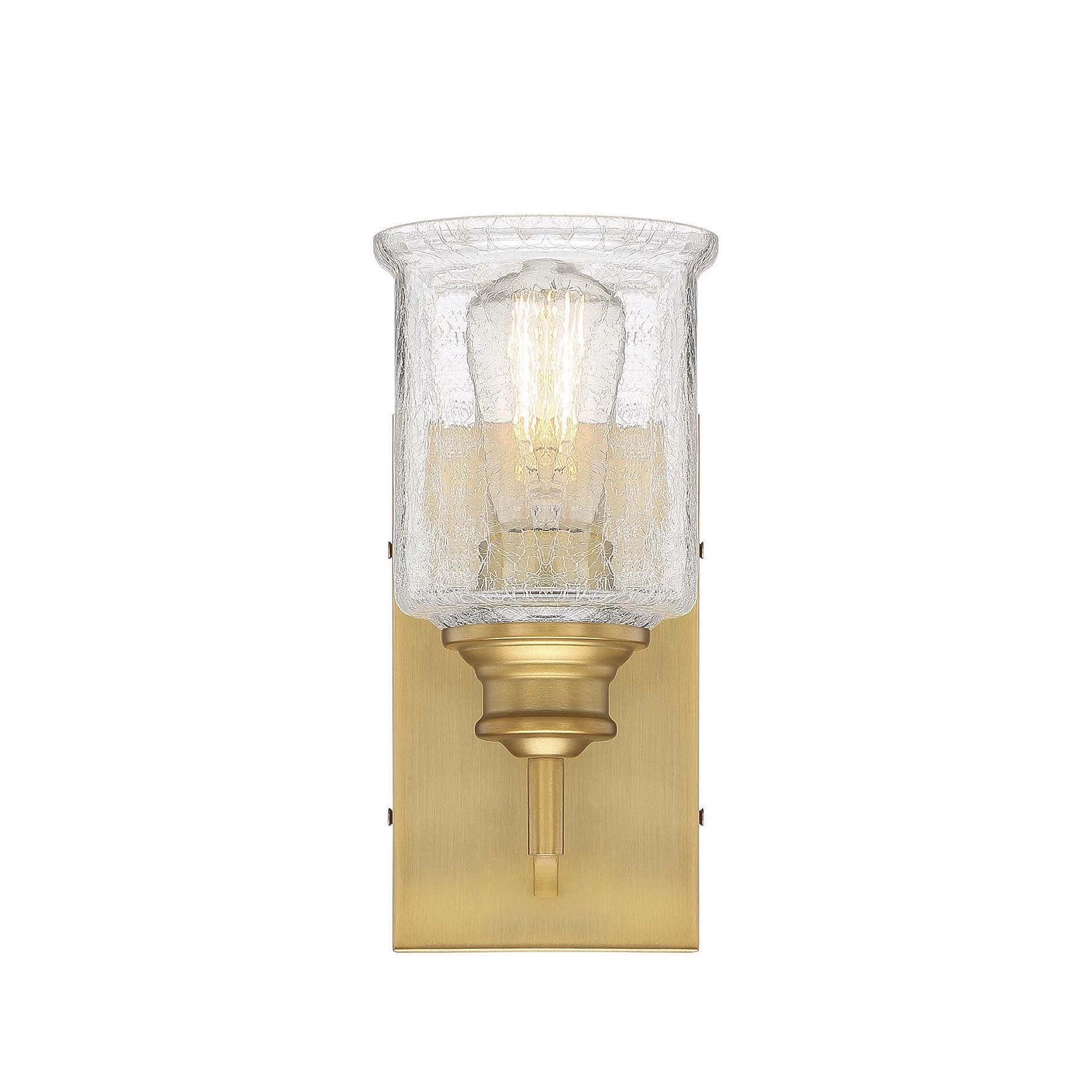 The stunning shade of thick clear crackle glass is the star of the Savoy House Hampton 1-light wall sconce. So as to let the star have center stage, the rest of the structure is kept deliberately understated. This makes it perfectly versatile for many different spaces and uses, ranging from lighting a hallway to boosting the illumination in a living room and much more. Offered in a rich warm brass finish. This fixture is 4 ” wide and 9.88″ tall. It extends 6.5″ from the wall. Uses a standard size bulb of up to 60 watts (not included).