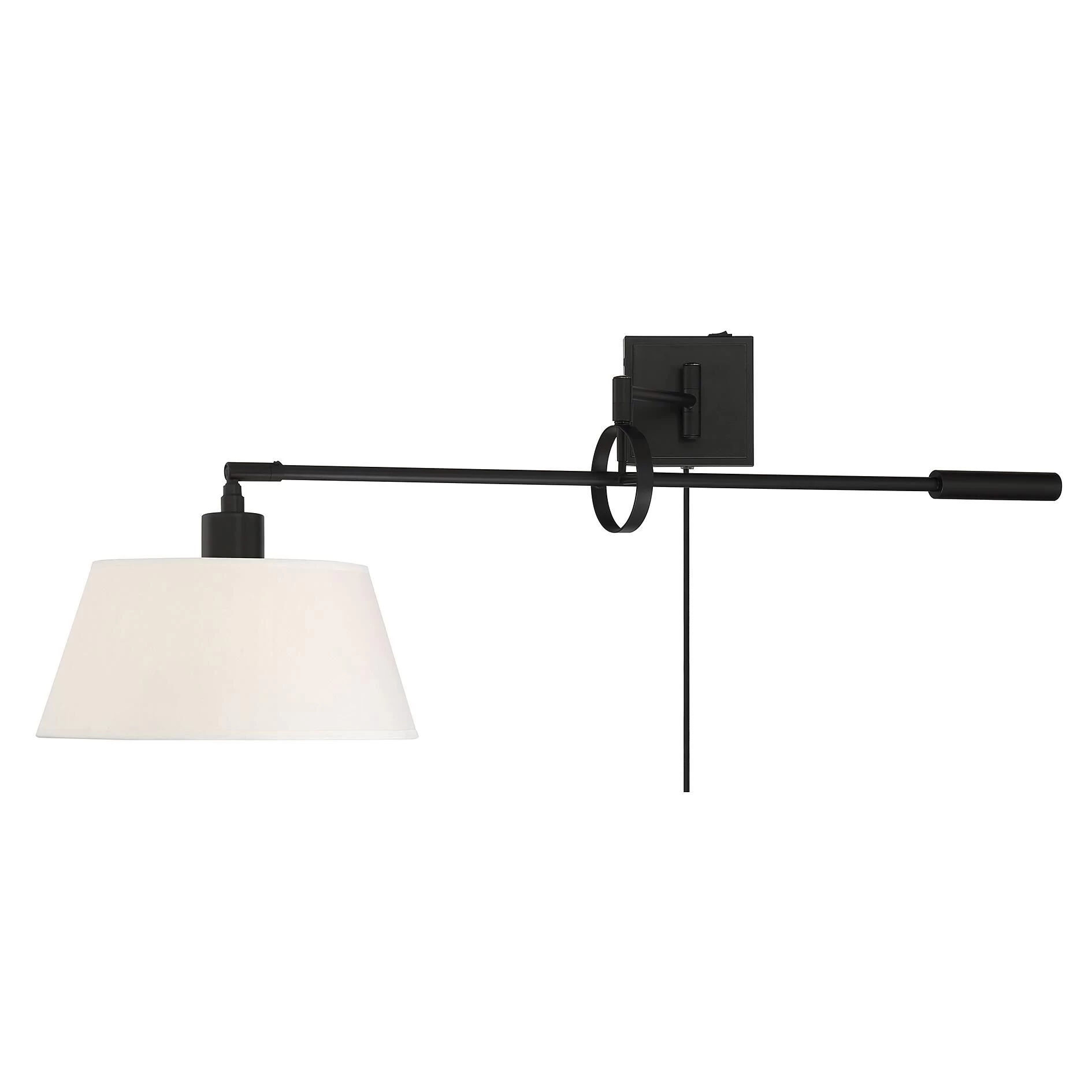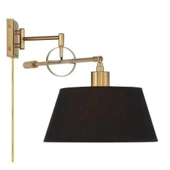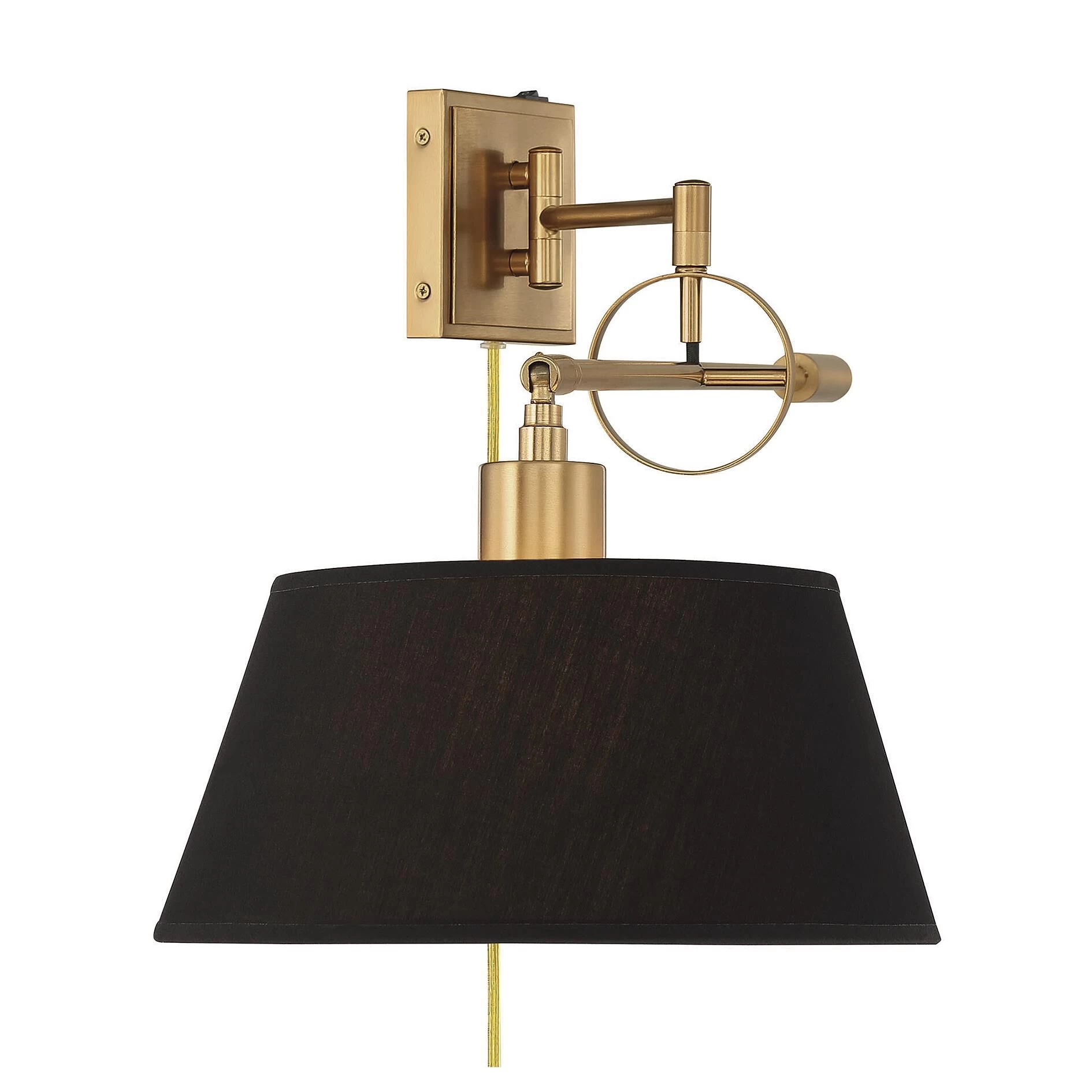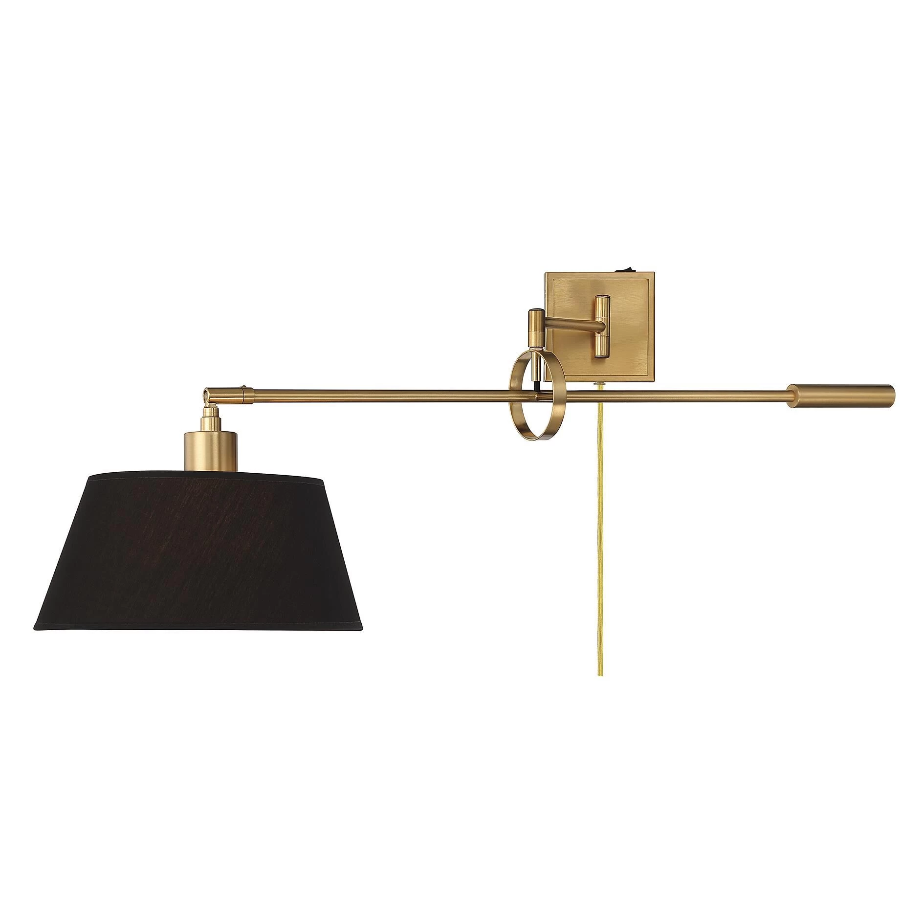 From Savoy House, this Perignon 1-light wall sconce brings a bright and convenient touch of tailored style to any room. It’s adjustable, so it can go where the light is needed most, and can even be plugged in to a wall socket by using the included cord and plug. Pairing the black fabric shade with the warm brass finish creates a classic look. Perignon is 13″ in height, 36″ in width and extends 13.5″ from the wall. It uses one standard size bulb of up to 60 watts. Damp area rated.