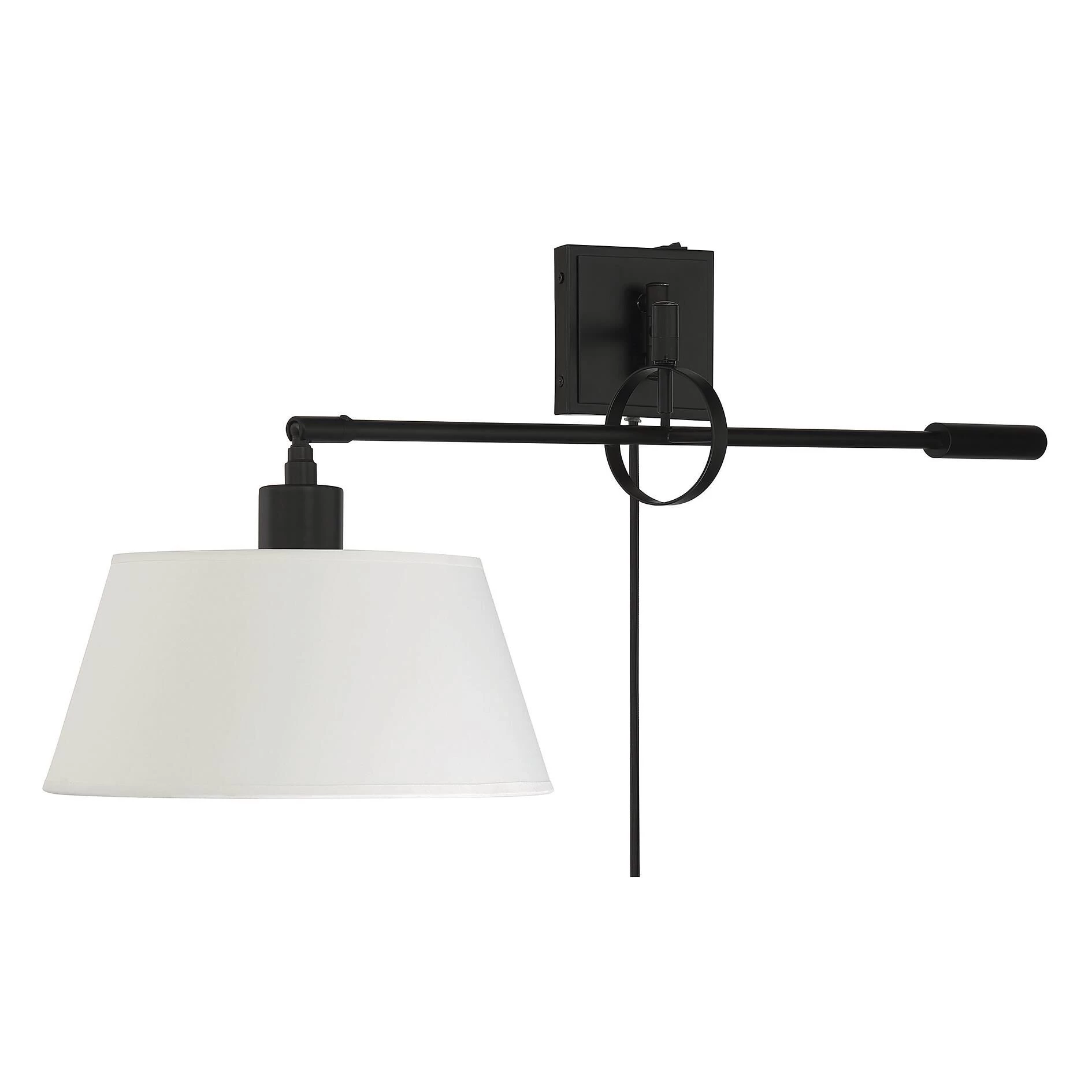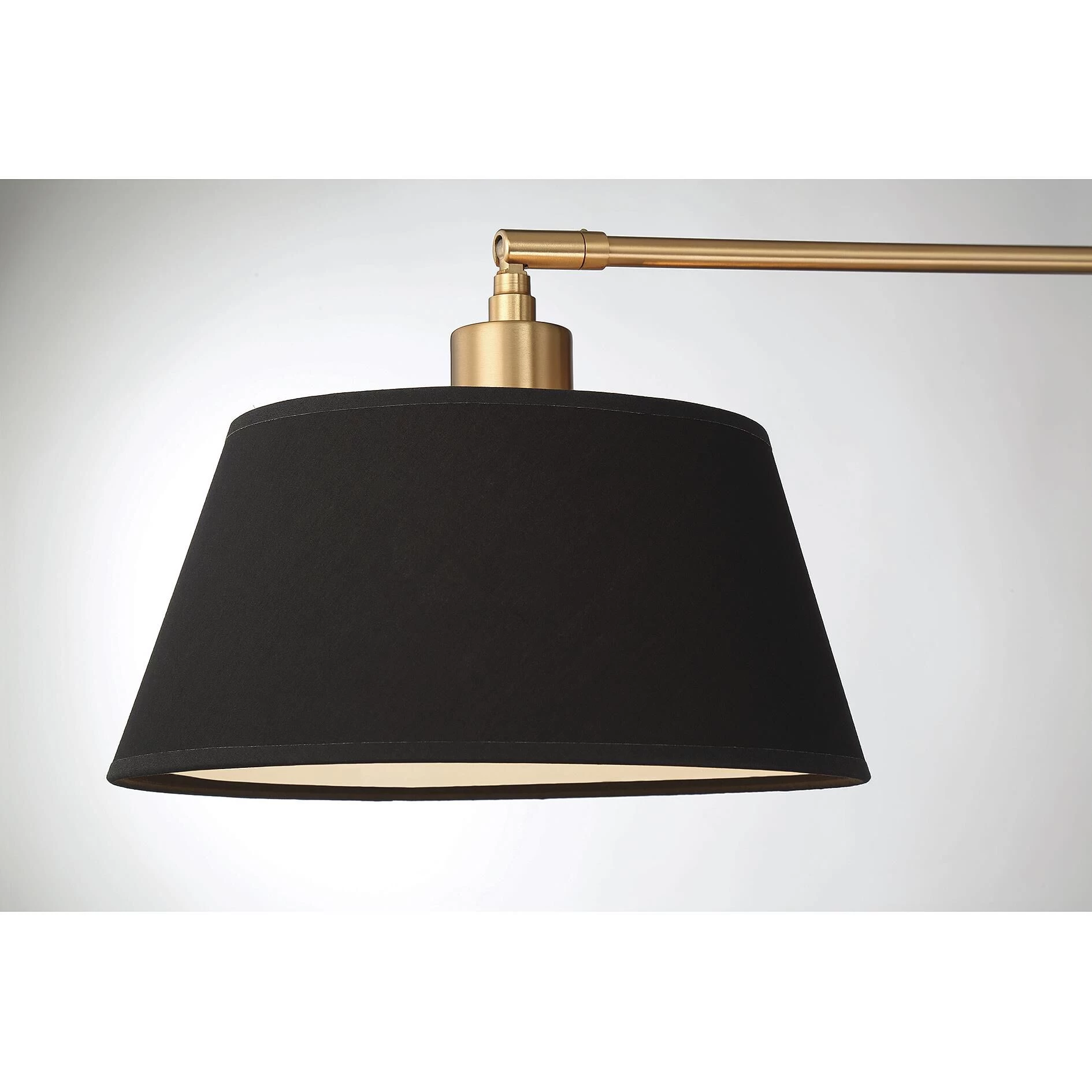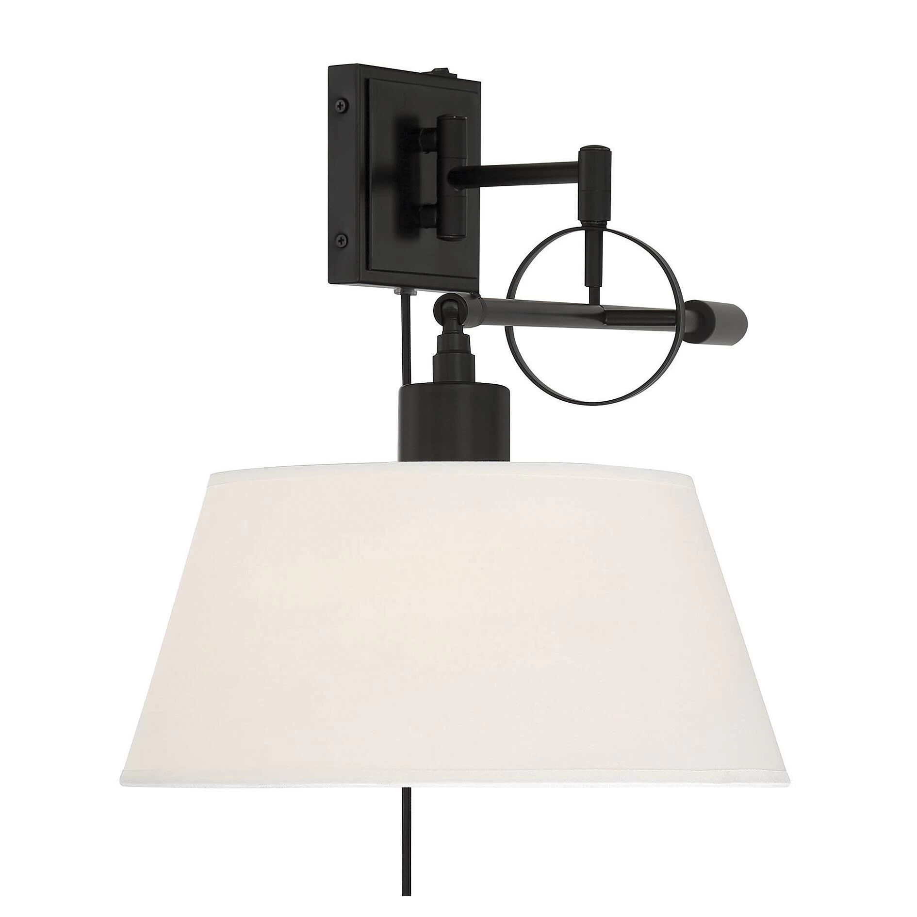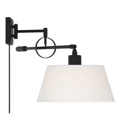 From Savoy House, this Perignon 1-light wall sconce brings a bright and convenient touch of tailored style to any room. It’s adjustable, so it can go where the light is needed most, and can even be plugged in to a wall socket by using the included cord and plug. Pairing the black fabric shade with the warm brass finish creates a classic look. Perignon is 13″ in height, 36″ in width and extends 13.5″ from the wall. It uses one standard size bulb of up to 60 watts. Damp area rated.