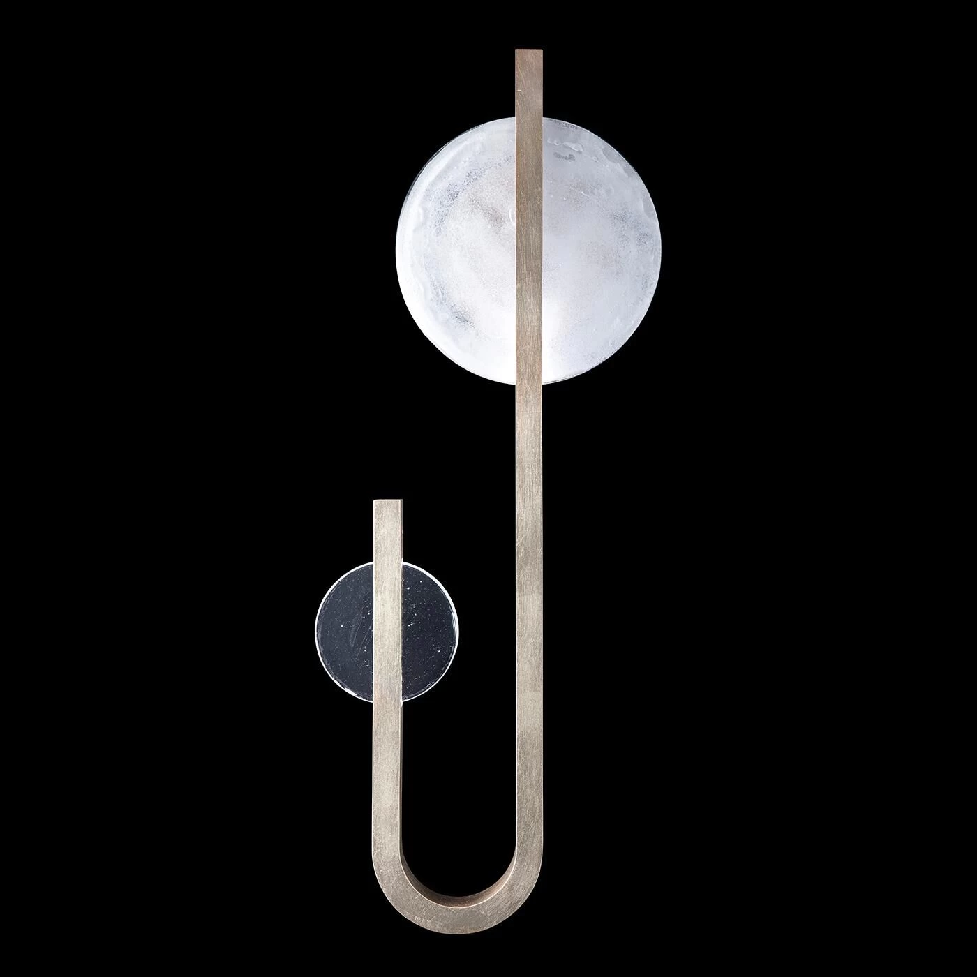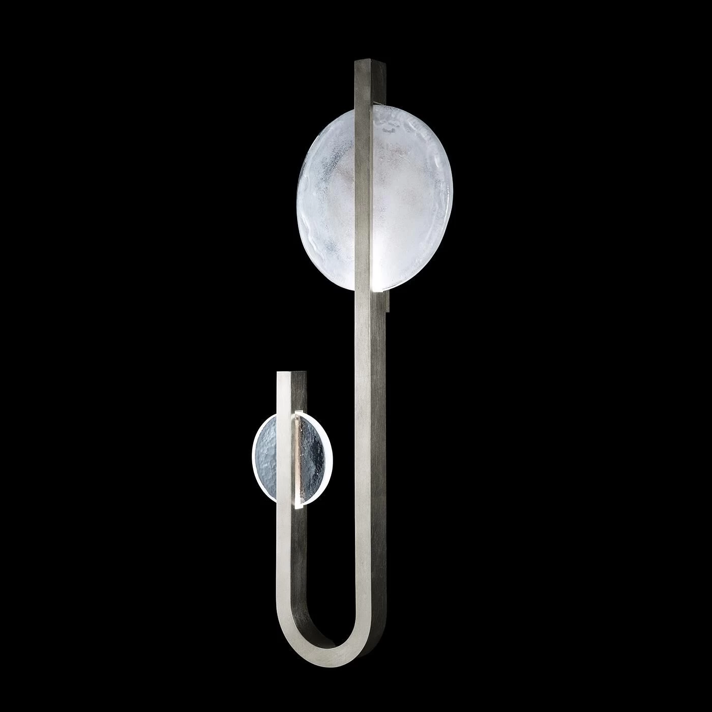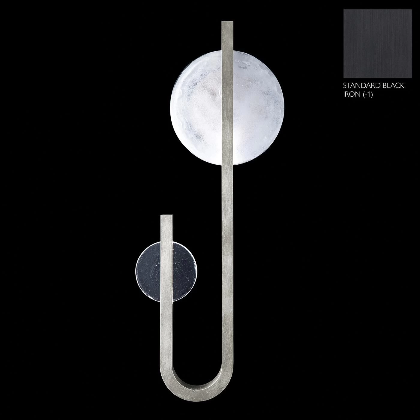 Sculptural right side facing linear sconce inspired by the Greek goddess of the moon, Selene. Features illuminated hand cast glass in Full Moon white and New Moon Clear. Available in Standard Finishes, Black Iron, Gold Leaf, Silver Leaf and Soft Gold Leaf.